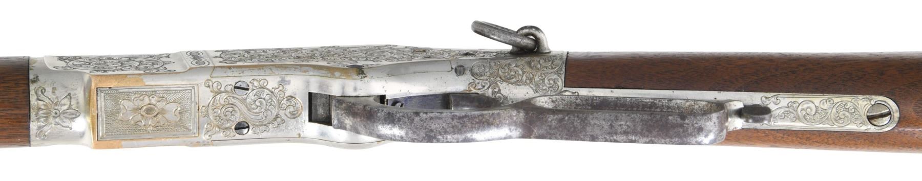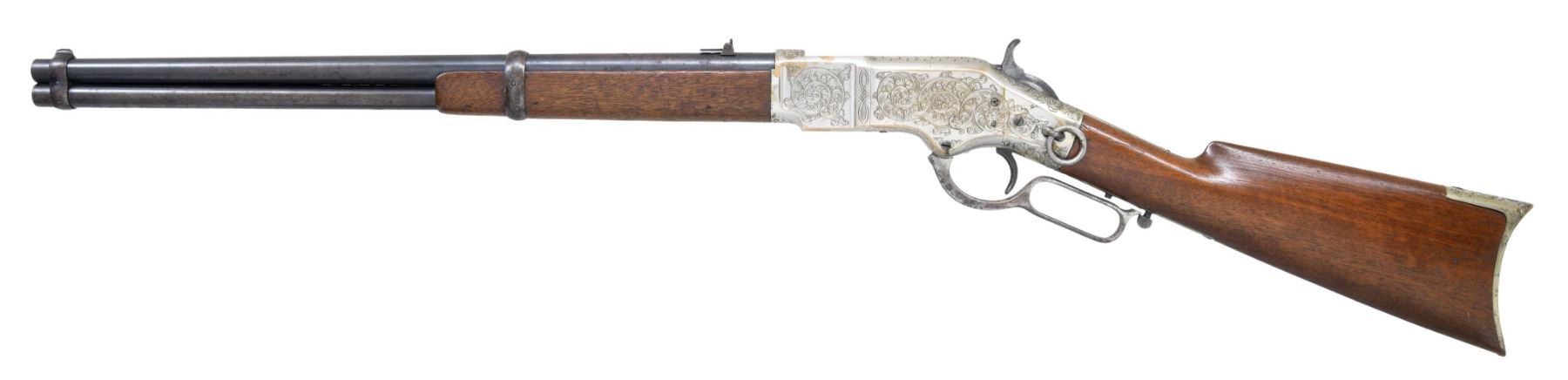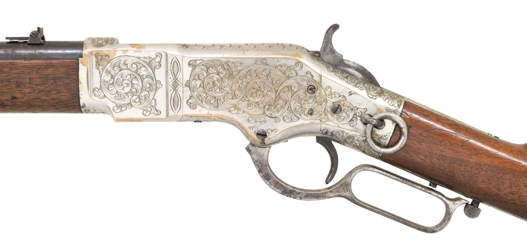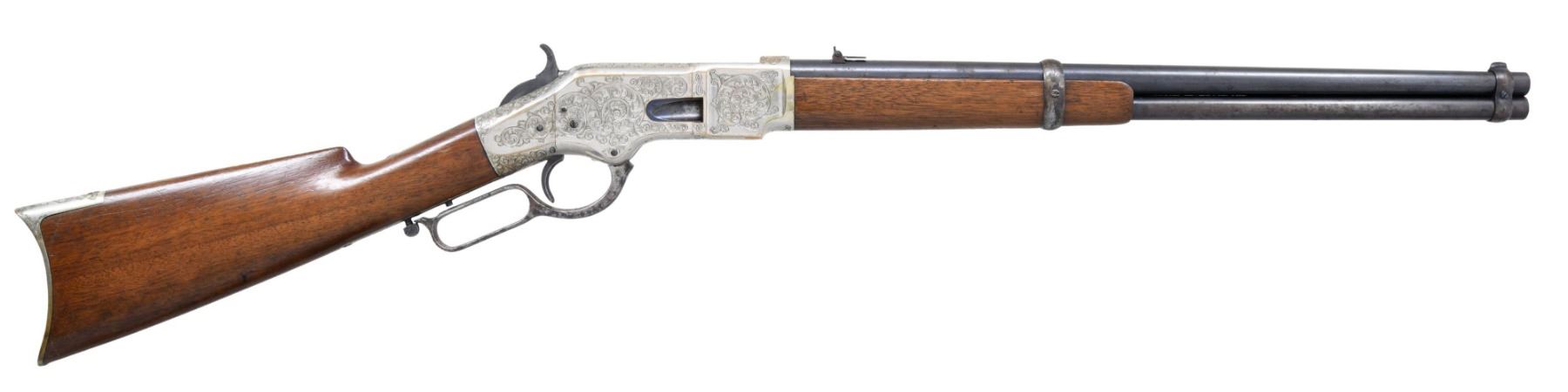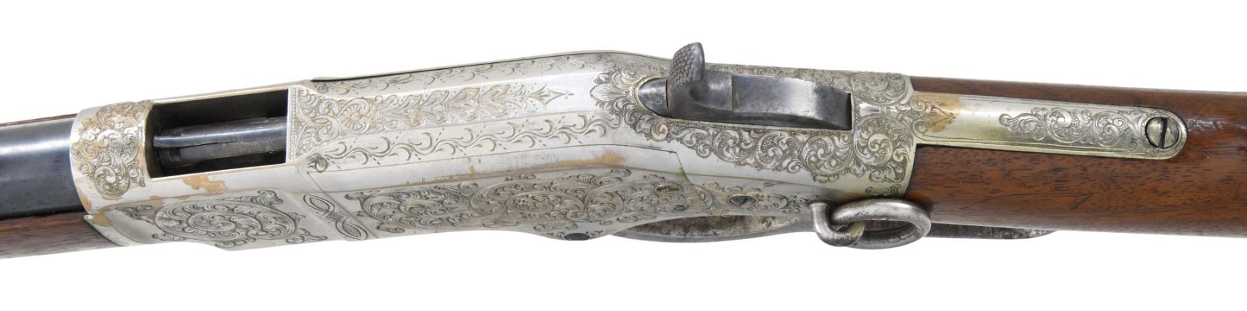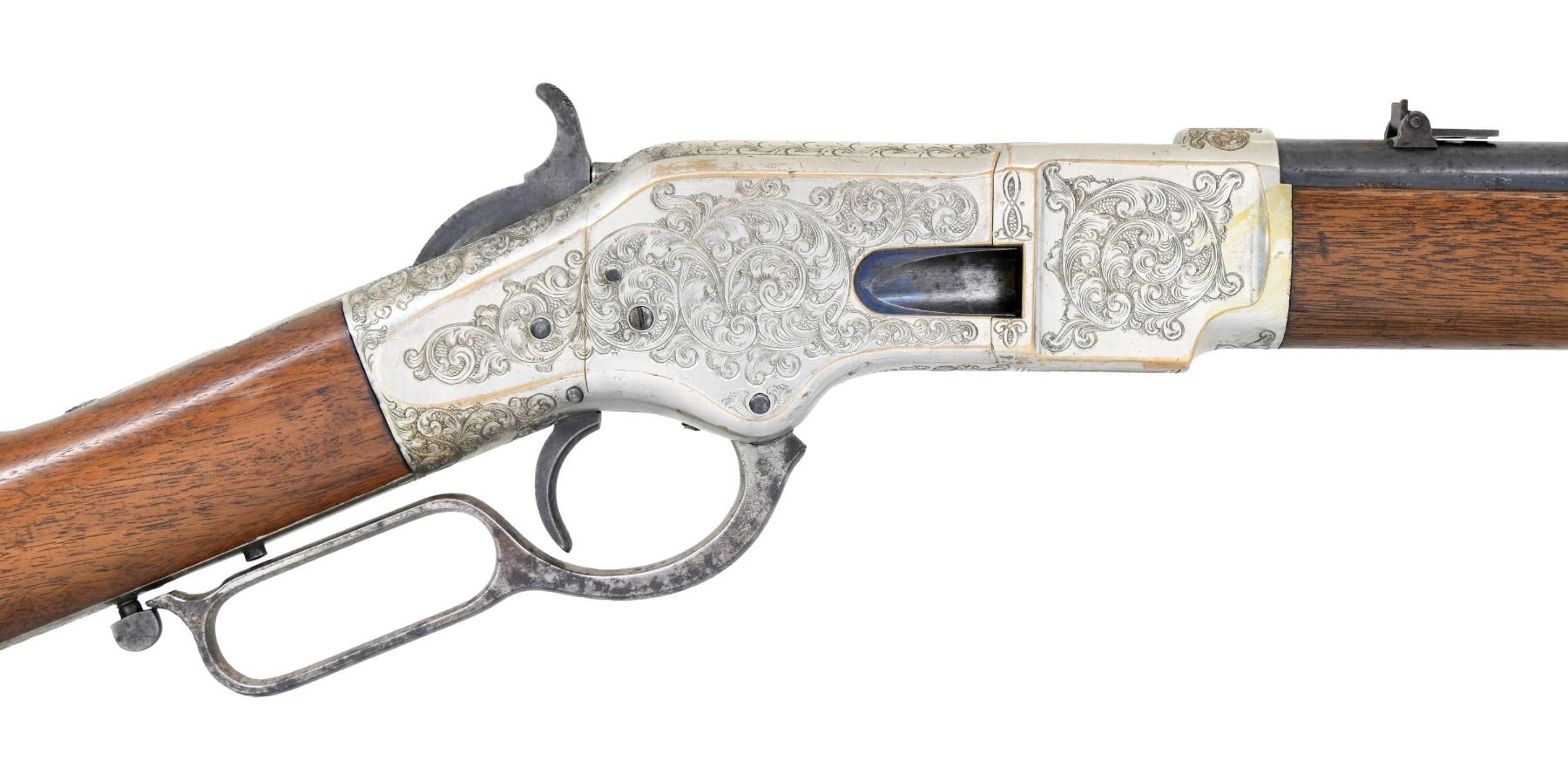 WINCHESTER MODEL 1866 CARBINE. Cal. 44. S# 46843B. This is an elegant and very fine condition 66 carbine manufactured in 1871 beautifully engraved and silver plated. This classic engraving style of Louis D. Nimschke is found on Henry rifles and 1866 rifles & carbines, often signed. Stylistic elements of Nimschke are shown in several texts and little doubt this was made in his shop. Standard configuration, 20" blued barrel with 2-line "King's Improvement" address, 2-leaf rear sight, integral pinched front sight on front barrel band. Mounted on select straight grain varnished walnut. Serial number 46843 found lower tang, and last four digits of number found inside butt plate and top channel of buttstock. Stock is also stamped "VII" in lower channel, "C" is stamped on lower tang under stock. UNATTACHED ACCESSORIES: old collection tag stating purchase at Louisville February 21, 2004. Several pages copied from the Winchester Engraving book and Nimschke's pattern book. CONDITION: fine overall, markings and engraving are all very good, frame retains about 90% original silver plate, but plate has about 60% silver, barrel three times about 80% thinning bright factory blue finish, stocks are sound with scattered storage dings and dents. Mechanically fine, bright rifled bore. (01-26424/JS). ANTIQUE. $20,000-30,000.