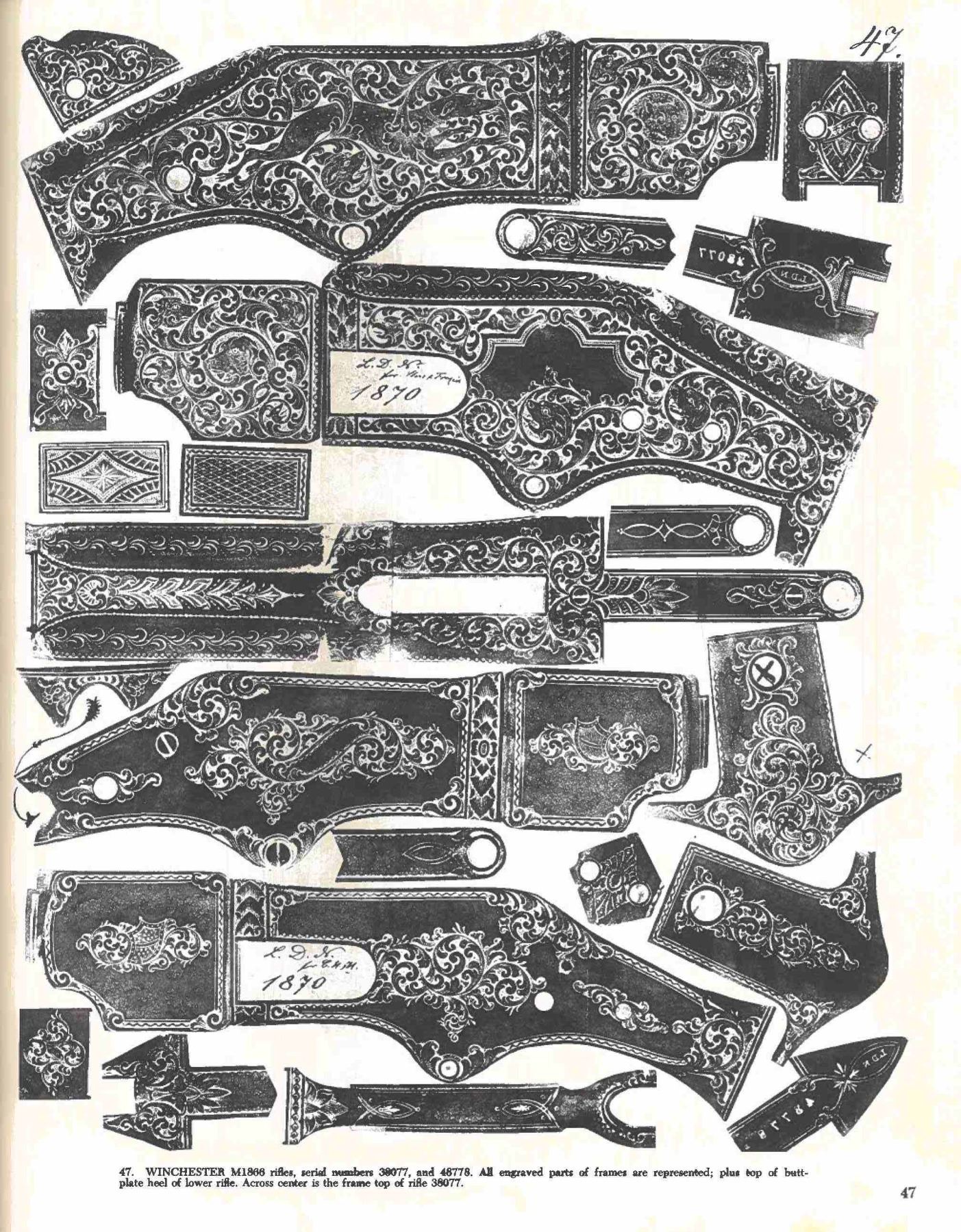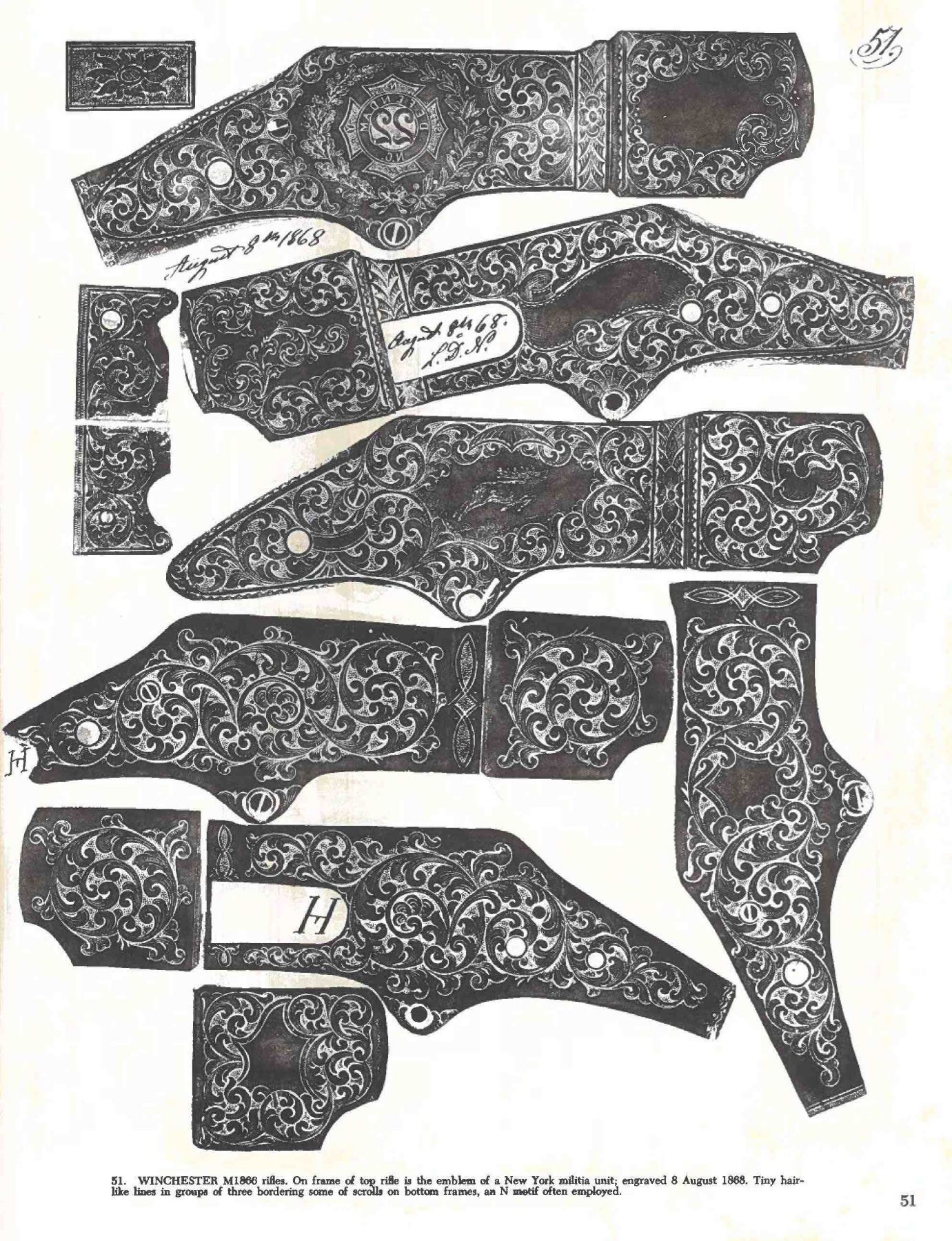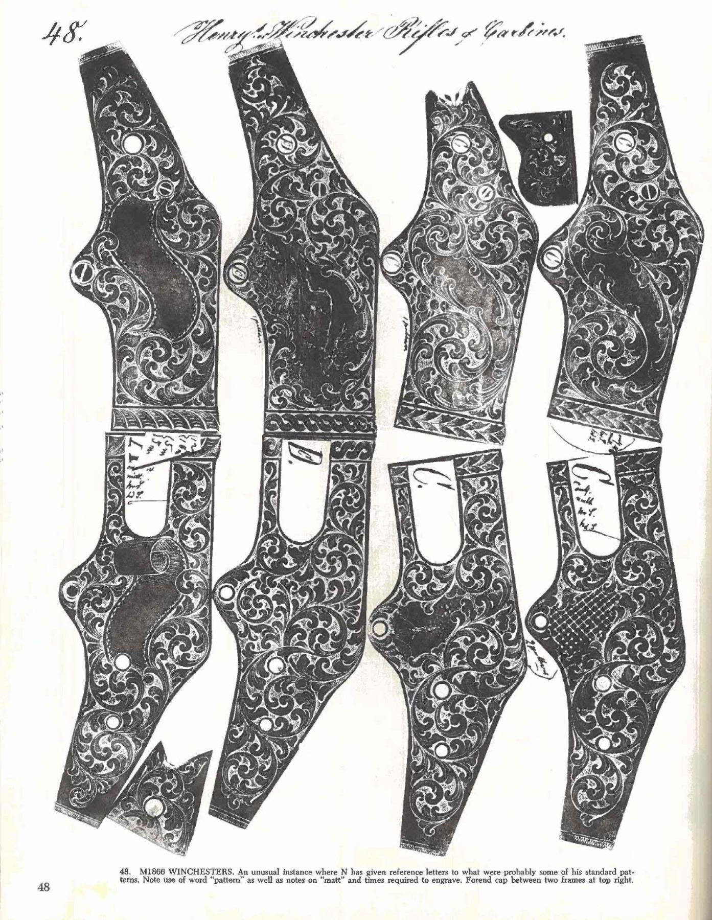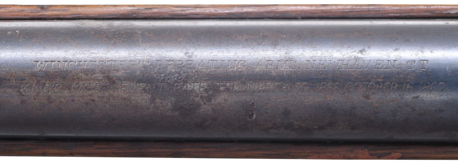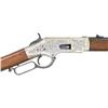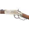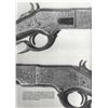 WINCHESTER MODEL 1866 CARBINE. Cal. 44. S# 46843B. This is an elegant and very fine condition 66 carbine manufactured in 1871 beautifully engraved and silver plated. This classic engraving style of Louis D. Nimschke is found on Henry rifles and 1866 rifles & carbines, often signed. Stylistic elements of Nimschke are shown in several texts and little doubt this was made in his shop. Standard configuration, 20" blued barrel with 2-line "King's Improvement" address, 2-leaf rear sight, integral pinched front sight on front barrel band. Mounted on select straight grain varnished walnut. Serial number 46843 found lower tang, and last four digits of number found inside butt plate and top channel of buttstock. Stock is also stamped "VII" in lower channel, "C" is stamped on lower tang under stock. UNATTACHED ACCESSORIES: old collection tag stating purchase at Louisville February 21, 2004. Several pages copied from the Winchester Engraving book and Nimschke's pattern book. CONDITION: fine overall, markings and engraving are all very good, frame retains about 90% original silver plate, but plate has about 60% silver, barrel three times about 80% thinning bright factory blue finish, stocks are sound with scattered storage dings and dents. Mechanically fine, bright rifled bore. (01-26424/JS). ANTIQUE. $20,000-30,000.