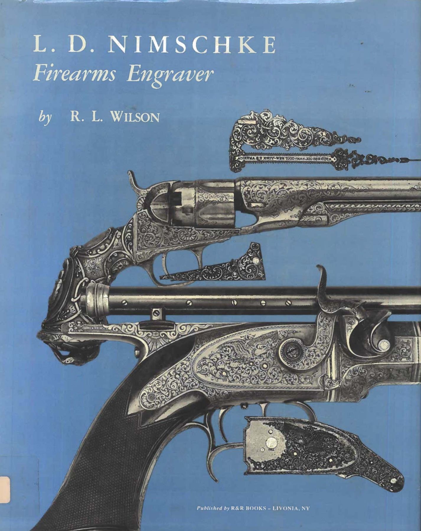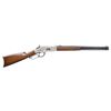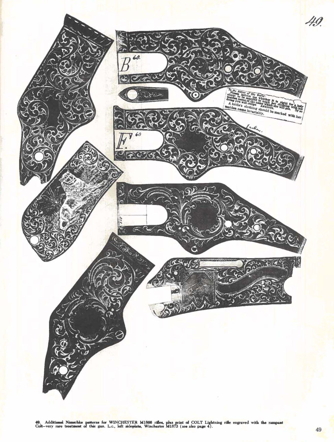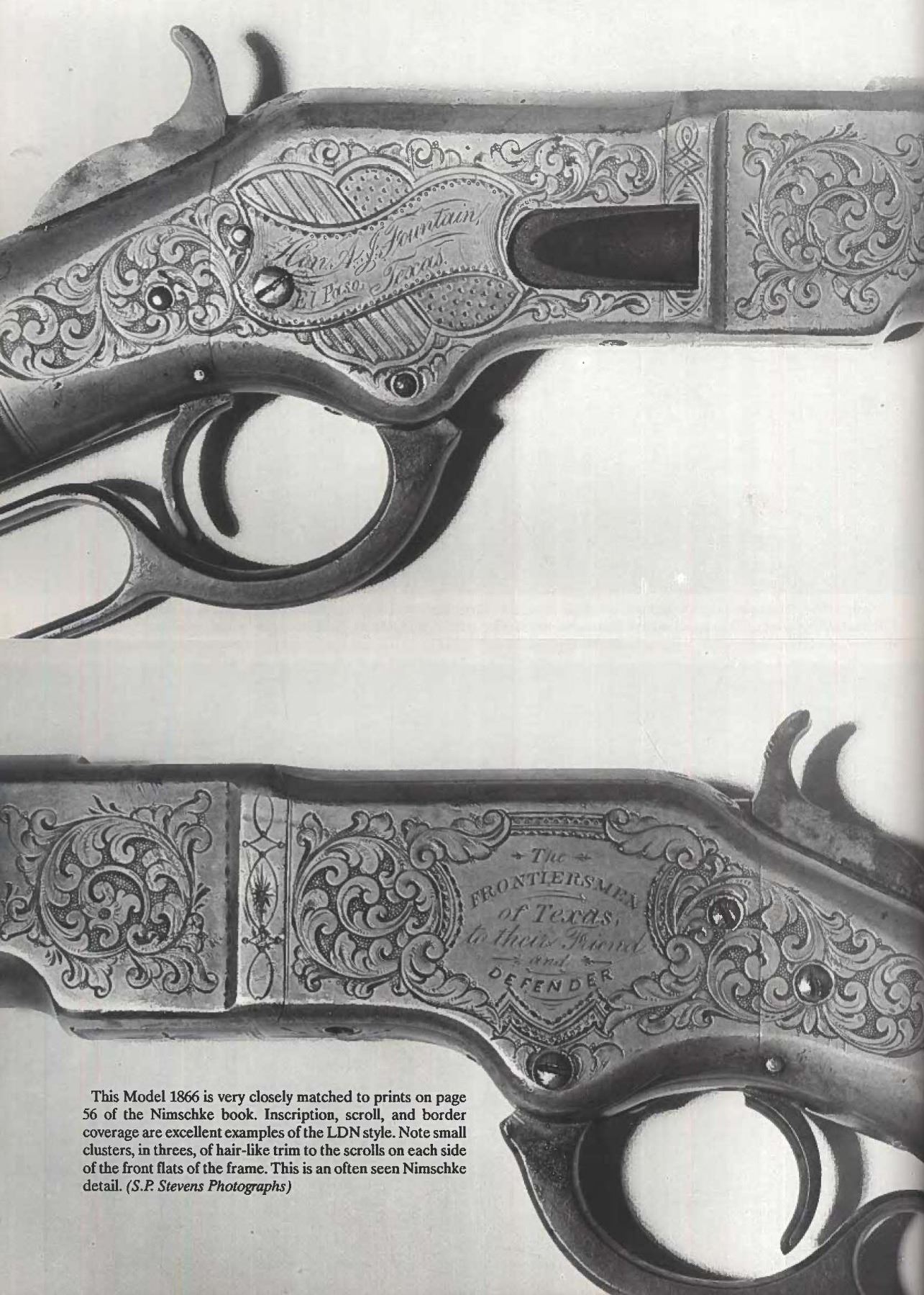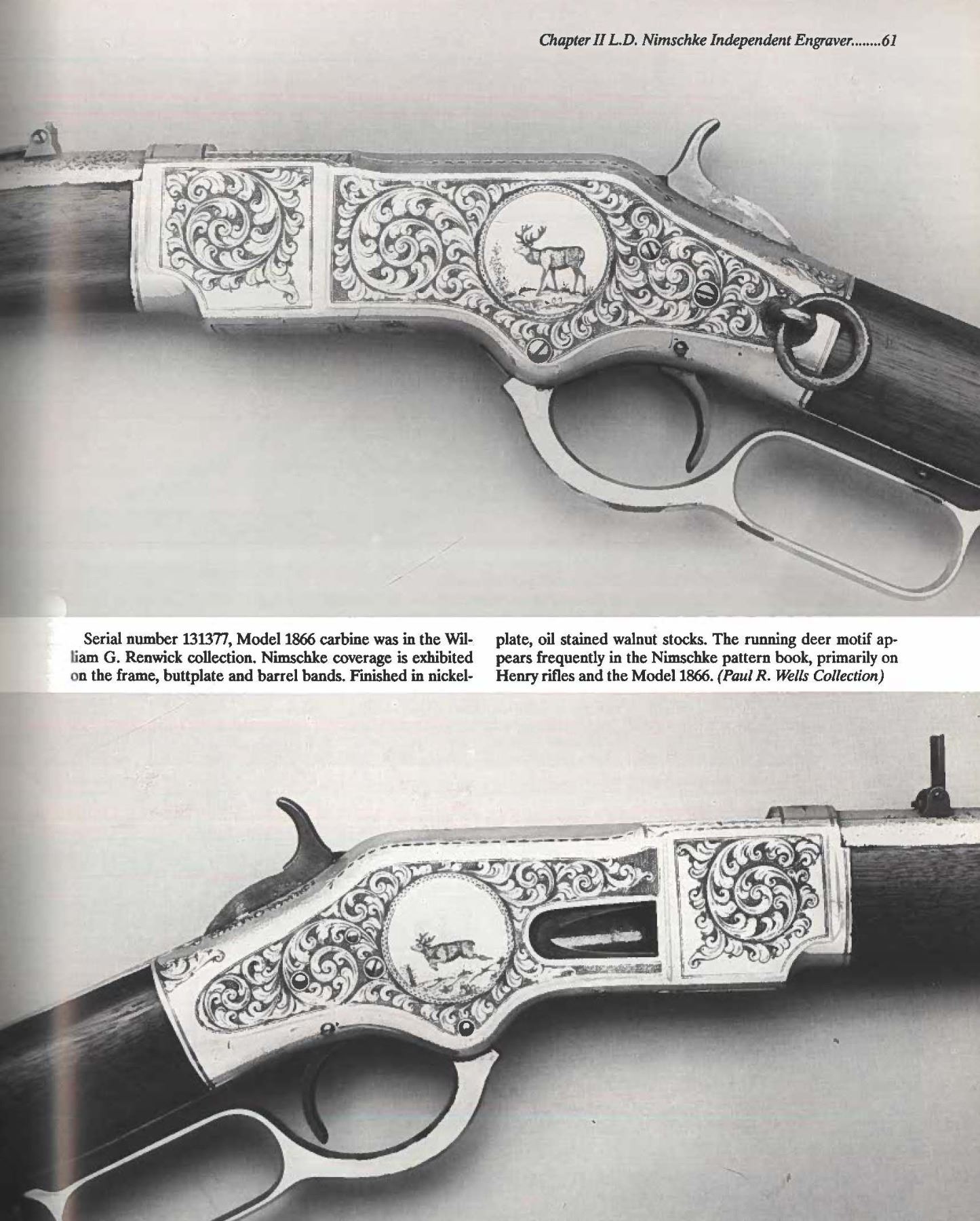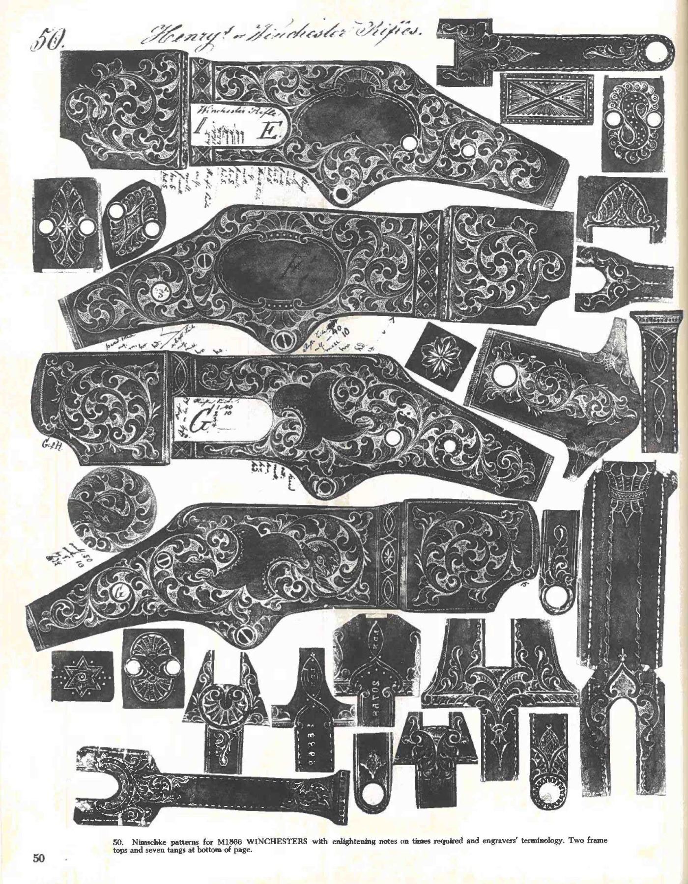WINCHESTER MODEL 1866 CARBINE. Cal. 44. S# 46843B. This is an elegant and very fine condition 66 carbine manufactured in 1871 beautifully engraved and silver plated. This classic engraving style of Louis D. Nimschke is found on Henry rifles and 1866 rifles & carbines, often signed. Stylistic elements of Nimschke are shown in several texts and little doubt this was made in his shop. Standard configuration, 20" blued barrel with 2-line "King's Improvement" address, 2-leaf rear sight, integral pinched front sight on front barrel band. Mounted on select straight grain varnished walnut. Serial number 46843 found lower tang, and last four digits of number found inside butt plate and top channel of buttstock. Stock is also stamped "VII" in lower channel, "C" is stamped on lower tang under stock. UNATTACHED ACCESSORIES: old collection tag stating purchase at Louisville February 21, 2004. Several pages copied from the Winchester Engraving book and Nimschke's pattern book. CONDITION: fine overall, markings and engraving are all very good, frame retains about 90% original silver plate, but plate has about 60% silver, barrel three times about 80% thinning bright factory blue finish, stocks are sound with scattered storage dings and dents. Mechanically fine, bright rifled bore. (01-26424/JS). ANTIQUE. $20,000-30,000.