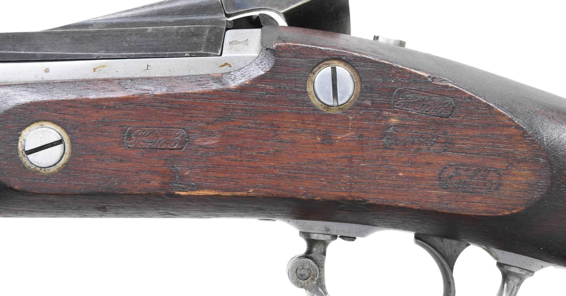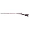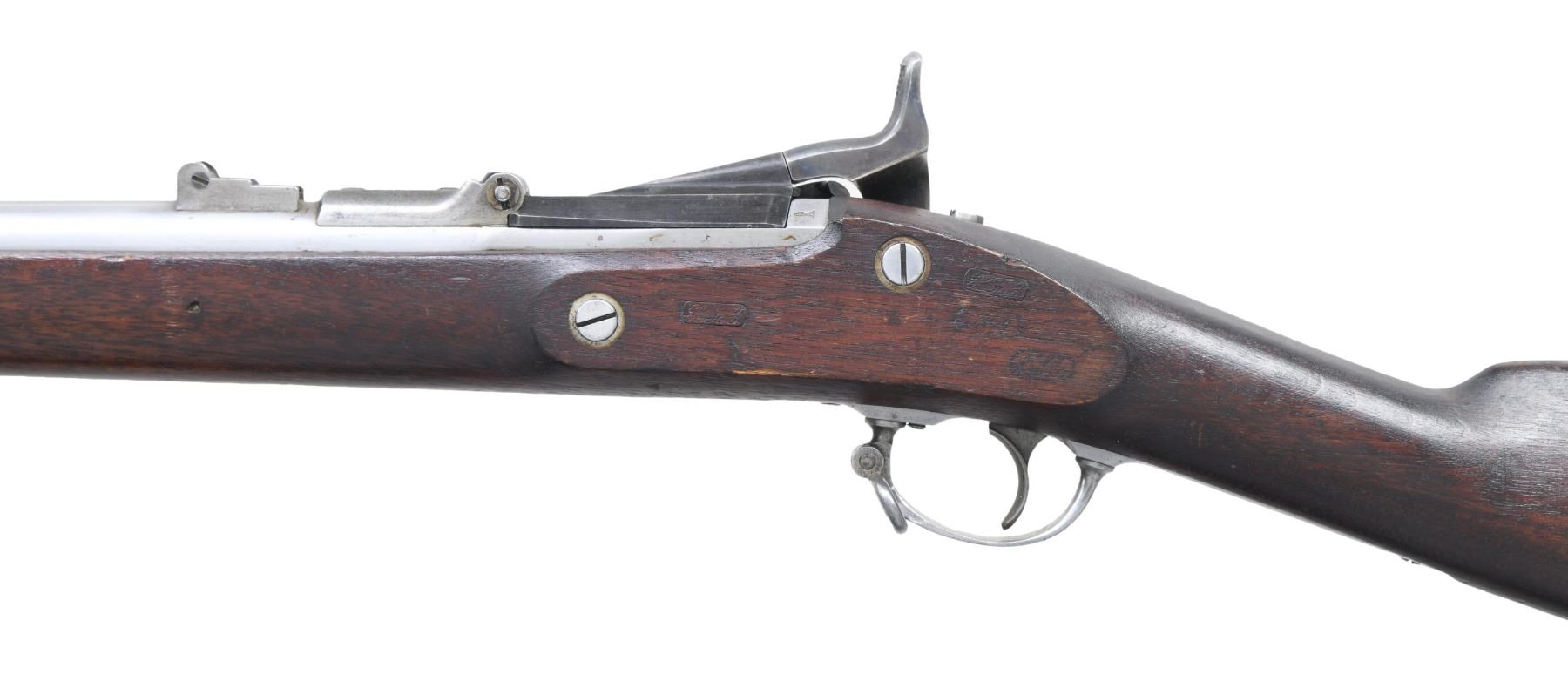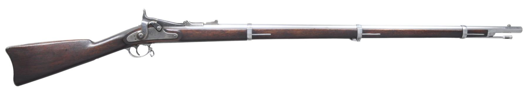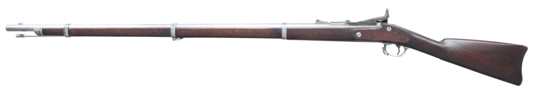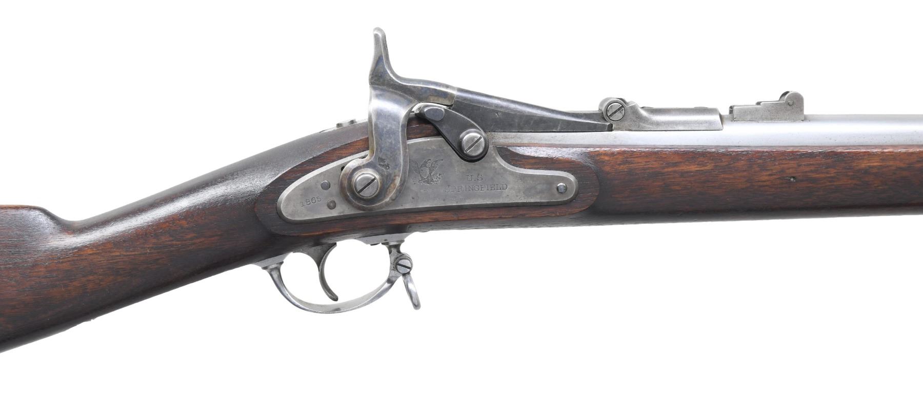 CONVERSION TRAPDOOR SNGLE-SHOT MILITARY RIFLE. Cal. 50-70. NSN. Bbl. 36 1/2". Approx. 25,000 of these rifles were altered at Springfield from Model 1863 rifled muskets. There were improvements made from the Model 1865 version w/ a lengthened bolt, firing pin spring & better extraction system. The original bbl. of this rifle was given a liner to reduce it from 58 to 50 cal to use a centerfire cartridge referred to as the 50-70 govt. The metal is finished bright, except the blackened breech block & the case colored lockplate & hammer. Breech block is correctly marked "1866" & "eagle head". Left rear of receiver has "eagle head" acceptance mark. Bevelled lockplate is dated 1865 at the tail & has a spread-wing eagle & "US / SPRINGFIELD" at the front. Two click tumbler. Flip type rear sight . The sight has two fixed sighting holes w/ a 700 yard notch at the top. Is hinged at the front & folds toward the receiver. Stud type front sight. Walnut stock has four acceptance marks on the left panel, two of which are more prominent. One mark appears to be "ESA" which indicates Erskin S. Allin, master armorer. Script "N" located behind trigger guard tang. Buttplate is marked "US". Forend held by three bands & retained by band springs. Middle band & trigger guard bow carry sling swivels. Ramrod is present. CONDITION: stock has very nice original finish w/ crisp markings. Metalwork has been professionally cleaned w/ scattered remnants of very fine pitting notable on lower band, trigger guard & buttplate. Lockplate & hammer show original case colors. Breech block has dark armory finish. Shiny bore w/ sharp lands. Bore shows a shallow partial ring in the area of the upper band. (01-26360/RW). ANTIQUE. $1,600-2,200.
