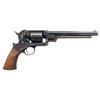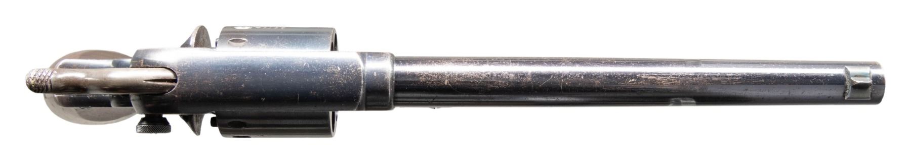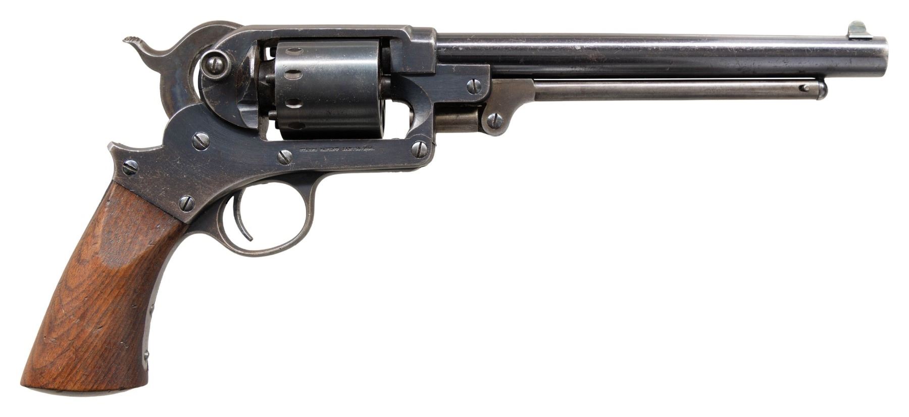 REVOLVER. Cal. .44. S# 39794. Standard configuration, 8" barrel, solid blued steel frame marked on either side: "STARR ARMS CO. NEW YORK" & "STARR'S PATENT JAN. 15, 1856". Serial numbers start at 23000 continuing the numbers from earlier double action revolver. This revolver was made in late 1863-1864 during height of Civil War. This is a very scarce civilian model difficult to find in such excellent condition with high finish.CONDITION: Extremely fine overall, retaining 90% plus bright original blue on barrel, cylinder, and frame. Back strap & trigger guard are gray patina with blue on protected areas, muted case colors are retained on loading assembly and hammer. One piece grip is sound with 4 small holes for a plaque once attached to left side. Mechanically fine, crisp bright shiny rifled bore. (01-28558/JS). ANTIQUE. $5,000-7,000.