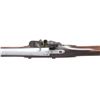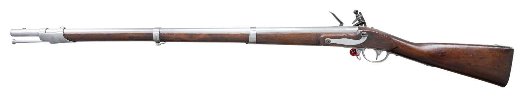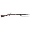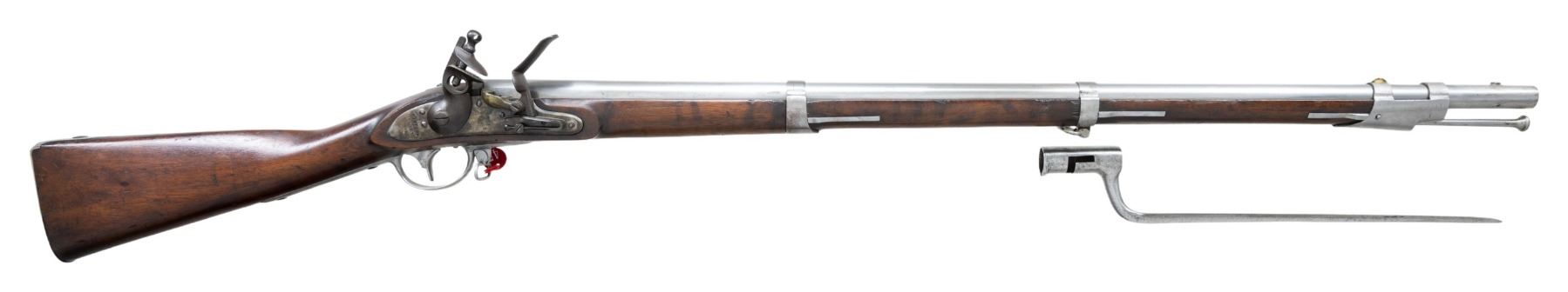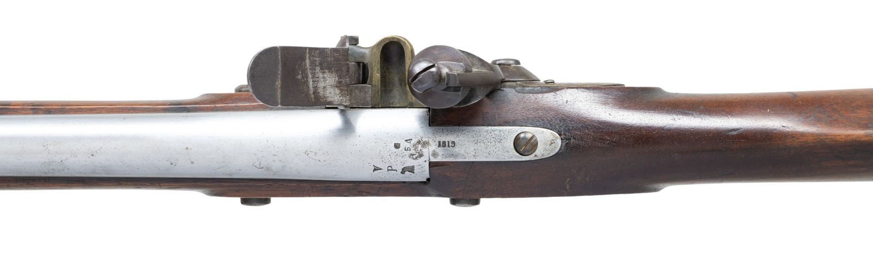 MUSKET WITH BAYONET. Cal. 69. S# NSN. Of 1816 pattern but with shorter barrel and stock; this scarce variation has 36" round barrel attached by three spring retained bands. Rear is marked "VP" and eagle head at left and a "G" "54" at top. Barrel tang is dated "1819". Lock with case hardened plate has reinforced cock, inset brass pan without fence, bridled friction frizzen and feather spring with bulbous finial. Center of lock is stamped with eagle over "US". Tail is marked "HARPERS" "FERRY" "1819". Interior of lock is stamped with matching assembly letter "G" as found on top of barrel. Stock with distinctive low comb is iron mounted with U.S. marked buttplate and Type 1 trigger guard. Steel ramrod with button head is present. Various inspectors marks are visible on stock including "AT" a number of "V"s and a large "AJB" behind sideplate. UNATTACHED ACCESSORIES: unmarked bayonet with triangular blade; fits well. CONDITION: very fine. Barrel and furniture showing re-polish to original type bright finish with some remnants of very light pin prick pitting. Lock appears to have most of its case hardening finish. Eagle is quite soft. A large amount of blue remains on feather spring. Stock is also very fine showing a number of minor marks, but little wear. Bore is bright with some minor pitting toward muzzle. Lock is crisp. Bayonet shows considerable cleaning to silver over deep pitting. As good an example of this scarce U.S. musket as one could expect to find. PROVENANCE: Estate Collection of Nicholas Apergis. (01-27566/MGM). ANTIQUE. $4,000-6,000.