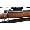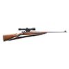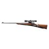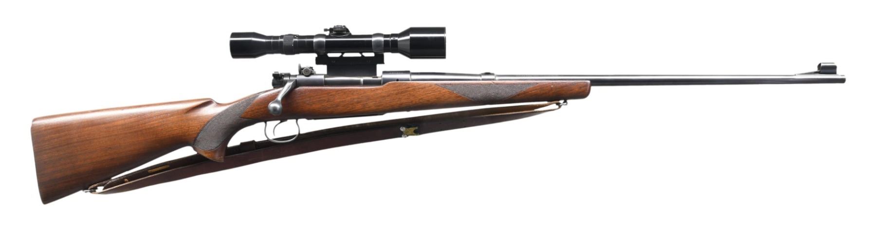 WITH CORRECT PERIOD SCOPE. Cal. 220 Swift. S# 42029A (1935). Made with 26" Winchester proof steel barrel with correct markings on left side. Typical model 54 action with unaltered bolt is fitted with Lyman 48 receiver sight and Griffin & Howe side mount holding Hensoldt Duralyt 6X scope with crosshair retical in G&H rings and base with windage adjustment. Pistol grip stock is checkered at grip and forend and is fitted with steel buttplate. Rifle sports an old leather sling. CONDITION: very fine. Metal retaining over 95% original blue with most loss on bottom metal with some scratches on floorplate and silvering on trigger guard bow. Bore is shiny with sharp rifling throughout. There is scant evidence of throat erosion. Scope is also very fine. Optically clear. This combo in 1935 would have cost $75.95 for rifle and Lyman 48 sight with an additional $60.00 for Hensoldt scope and G&H mount. (24-5909/MGM). CURIO. $1,000-1,500.