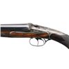 Cal. 12 Ga. 2-1/2". S# E350. The 28-1/2" monobloc barrels are fitted with slightly swamped narrow matted game rib. Barrel flats are stamped with French nitro proofs, steel type and "EPREUVE SURCHARGEE". A sling loop is soldered to bottom rib. Case hardened sliding breech action with obturating discs and toggling side safety is engraved with about 80% coverage rose and scroll. Fences are exceptionally well carved with looping acanthus in high relief. Two piece stock (post 1910) is of very nicely veined and fiddle figured European walnut with butt portion measuring 14-1/4" over a later zinc buttplate. Forpiece has inlet horn tip. Both sections are nicely checkered in point pattern. MEASUREMENTS: BBLS: Bore Diameter: L .722. R .722. Restriction: L .022 (Mod). R .008 (IC). Wall thickness: L .028. R .022. STOCK: DAH: 2-5/8". DAC: 1-7/8"+. CAST: off about 1/4". LOP: 14-1/4". WEIGHT: 6 lb. 11 oz. CONDITION: fine. Barrels retaining about 75% original blue. Action with about 65% original case hardening color. Stocks with old oil refinish over many nicks and bumps especially visible on forpiece. Buttplate a replacement. Checkering shows considerable wear. Bores are bright and shiny but shows some dent removal in right barrel about 10" behind muzzle. Mechanically good. (24-3982/MGM). CURIO. $1,000-1,500.