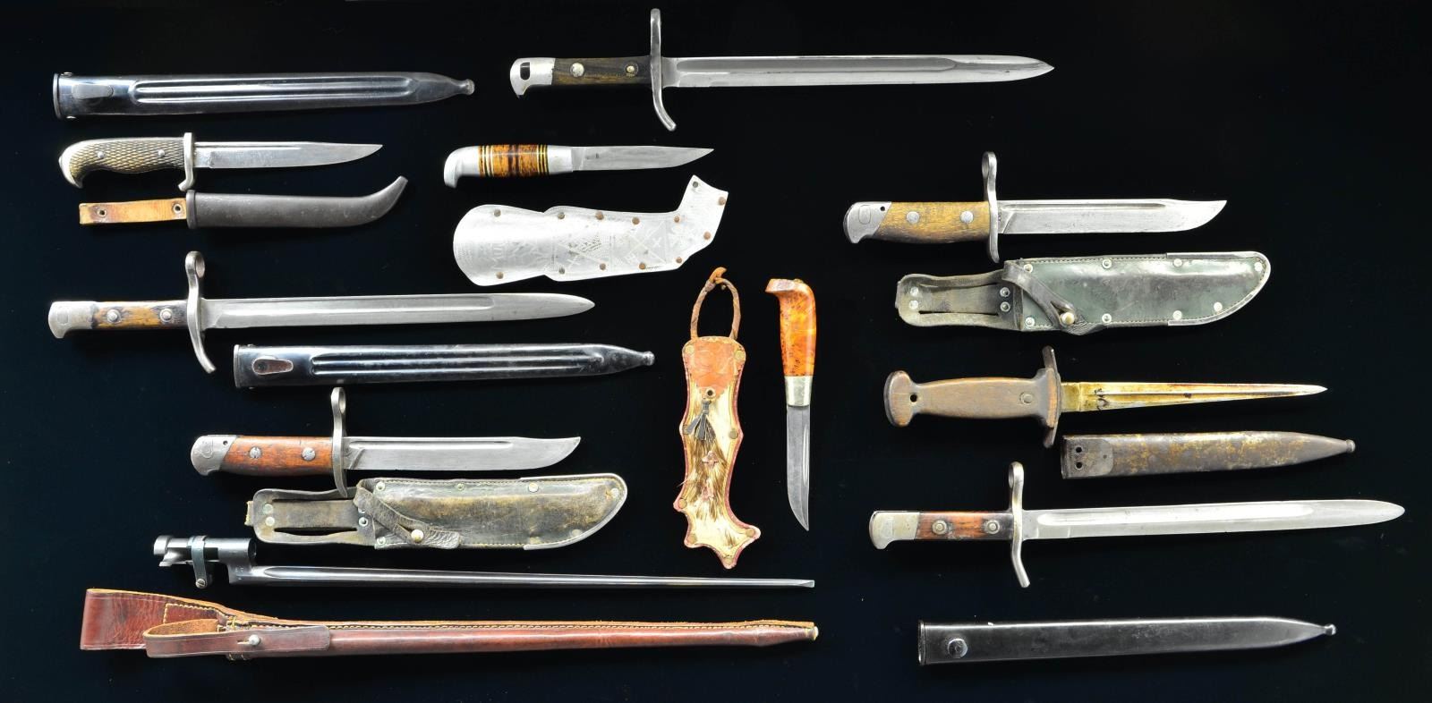 WINTER WAR ERA FINNISH FIGHTING KNIVES & BAYONETS. 1) Puukko style knife w/ 4-1/4" non Fullered single edge blade. Alloy handle w/ stacked washer construction. Leather lined aluminum scabbard reputed by consignor to be made of Russian aircraft aluminum dated 1942. Hand embossed symbols include "reindeer" "Finnish hooked cross" "Maltese cross" & "signal flags. CONDITION: knife has grind marks. Handle has light wear & handling marks. Scabbard has partially missing belt loop w/ wear, discoloration & handling marks. 2) Puukko knife w/ 3-3/4" Fullered blade. Blade has Finnish language engraving on right side. Handle ferrule has decorative embossing. Balance of handle appears to be burl wood. Leather scabbard appears to be made from leg of reindeer w/ decorative embossing. CONDITION: knife has light wear, scratches & scattered spots of light oxidation on blade. Scabbard has moderate wear, scuffing & staining, & shows significant loss of reindeer hair. 3) Finnish Puukkopistin dress knife w/ 5-3/8" Fullered blade. Likely German made. Blade marked on left Ricasso w/ "balance scales". Rearward curve quillion. Metal backstrap ending in bird's head pommel. Course checkered wooden grips. Steel scabbard w/ leather belt loop. CONDITION: blade has been replated over fine pitting w/ wear & discoloration. Balance of metal has light wear & sm. handling marks. Grips have light wear & sm. missing chip on right grip. Blue steel scabbard w/ light wear & scratches. 4) Finnish dbl. edged fighting knife w/ 8" Fullered blade. It appears this was made from a bayonet blade. This knife was likely produced by a base workshop & shows reasonably good workmanship. Sheet metal crossguard. One piece hardwood dagger style grip w/ transverse hole for thong, secured by single rivet. Steel scabbard appears to be shortened bayonet scabbard. CONDITION: blade has varnish like coating w/ wear & light oxidation. Crossguard has turned over all patina. Grip has worn dark stained appearance. Steel scabbard has extensive oxidation & patina. 5) Finnish Model 1939 bayonet has 7-1/8" Fullered blade. Marked on left Ricasso "O.Y. VELJEKSET KULMALA A.B." Marked on right Ricasso w/ "SK.Y" indicating use by the Civil Guard. Straight crossguard w/ muzzle ring & forward swept quillion. Bird's head pommel. One piece smooth hardwood grip. Green colored leather scabbard marked "SK.Y" w/ metal tip & retaining strap. CONDITION: blade has scattered spots of very fine pitting w/ wear turning gray. Balance of metal turning gray & patina w/ wear & handling marks. Grip has fine cracks at bottom w/ wear & staining. Scabbard has wear, scuffing & handling marks throughout. 6) Model 1939 bayonet. 7-1/8" Fullered blade marked on left Ricasso "O.Y. VELJEKSET KULMALA A.B." Right Ricasso is marked "SK.Y". Crossguard w/ muzzle ring & forward swept quillion. Crossguard marked on right side w/ "S". Bird's head pommel. Smooth hardwood grip. Metal tipped leather scabbard marked "SK.Y" w/ retaining strap. CONDITION: metal turning gray w/ wear, handling marks & spots of shallow oxidation. One piece grip has crack at bottom & wear, staining & handling marks. Leather scabbard has wear, flexing, scuffing & sm. hole at bottom rivet. 7) Model 1927. 11-3/4" fullered blade. Marked on left Ricasso "FISKARS". Forward curved quillion. Bird's head pommel. Smooth hardwood grips. Ribbed steel scabbard. CONDITION: bright metal has wear, discoloration & scattered spots of oxidation & fine pitting. Grips have wear & staining. Scabbard retains lg. percent of original blue w/ scattered spots of oxidation. 8) Model 1927. 11-3/4" Fullered blade. Marked "FISKARS" on left Ricasso. Forward swept quillion. Bird's head pommel. Smooth hardwood grips. Smooth blued steel scabbard. CONDITION: metal has worn appearance w/ scattered sm. spots of oxidation. Loose crossguard was repaired by spot welding at lower edge of Ricasso. Weld has failed, leaving crossguard loose. Grips have moderate wear & handling marks. Scabbard has 80% blue w/ light peppery oxidation. 9) Model 1927. 11-7/8" Fullered blade. Marked on left Ricasso "HACKMAN & CO." Forward swept quillion. Bird's head pommel. Smooth hardwood grips. Ribbed blued steel scabbard. CONDITION. metal has wear turning gray & patina. Grips show moderate wear & staining. Scabbard has approx. 75% thinning worn original finish. 10) Model 1891. 17" quadrangular blade socket bayonet. Blued steel blade has screwdriver tip & Russian mfg. marks & faint boxed "SA" on right side of socket. Scarce unmarked Finnish brown leather finish scabbard. CONDITION: Bayonet has 75% arsenal rework blue finish w/ light wear. Scabbard has light wear & flexing but stitching is tight. (02-16388/RW) $400-800.