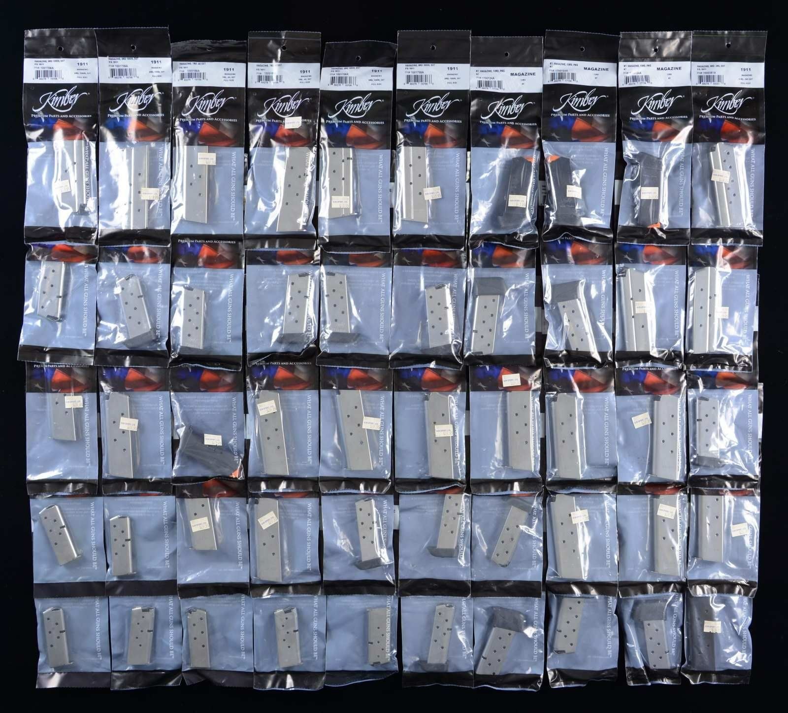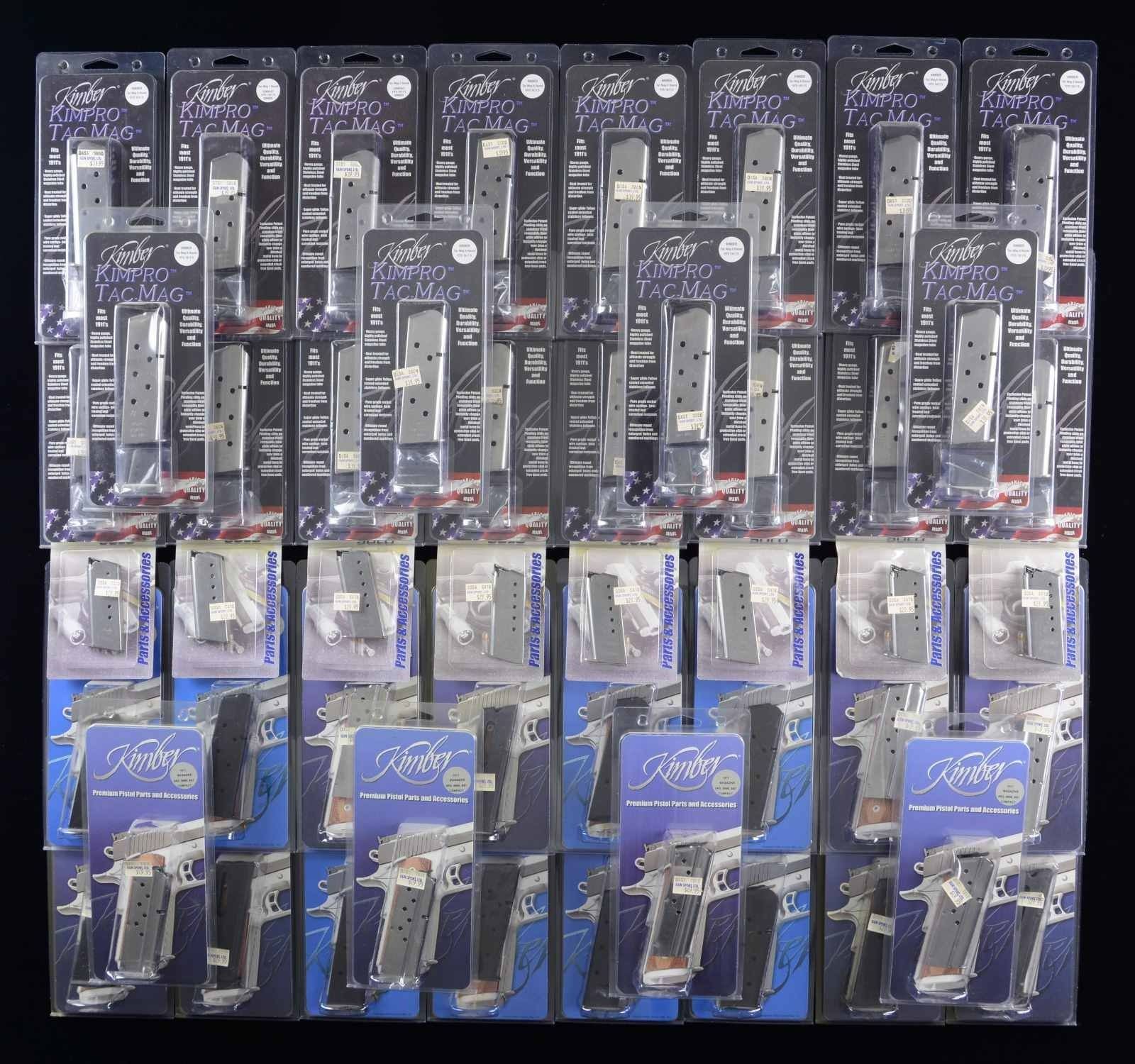All mags. are sealed in Kimber factory packaging. Mags. are a mix of black, blue & stainless steel (SS). BLISTER PACKS - TOTAL: 65 KIMPRO: 30 KimPro Tac-Mag, fits 1911 pistols, 45 ACP, 8 rd. w/ base pad, (SS). / 1 KimPro Tac-Mag 45 ACP, fits 1911's, 8 rd. (SS). / 4 KimPro Tac-Mag 45 ACP, fits 1911's, 7 rds., (SS) w/ base pads. KIMBER: 9 Kimber Compact 9mm fits 1911, 8 rds., (SS). / 8 Kimber 45 ACP fits 1911's, 8 rds. Blue. / 8 Kimber Solo 9mm, 6 rd. (SS). / 5 Kimber 22 LR, 10 rd., Polymer. POLY PACK - TOTAL: 185. KIMBER: 38 Kimber - fits 1911, 45 ACP, 8 rd. (SS). / 25 Kimber-compact, fits 1911, 45 ACP, 7 rd., (SS). / 11 Kimber Micro 380, 380 ACP, 6 rd., (SS). / 10 Kimber Micro9, 9mm, 7 rd., (SS). / 3 Kimber - fits 1911, 9mm, 9 rd., (SS). / 5 Kimber Compact - fits 1911, 45 ACP, 7 rd., (SS). / 3 Kimber R7, 9mm, 13 rd., Blue. / 4 Kimber Compact, fits 1911, 45 ACP, 7 rd. Black. / 21 Kimber, fits 1911, 38 Super, 9 rd., (SS). / 3 Kimber R7, 9mm, 13 rd., Black. / 21 Kimber, fits 1911, 10mm, 8 rd., (SS). / 15 Kimber, Full size, fits 1911 45 ACP, 7 rd. (SS). / 6 Kimber R7, 9mm, 11 rd., Black. / 4 Kimber, full size, fits 1911, 45 ACP, 8 rd. Black. / 9 Kimber, Micro 380 ACP, 7 rd. (SS) w/ buttpad. / 3 Kimber Micro, 9mm, 8 rd., (SS) w/ buttpad. / 3 Kimber Micro9, 9mm, 6 rd., (SS). / 1 Kimber, fits 1911, 45 ACP, 8 rd., (SS). CONDITION: as new in factory packaging. Packaging may have light handling wear. PROVENANCE: the Collection of Gun Sport Ltd owned by Jon R. Thomas. (02-20815/RW). $1,250-2,500.