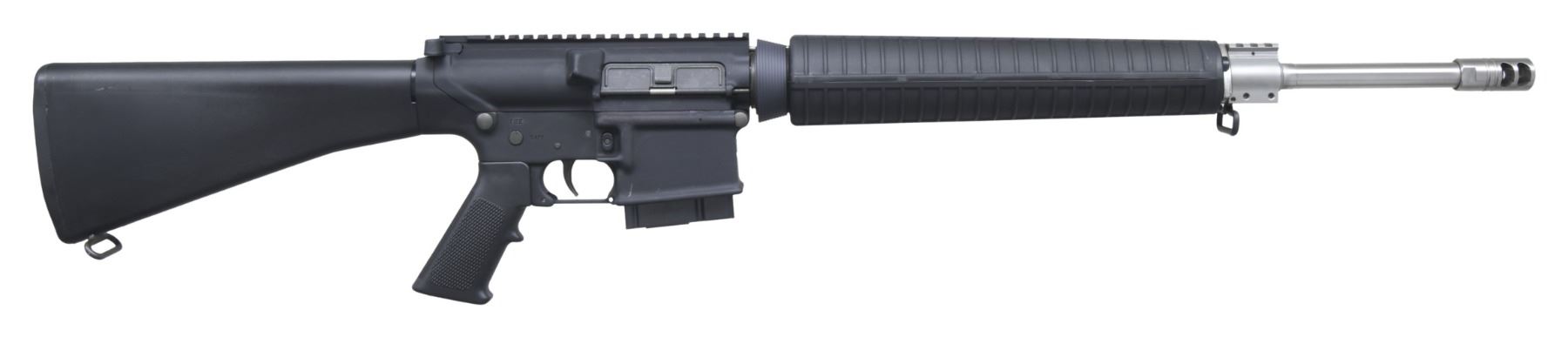 Cal. 7.62x51mm. S# USA551417. Bbl. 20" Stainless steel, terminated w/ dual chamber muzzle brake. Low profile gas block w/ 1.5" picatinny rail. Round A2 style handguards retained w/ tapered delta ring. Flat top upper receiver w/ brass deflector & no forward assist. Left side safety / selector. Full length fixed shoulder stock w/ trap door. Sling swivels front & rear. MAGS: 1 10 rd. CONDITION: Finish coverage complete & consistent, bearing only a few light drag lines as evidence of prior use. Bright bore w/ strong rifling. Fire control mechanism appears to function correctly when cycled by hand. (25-3329/JZ). MODERN. $700-1,000.