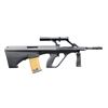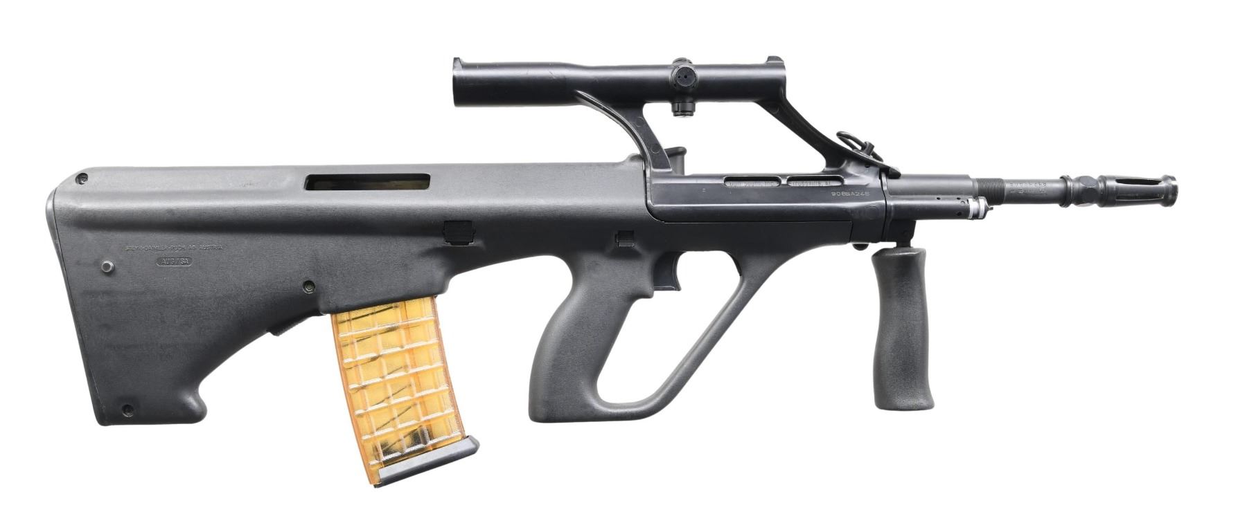 Cal. 223. S# 908SA248. Bbl. 16". An original Steyr AUG/SA as imported through Gun South, Inc. in Trussville, AL. The receiver sports the appropriate low magnification sight w/ simple circle reticle & top mounted battle sights. Black chassis. Barrel. is numbered to receiver & includes a short section of fine flutes behind the unique Steyr tulip flash hider. Correct black folding vertical foregrip. Bolt is also correctly numbered to receiver. Left side non reciprocating charging handle. Sling swivels front & rear. MAGS: 1 waffle pattern 30 rd. CONDITION: exposed metal surfaces retain complete coverage of original factory finish w/ very little sign of prior use. Chassis is equally as fine. Glass is clear w/ fine reticle. Bright bore w/ strong rifling. Fire control mechanism appears to function correctly when cycled by hand. (24-5220/JZ). MODERN. $2,000-3,000.