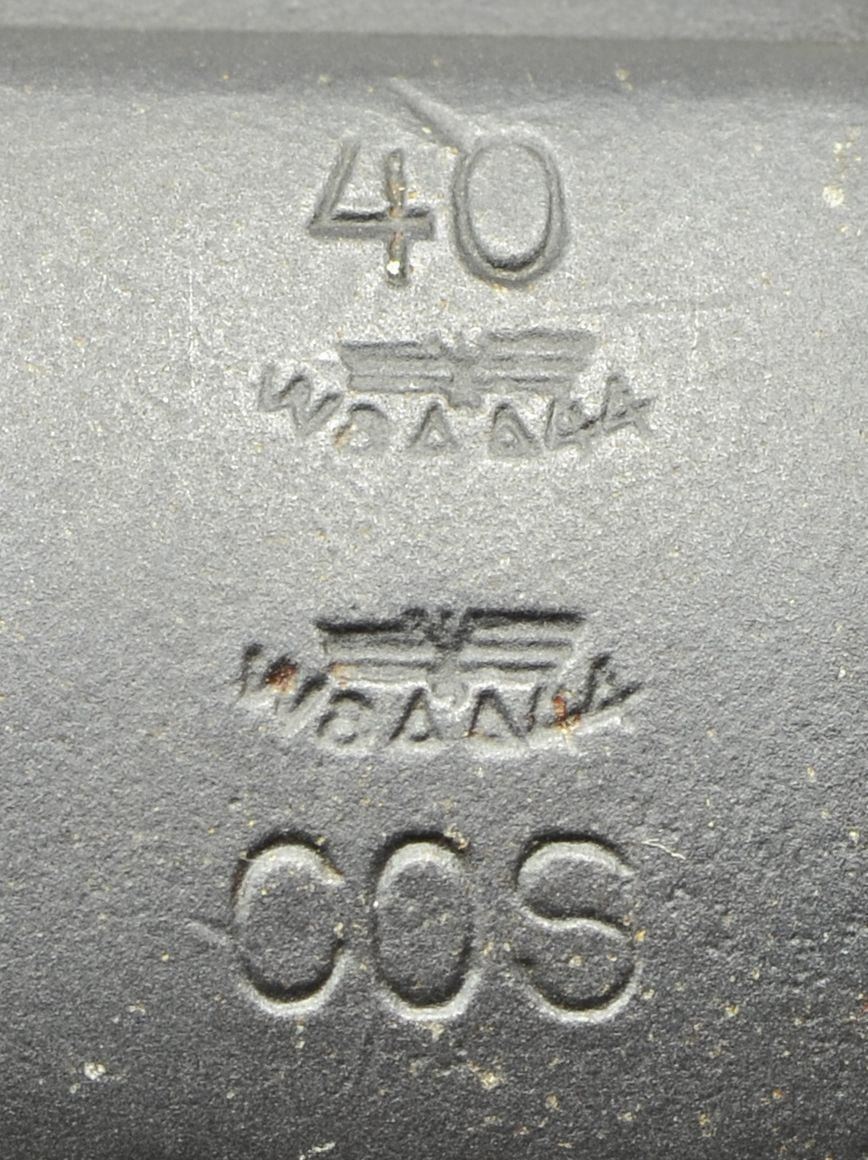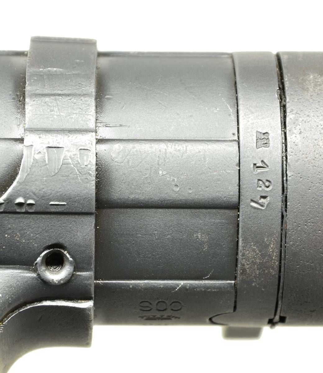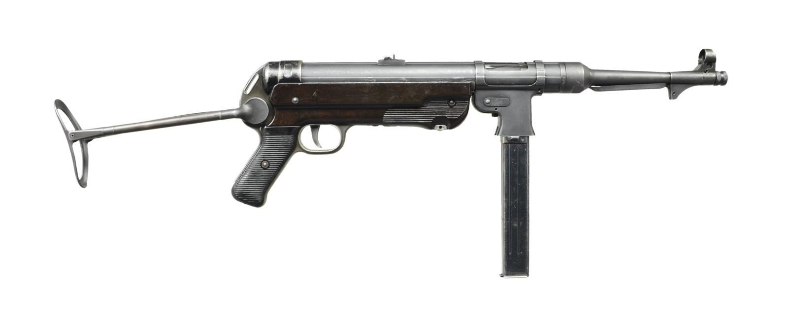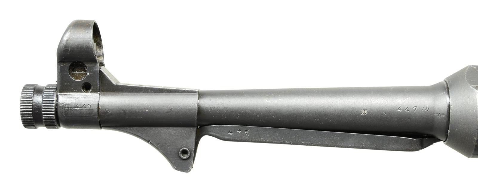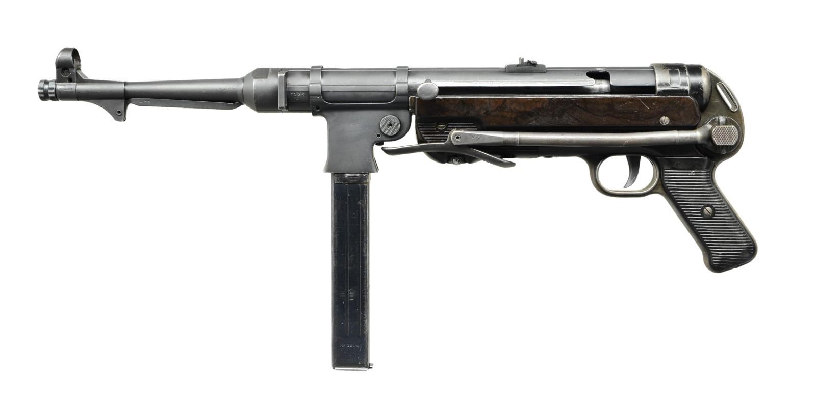 Cal. 9mm. S# 7127A. Bbl. 9 9/10". Hooded fixed blade front sight, rear sight is windage drift adj. 2 Piece folding leaf. Of all the German WWII era SMGs, the MP40 may be the most iconic of them all. Its slow cyclic rate combined w/ decent sights & pleasant ergonomics make it as fun to operate as it is interesting to look at. It utilizes a very simplistic, yet incredibly smooth open bolt firing mechanism. The recoil system is typical of German over engineering consisting of a 3 piece telescoping rod w/ a captured spring that doubles as the connection point for the firing pin which slides inside of the bolt. The safety mechanism is an extremely simple design which shares commonalties w/ other WWII era SMGs. It consists of a rearward notch that interfaces w/ the cocking handle holding the bolt to the rear. Manufactured in 1943 by Steyr-Daimler-Puch AG as designated by receiver code “bnz.43”. This MP40 appears to be a 2nd variation, based on the smooth mag. housing w/ square notch facing the shooter, as well as the safety style bolt handle instead of the early hook. There are several numbers & marks spread over this platform, including; "Grip frame & receiver cap - "bnz 43 / 11441". Trigger housing - "8064 t". Stock - "024". Receiver tube - "7127a / COS / 40" & several waffenamts including eagle over "WaA444" & "WaA623". Mag well - "127". Barrel, resting bar & front sight - "447". Rear sights - "127". Bolt - "1092L" & waffenamt eagle over "WaA623". Recoil rod & firing pin - "3721 / 721" & waffenamt "WaA623". Under folding stock, dark brown Bakelite grips & lower receiver cover. MAGS: 1 original 30 rd. marked "MP38u40". CONDITION: matte black finish complete & consistent w/ great coverage. Some thinning, primarily in areas of mechanical intervention. This is a VERY nice example. Stock locks tight in both folded & extended positions. Grips appear in nice condition free of any obvious damage & Bakelite receiver has normal scratches w/ only slight indentation at rear above folding stock mechanism. Fire control mechanism appears to function correctly when cycled by hand. THIS IS A NATIONAL FIREARMS ACT CURIO & RELIC MG, REQUIRING BATF TRANSFER BEFORE TAKING POSSESSION. FULLY TRANSFERABLE. (03-1623/JZ). CLASS III. $25,000-35,000.