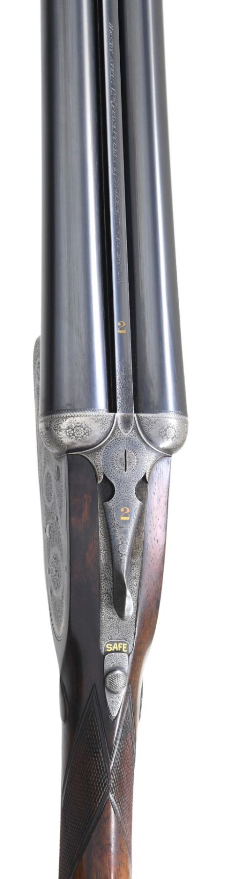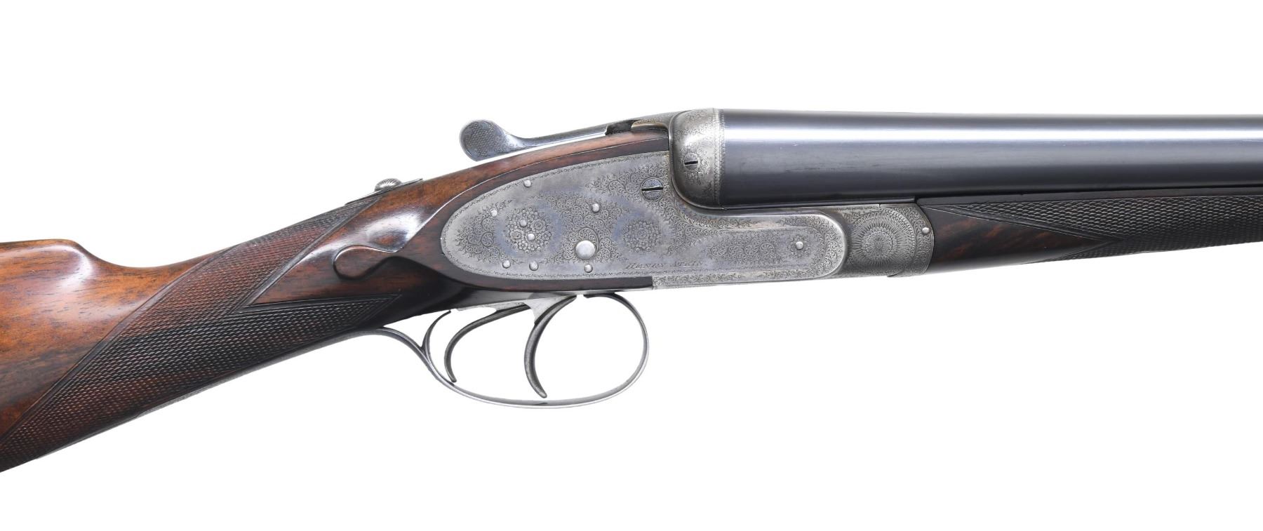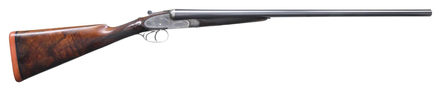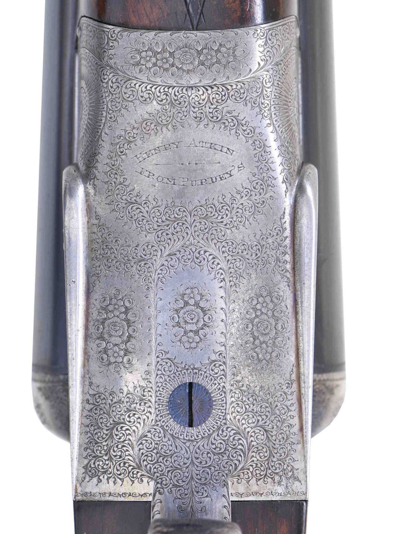 SIDELOCK EJECTOR SELF-OPENING GAME GUN. Cal. 12 Ga. 2-1/2". S# 3003 (1930). Henry Atkin worked for Purdeys until the mid 1870's when he went on his own. His guns are almost always marked "from Purdey's" to capitalize on his mentors famous name. Henry Atkin guns are generally always built to the highest standards and in his later guns, he made improvements to the Purdey/Beesley action giving them smoother cocking and ease of opening by reconfiguring the main springs. That feature is incorporated in this gun which has 27" (very popular in the early 30's) chopper lump barrels fitted with very narrow swamped game rib. Top of rib is engraved "HENRY ATKIN Ltd. (from Purdey's) 88 Jermyn St. London S.W.". A gold number "2" is at rear of rib as gun is second gun of a pair. A gold "2" is also found on top lever and forend tip. Barrel flats are stamped with London nitro proofs for 2-1/2" chambers. S# is on bottoms of barrels. Case hardened Beesley type Atkin improved self-opening sidelock action features automatic safety ("SAFE" inlaid in gold), bushed strikers and double triggers. Action is engraved with 80% coverage extremely well cut classic rose and scroll. Maker's name is on each lockplate and on bottom of action where is is over "from Purdey's". Blued trigger guard with open scroll on bow has S# on short tang. Broadly marbled and stump figured European walnut straight grip buttstock measures 15" over Silver pad. Stock features classic drop points, point pattern grip checkering with mullered borders and a silver oval engraved with a monogram "PFE" (?). Matching splinter forend with Anson release is fitted with Atkins improved ejectors resembling the Southgate type. MEASUREMENTS: BBLS: Bore Diameter: L .731. R .731. Restriction: L .022 (mod). R .009 (IC). Wall thickness: L .020. R .022. STOCK: DAH: 2-1/4". DAC: 1-1/2". CAST: about 5/8" off. LOP: 15". WEIGHT: 6 lb. 1/2 oz. CONDITION: fine as partially refinished. Barrels retaining nearly all of a best re-blue. Action retains about 20% original color. Lockplates retain about 50-60% of their color. Trigger retains most of its original bright blue. Stocks have light oil refinish with some subsequent light marks and scratches. Checkering very competently re-cut and is perhaps a bit sharp. Bores are bright and shiny without noted problems except for a shallow dent on side of left barrel 6" from muzzle. Action is tight. Barrels on face. Ejectors strong and in time. (25-943/MGM). CURIO. $4,000-6,000.