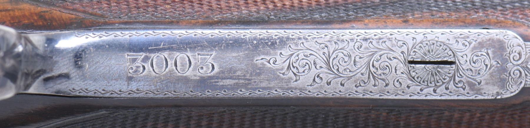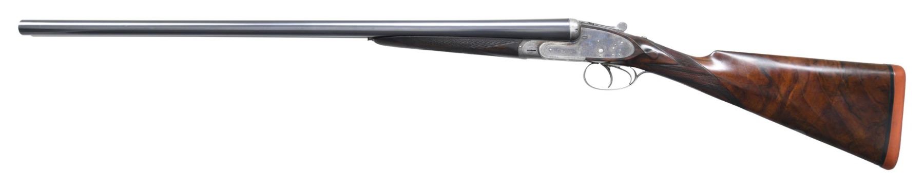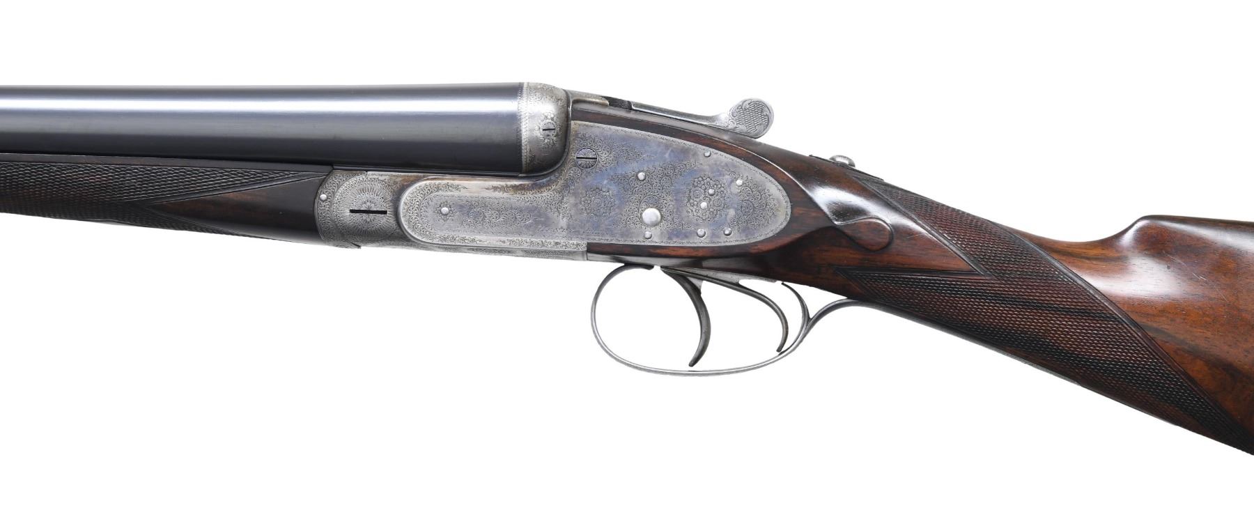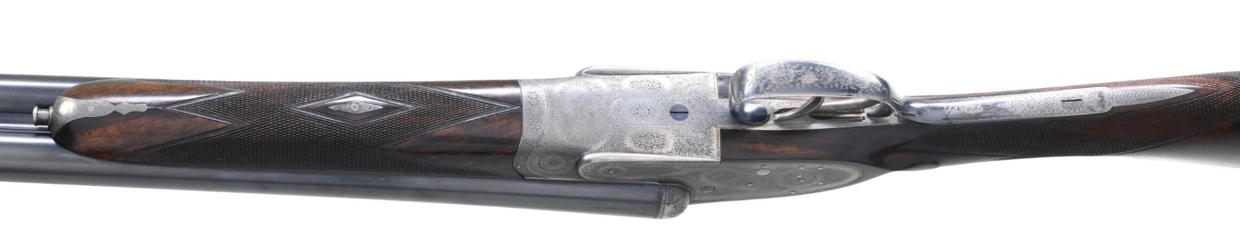 SIDELOCK EJECTOR SELF-OPENING GAME GUN. Cal. 12 Ga. 2-1/2". S# 3003 (1930). Henry Atkin worked for Purdeys until the mid 1870's when he went on his own. His guns are almost always marked "from Purdey's" to capitalize on his mentors famous name. Henry Atkin guns are generally always built to the highest standards and in his later guns, he made improvements to the Purdey/Beesley action giving them smoother cocking and ease of opening by reconfiguring the main springs. That feature is incorporated in this gun which has 27" (very popular in the early 30's) chopper lump barrels fitted with very narrow swamped game rib. Top of rib is engraved "HENRY ATKIN Ltd. (from Purdey's) 88 Jermyn St. London S.W.". A gold number "2" is at rear of rib as gun is second gun of a pair. A gold "2" is also found on top lever and forend tip. Barrel flats are stamped with London nitro proofs for 2-1/2" chambers. S# is on bottoms of barrels. Case hardened Beesley type Atkin improved self-opening sidelock action features automatic safety ("SAFE" inlaid in gold), bushed strikers and double triggers. Action is engraved with 80% coverage extremely well cut classic rose and scroll. Maker's name is on each lockplate and on bottom of action where is is over "from Purdey's". Blued trigger guard with open scroll on bow has S# on short tang. Broadly marbled and stump figured European walnut straight grip buttstock measures 15" over Silver pad. Stock features classic drop points, point pattern grip checkering with mullered borders and a silver oval engraved with a monogram "PFE" (?). Matching splinter forend with Anson release is fitted with Atkins improved ejectors resembling the Southgate type. MEASUREMENTS: BBLS: Bore Diameter: L .731. R .731. Restriction: L .022 (mod). R .009 (IC). Wall thickness: L .020. R .022. STOCK: DAH: 2-1/4". DAC: 1-1/2". CAST: about 5/8" off. LOP: 15". WEIGHT: 6 lb. 1/2 oz. CONDITION: fine as partially refinished. Barrels retaining nearly all of a best re-blue. Action retains about 20% original color. Lockplates retain about 50-60% of their color. Trigger retains most of its original bright blue. Stocks have light oil refinish with some subsequent light marks and scratches. Checkering very competently re-cut and is perhaps a bit sharp. Bores are bright and shiny without noted problems except for a shallow dent on side of left barrel 6" from muzzle. Action is tight. Barrels on face. Ejectors strong and in time. (25-943/MGM). CURIO. $4,000-6,000.