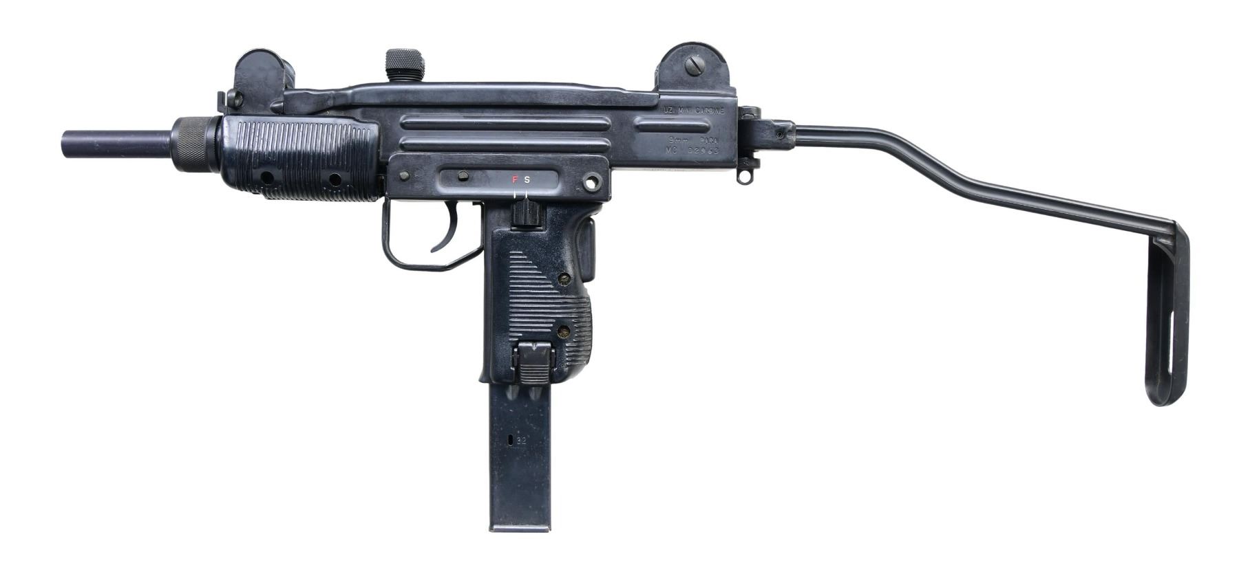Cal. 9mm. S# MC02963. Bbl. 19.8". The original Uzi SMG is an open bolt, select fire mechanism that is light years ahead of its technology when it comes to use. It can be utilized in its collapsed or folded, concealable configuration, yet takes only moments to extend the rear stock. The Uzi bbl. only appears to be a couple inches in length which greatly minimizes its signature for use in tight quarters, but because of the ingenious design, it actually extends back inside of the bolt giving the operator much more rifled bbl. to increase hit probability immensely. Those that are familiar w/ the 1911 family of firearms will appreciate the grip safety integrated into the mechanism. This particular example is the semiautomatic, closed bolt, Mini-Uzi Carbine. Black plastic furniture. Bottom, front mounted bayonet lug. Sling swivels on left side of receiver & stock. Elevation adj. protected post front sight. Dual aperture rear sight. Left side markings include "F-S" above safety/selector. Left rear receiver markings "UZI MINI CARBINE/ 9mm PARA" & serial number. Receiver markings behind the pistol grip include "ACTION ARMS LTD. / PHILA PA / IMI ISRAEL MAGS: (2 total) 1 steel 25 rd., 1 steel 32 rd. UNATTACHED ACCESSORIES: Black plastic factory case, spare 19.8" barrel (2 total), faux short display barrel & owners manual. CONDITION: All aspects indicate very little use, if any. Original finish coverage is complete & consistent w/ no sign of prior use. Stock locks tightly in both extended & folded positions. Bores are bright w/ strong rifling. Spare barrel still demonstrates evidence of factory grease. Fire control mechanism appears to function correctly when cycled by hand. PROVENANCE: Lifelong Collection of Terrence McCarty. (24-311/JZ). MODERN. $1,200-1,800.