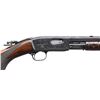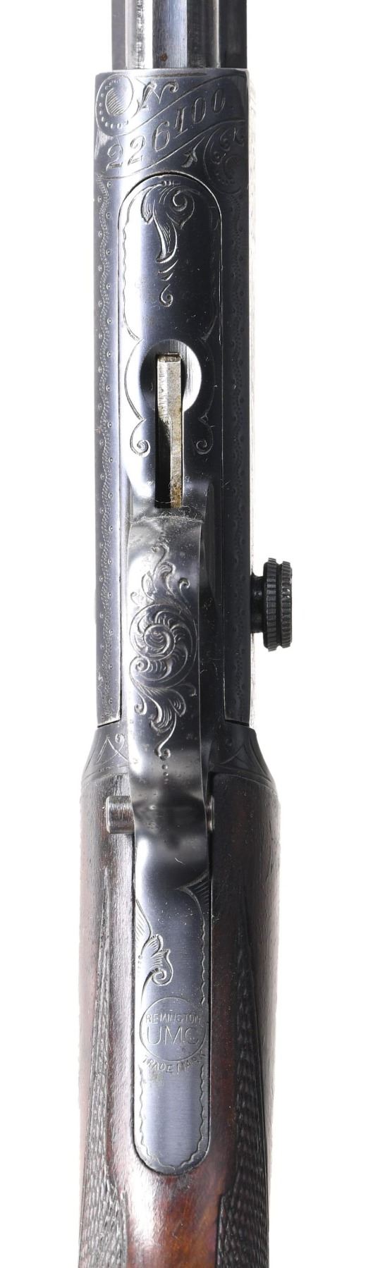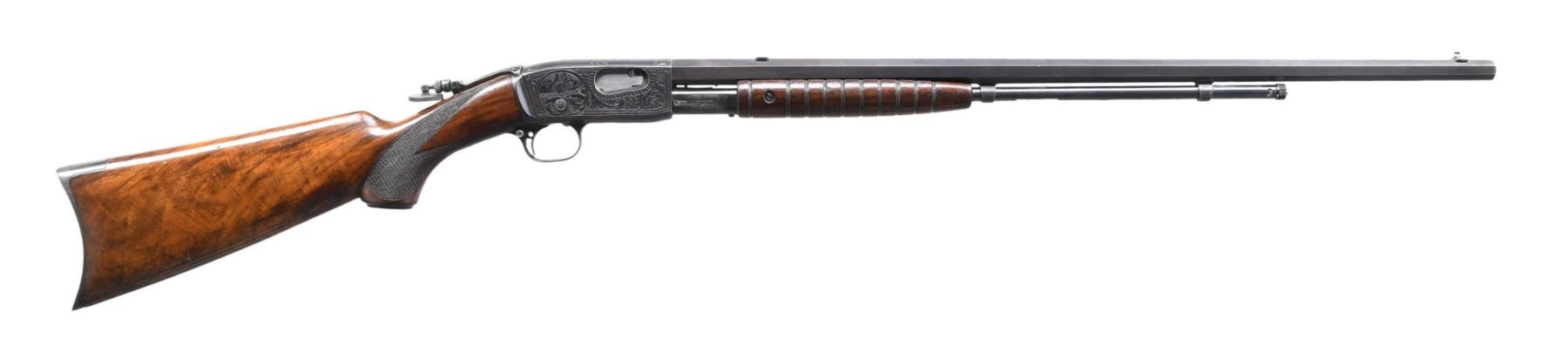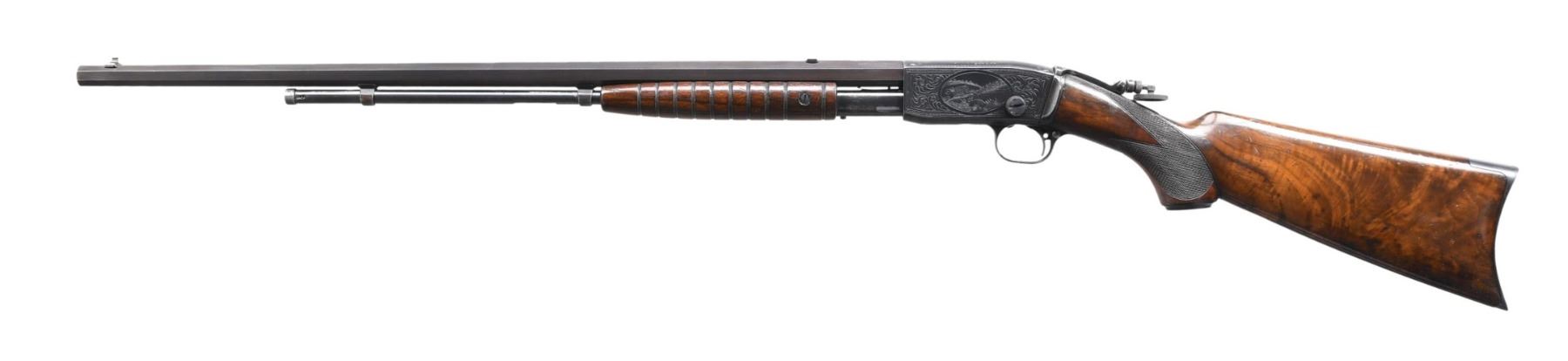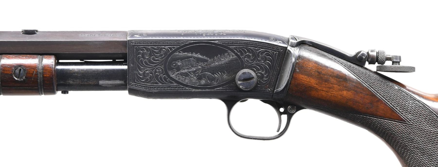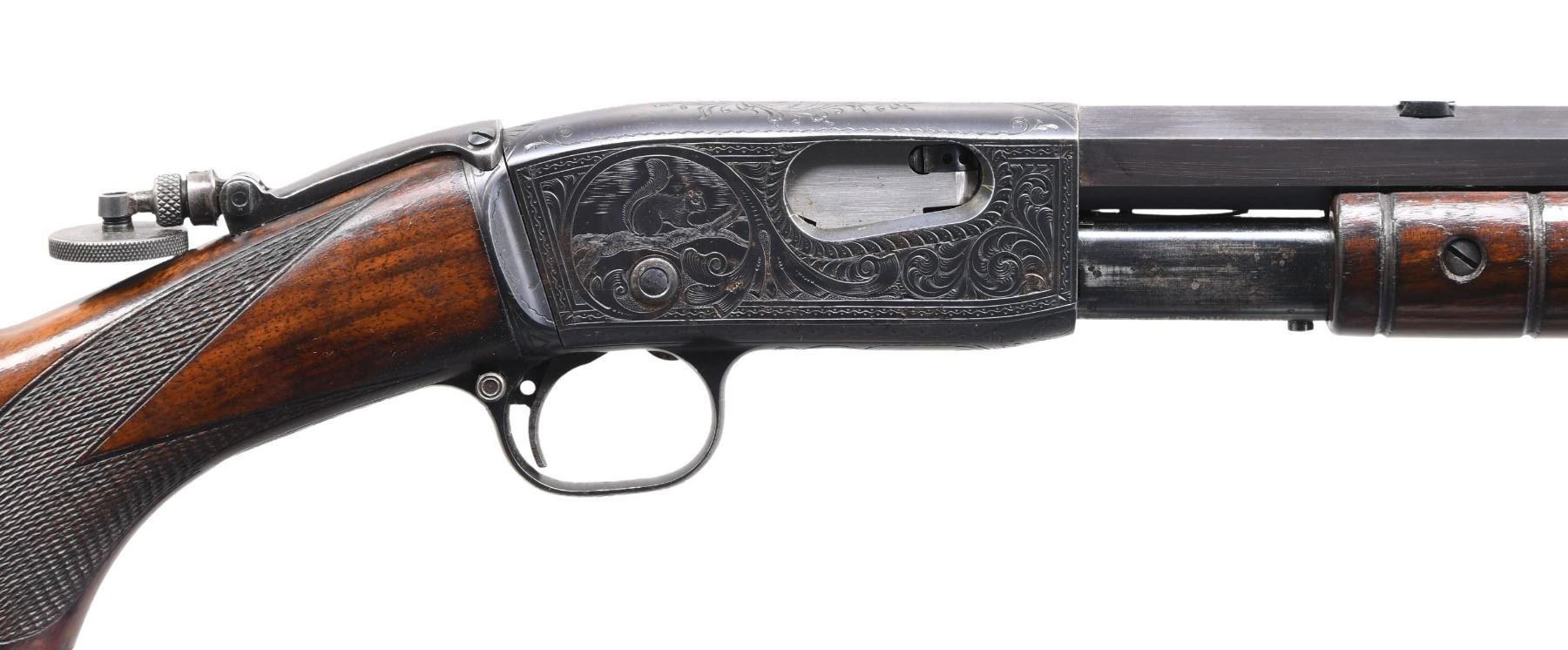 PUMP RIFLE. Cal. 22 Rem Spec. S# 226100. Bbl. 24" octagon. Original bead front sight, filler in rear dovetail w/ Lyman tang sight having a large disc aperture. Blue finish. Action has factory D grade engraving. Right side vignette features a squirrel on a branch. Left side vignette features 2 cottontail rabbits. Scenes are surrounded by scroll engraving w/ fancy borders that extends to upper & lower action areas. Grooved forearm & hard rubber capped pistol grip stock of fancy walnut w/ hand checkering & crescent steel buttplate. Mfg. 1913. CONDITION: 90% lightly faded blue showing carry wear w/ spots of freckling. Original wood finish shows wear spots & darkening w/ scattered scratches & marks. Bright bore retains lightly worn rifling. PROVENANCE: The estate collection of Don "Duck" Combs. (24-2424/DS). CURIO. $5,000-7,000.