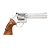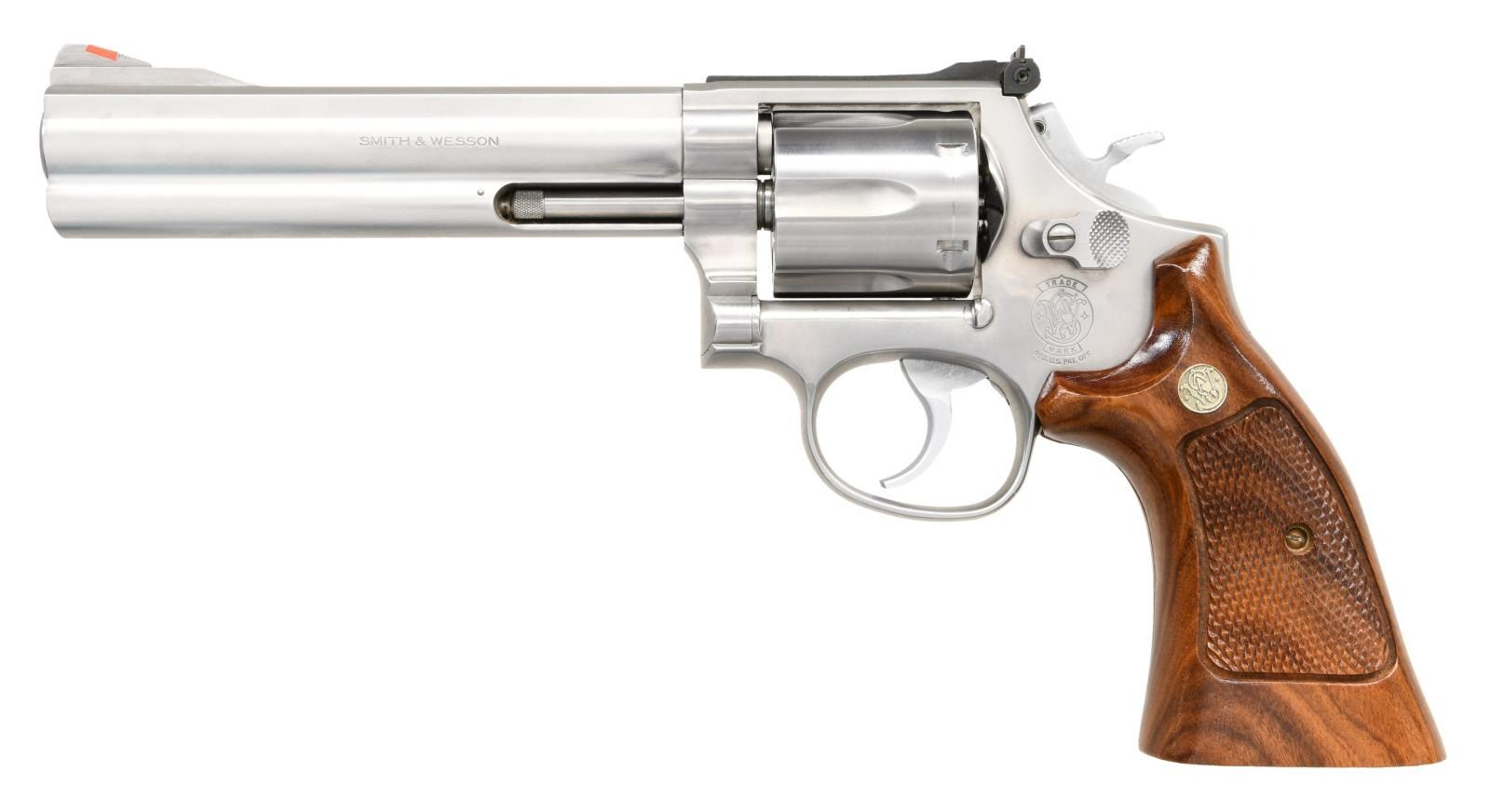 686-3 REVOLVER. Cal. 357 Mag. S# BJB8605. Bbl. 6". Mfg. 1992. Stainless steel, double action revolver built on the square butt L Frame w/ 3 screws. 6 shot fluted cylinder. Full lug, ejector shroud. 10 groove serrated front strap & backstrap. .375" checkered hammer & smooth trigger. Red ramp insert front sight w/ white outline micrometer click adjustable rear sight. Checkered hardwood grips w/ S&W medallions. CONDITION: All aspects indicate very little use. Very little carbon staining on frame & cylinder w/ only fine drag line. No visible damage on grips. Bright bore w/ strong rifling. Timing appears correct. (23-4930/JZ). MODERN. $500-700.