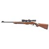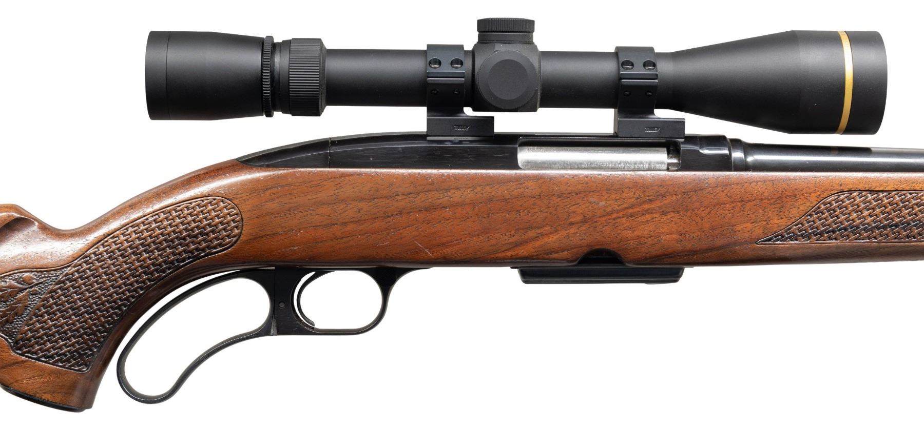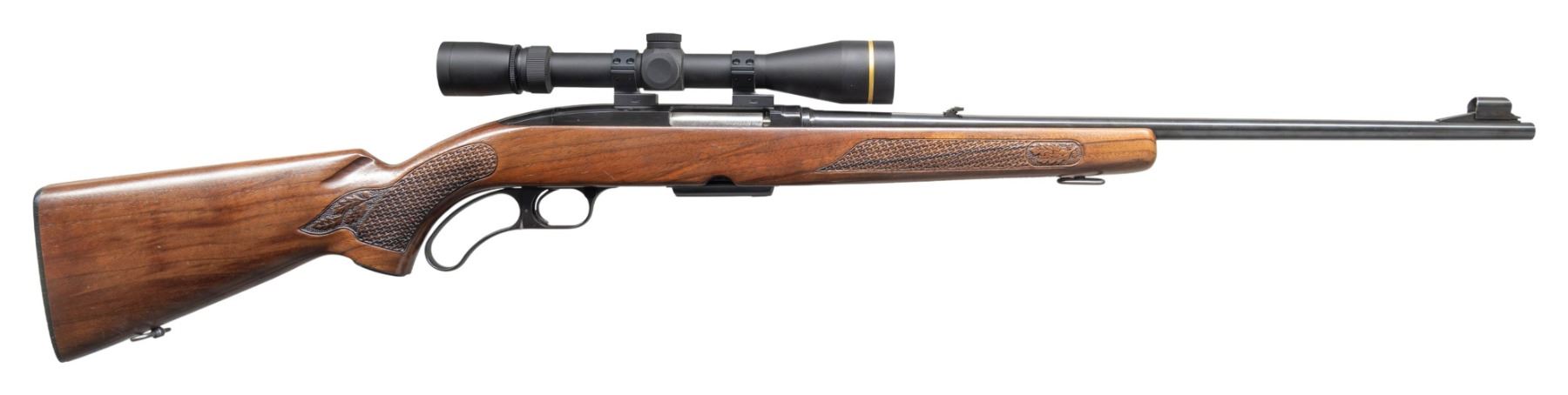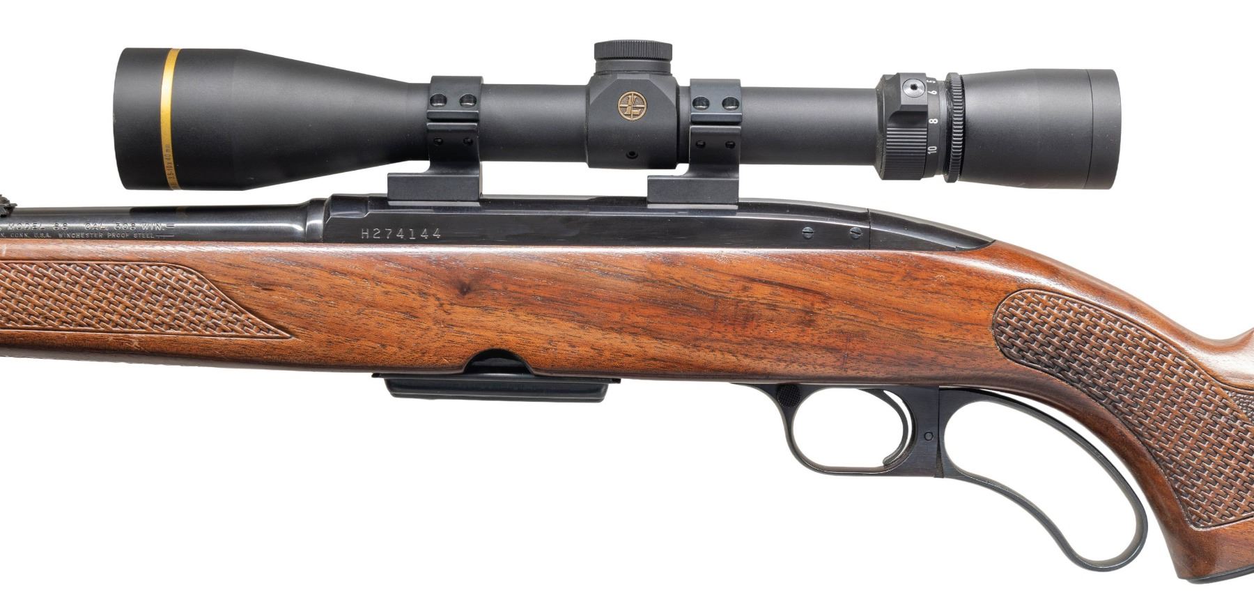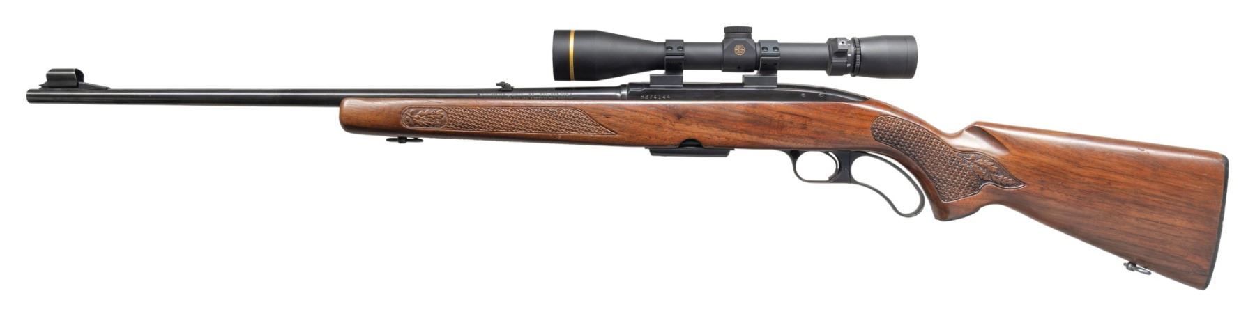 Cal. 308 Win. S# H274144. Bbl. 22". Model 88 lever action rifle mfg. by Winchester in 1972. Left side of the bbl. is marked with the model and cal. designations above Winchester's mfg. information. Metal components exhibit a blue finish overall, save for on the bolt, which is polished in-the-white. 1-piece pistol grip stock with Winchester checkered black synthetic buttplate, featuring woven pattern grip panels on the forearm and pistol grip which terminate in acorn and oak leaf patterns on punch dot backgrounds. Ramped, hooded, and aluminum beaded blade front sight, with dovetailed folding leaf U-notch rear sight. Receiver is mounted with a Leupold VX-3i 3.5-10x40mm scope. MAGS: 1 4-rd. CONDITION: metal components are excellent, retaining nearly all of their original factory blue finish, showing a few spots of light edge wear and a few minor superficial handling marks overall. Near mirror bore, exhibiting a few small spots of what appears to be light surface oxidation, while retaining well defined rifling throughout. Proper manual mechanics. Stock shows scattered superficial handling marks, scratches, and small impressions, but otherwise remains sound. Scope retains a clear and sharp optic. (25-4018/MLW). CURIO. $600-900.