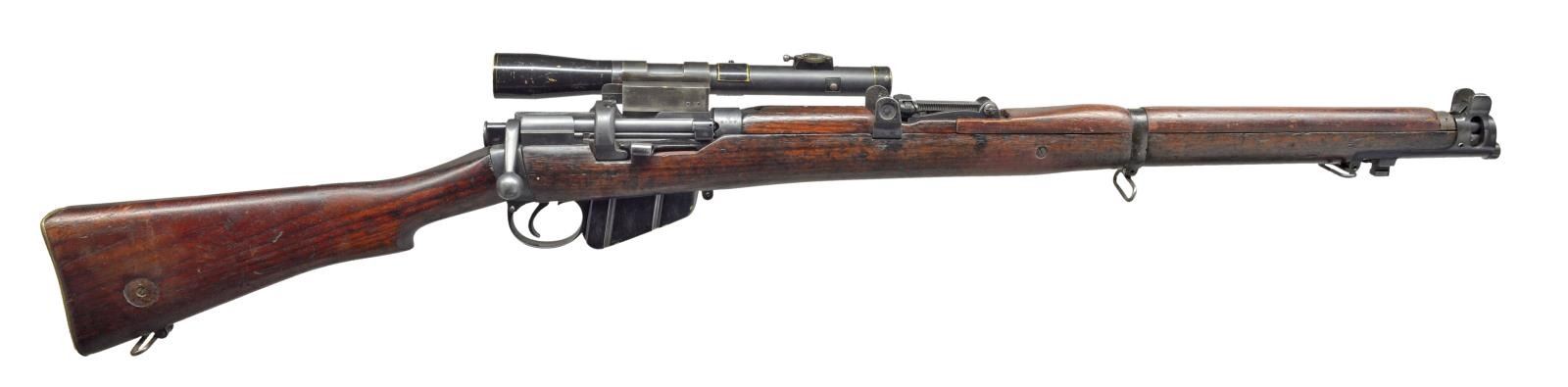 ACTION SNIPER RIFLE. Cal. 303 Brit. S# U6439. Bbl. 25 1/8". S# matches on receiver & bolt. Rifle was adopted to fill demands for sniper rifles during WWI & they were standard issue MKIII & MKIII "star" rifles & fitted w/ various makes of telescopes. The Periscopic Prism Company of London contracted to make a quantity of these rifles, however the contract was eventually taken over by the ministry of munitions due to problems w/ in the company. These rifles were slowly replaced by the pattern 1914 Sniper Rifles which had a stronger action. The SMLE Sniper Rifles were declared obsolete in 1921 & most were returned to Weedon to be stripped & the telescopes were sold. Rifle import marked on right receiver rail. Rifle marked on right side of butt socket w/ crown "GR" "ENFIELD" "1915" "SHTLE" "III". Receiver ring marked on left side w/ crown "BNP Proof" & Crown ER & "crossed flags", view mark & "P." "Crown 35" "E" "D" "31". Receiver markings on right rear of butt socket include 2 "X"'s & "S" possibly indicating rifle sold out of service. Bbl. marked behind rear sight base w/ "SC" indicating (small cone) enlarged for Mark 7 Ball & "HV" high velocity for use w/ Mark 7 Ball. Tangent rear sight w/ windage adj. graduated to 2000m. Blade front sight. Volley sights are present. Rear aperture is replacement. Receiver fitted w/ mag. cutoff. Nose cap has solid protective ears, bayonet lug & stacking swivel. Bolt has rnd. cocking piece. Walnut stock set. Front handguard is replacement. Buttstock has brass trap buttplate & steel marking disk w/ an "L". Transverse screw at front of trigger guard is not present. Rifle has steel dovetail scope mt. w/ spring catch & fitted to left side of receiver & secured by 5 screws. The approx. 2 power telescopic sight is offset to the left of bore line. Scope marked on top "PERISCOPIC PRISM COMPANY LTD. LONDON" Additionally marked w/ broad arrow. Scope has brass & steel construction w/ range drum mounted on top graduated from 200 to 600yds. Post reticle w/ pointed top. Scope adj. for focus. MAGS: replacement 10 rd. CONDITION: stock set has moderate wear, dents, scratches & staining throughout commensurate w/ long, careful service. Forend has period repair of forend extending from the butt socket underneath the folding volley sight to the receiver ring, ending in a dovetail. Neat replacement wood repair is approx. 3/8" wide. Forend has sm. crack above trigger on left side between brass reinforcing pin & volley sight aperture. There are sm. chipping issues around edges of trigger guard. Front handguard has sm. missing chip on forward right end. Receiver bolt & trigger guard have lg. percentage of original finish. Rear sight nose cap & several screw heads have enhanced finish. Volley sight aperture has notable pitted appearance. Scope mt. has notably thin finish w/ light wear. Telescope tube has worn, blue finish w/ areas of peppery oxidation. Brass components have a good amount of original black finish w/ flaking & scratches. Adjustments work freely, optics appear clear & serviceable although left horizontal bar of reticle has appearance of 2 sm. perpendicular "hairs". Bore is shiny w/ lightly worn lands. (21-1556/RW). CURIO. $4,000-6,000.