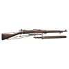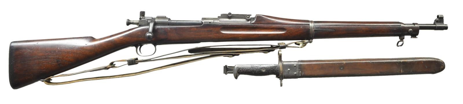SPRINGFIELD BOLT ACTION MILITARY RIFLE W/ MODEL 1905 BAYONET. Cal. 30-06. S# 85293. Bbl. 24" marked behind front sight “SA” “flaming bomb” & “10-06”. Rifle produced in 1906 as indicated by S# & bbl. date w/ correct features. Ladder rear sight graduated to 2850 yards w/ volley notch. Sm. dished, grooved & knurled elevation & windage knobs. Blade front sight w/ unmarked blued steel sheet metal sight cover. Bayonet lug is not marked w/ “H”. Bolt is marked under safety lug w/ “1” & “M”. Bolt & extractor have gas escape holes. Safety & cutoff have serif letters. All milled furniture. Smooth narrow trigger. Smooth trap buttplate. Matching walnut stock set. Stock is marked on left side over trigger guard w/ boxed “E.L.H.” in block letters. Marked under grip w/ encircled script “P” proof. Stock tip is marked w/ tiny “s”. Stock has high wood along receiver. No recoil bolts. Handguard w/ sight protection swell w/o sighting groove made w/o metal clips. “Rock Island” marked 1907 sling. Markings are faint but include “Rock Island Arsenal” “190?” & “C.H.T.” Sling has extensive wear, scuffing & cracking. UNATTACHED ACCESSORIES:  nickel-plated brass oiler. Model 1905 bayonet w/ 16" fullered bright blade. Partially blued Ricasso marked on left side “SA” “flaming bomb” & “1906”. Marked on right side w/ “U.S.” & S#. Grooved walnut grips. First type Model 1905 scabbard. Visible markings include “R.I.A.” “1_06” & “H.S.K”. Blade is shiny w/ sm. spots of peppery oxidation. Balance of metal has traces of blue turning gray & patina. Grips are well worn w/ handling marks. Leather scabbard w/ steel throat has wear, scuffing & handling marks throughout. Stitching is loose at scabbard tip. Markings partially obscured by abrasion. Scabbard metal parts turning gray & patina. CONDITION: stock set has moderate wear, scratches & handling marks commensurate w/ long service. Approx. 1-1/2" crack behind receiver tang & 2" crack w/ missing sliver on left side of forend behind upper band. Handguard has long crack extending approx. 5" between rear sight & lower band. Metal has traces of original blue but is turning generally gray w/ patina. Buttplate has notably oxidized appearance. Good shiny bore w/ lightly worn lands. PROVENANCE: formerly of the Scott Duff collection. (22-4168/RW). CURIO. $2,000-3,000.