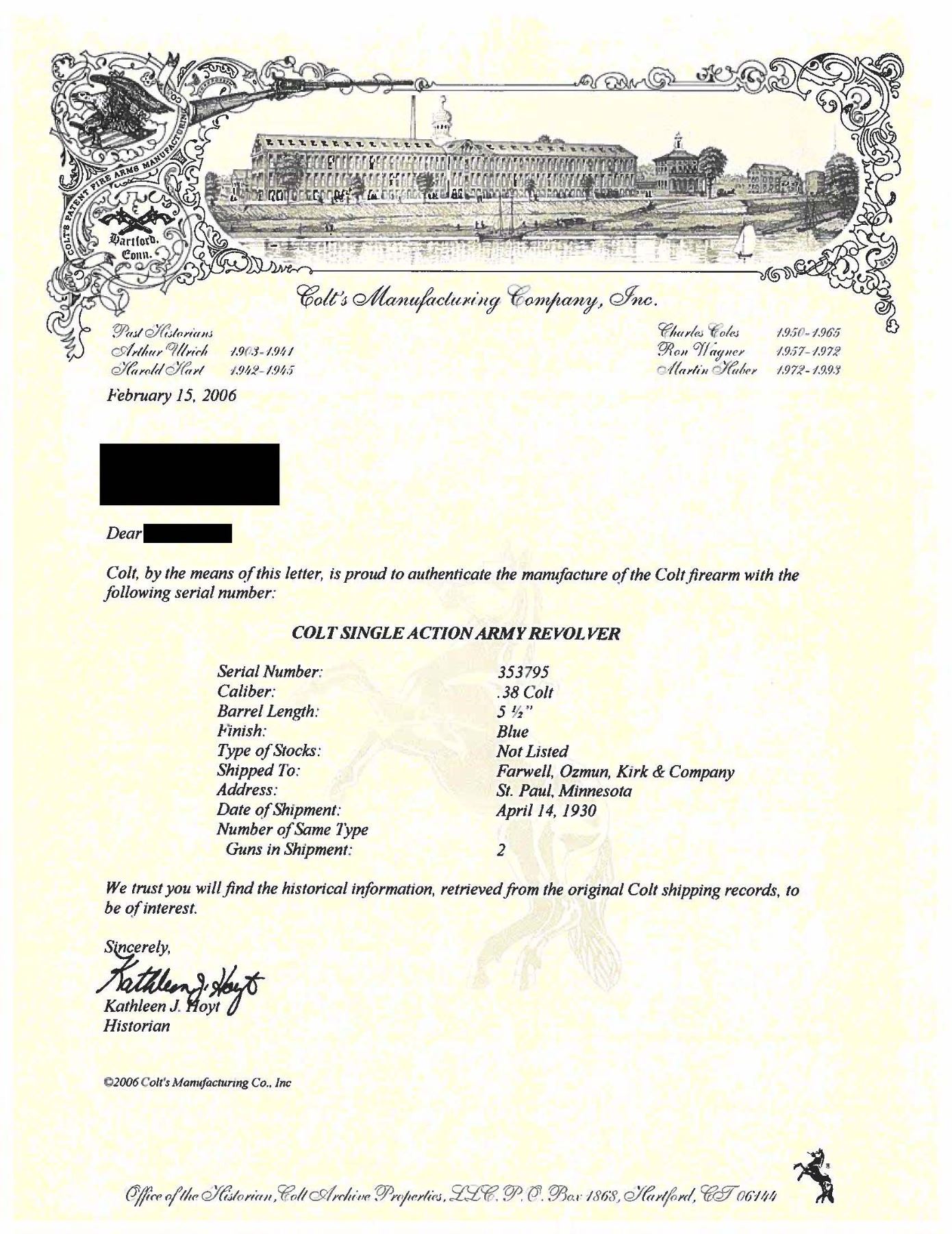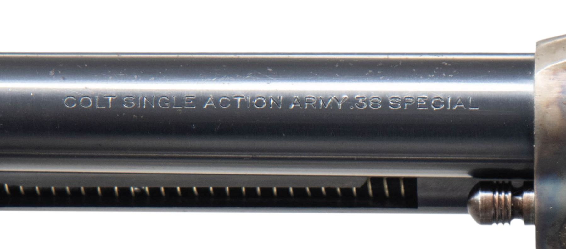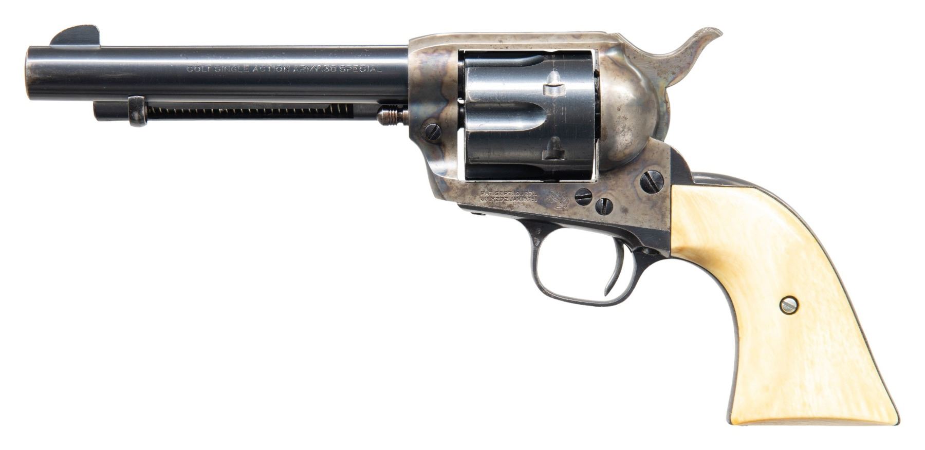 SAA REVOLVER IN DESIRABLE 38 COLT SPECIAL. Cal. 38 Colt Special. S# 353795. Bbl. 5 1/2" with blade front sight. Page 136 of "THE 36 CALIBERS OF THE COLT SINGLE ACTION ARMY" By David F. Brown page 136 lists 82 of these were mfg by Colt. There can be a serious amount of confusion when it comes to these guns as it is essentially the same as the 38 S&W special with the difference being the flat nose bullet. Subject revolver along with other examples mfg in the time period of 1929-1932 state on the letter "38 Colt" while the barrel is marked "COLT SINGLE ACTION ARMY 38 SPECIAL". Other know examples are are S# 354523 (pictured on page 135), 353778 and 354931. Cyl. chamber have same shoulder as 38 Special chambered revolvers. Even if one were to include standard 38 S&W Special 1st Gen revolvers into the count utilizing Brown's numbers, the total would still be a paltry total 107 revolvers. In comparison to the scarce & desirable 44 Special caliber (506), the rarity factor would be over 4.5 times greater. Bbl is original to the gun as left side die break in letter "O" resembling a reverse "C" is present with is found in revolver mfg. in the 1930 time period. Revolver features a blue & case hardened finish. Matching numbers on right side of grip frame, trigger guard frame & "95" on rear of cyl. 2 Piece replacement smooth white grips; grip screw is replacement. UNATTACHED ACCESSORIES: one vintage original full box of 50 cartridges "US 38 CALIBRE COLT SPECIAL". Headstamps read U.S.C. CO. / 38 COLT SPL". Box & cartridges are in very good condition. Colt factory letter stating the following: "Serial Number: 353795 / Caliber: 38 Colt / Barrel Length 5 1/2" / Finish: Blue / Type of Stocks: Not Listed / Shipped To: Farwell, Ozmun, Kirk & Company / Address: St. Paul, Minnesota / Date of Shipment April 14, 1930 / Number of Same Type Guns in Shipment: 2". CONDITION: bbl. & ejector housing retain 90% original blue with light high edge wear. Frame & hammer retain 80%+ original case colors with scattered areas of light peppery oxidation. Cyl. retains 85% original blue with light sharp edge wear, minor scratches, cyl. drag line & 1 small area of cleaned oxidation. Trigger guard & grip frame retain 60% original blue with notable thinning to straps. Grips are slightly undersized, in very good condition and have acquired a pleasing yellow patina with age. Bright bore with crisp rifling. Mechanically excellent. A very rare & seldom seen Colt SAA for the avid SAA collector! (25-6047/BH). CURIO. $12,500-17,500.