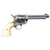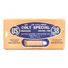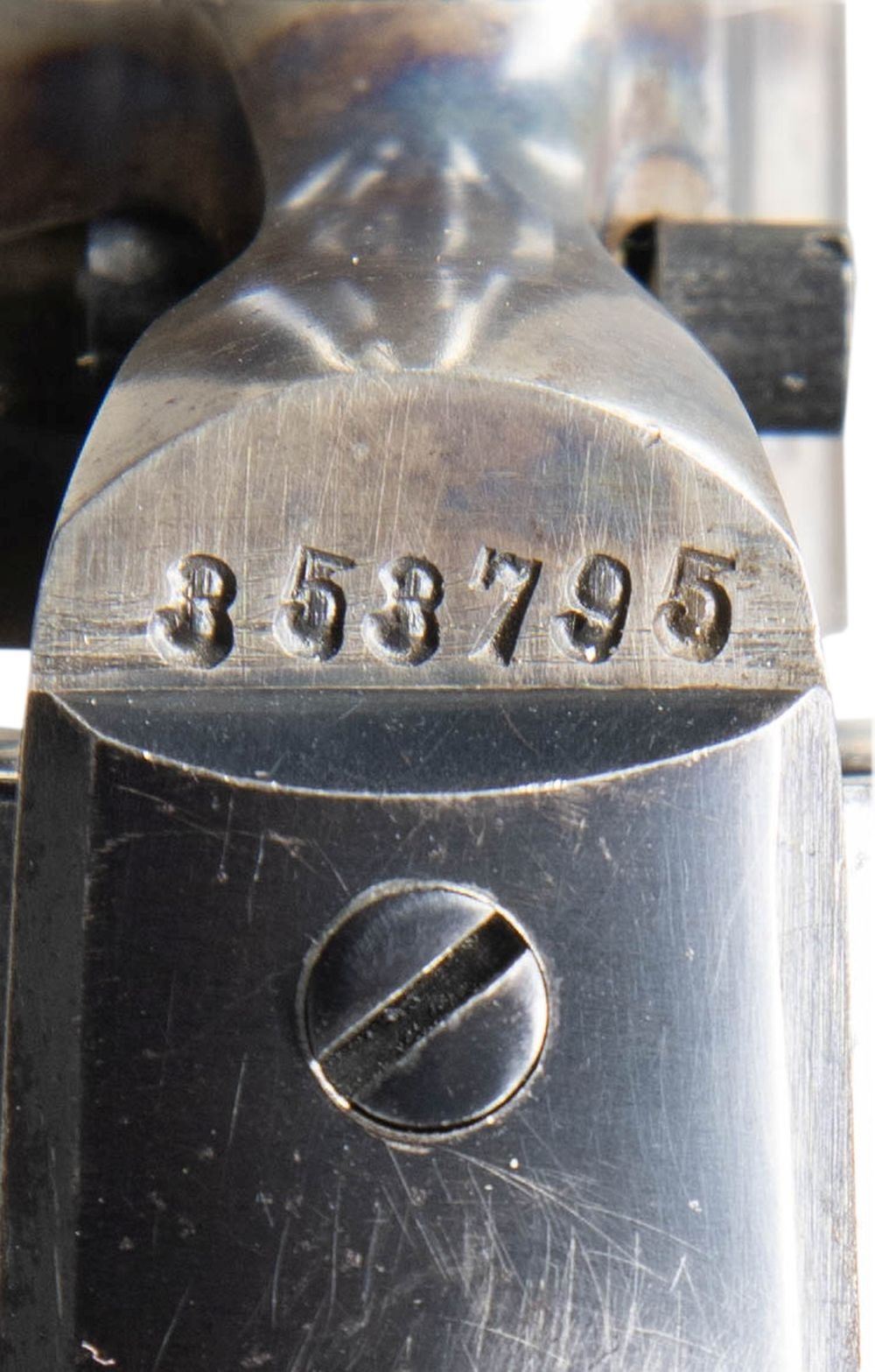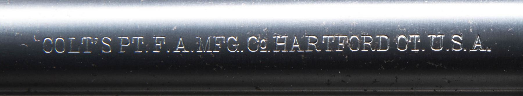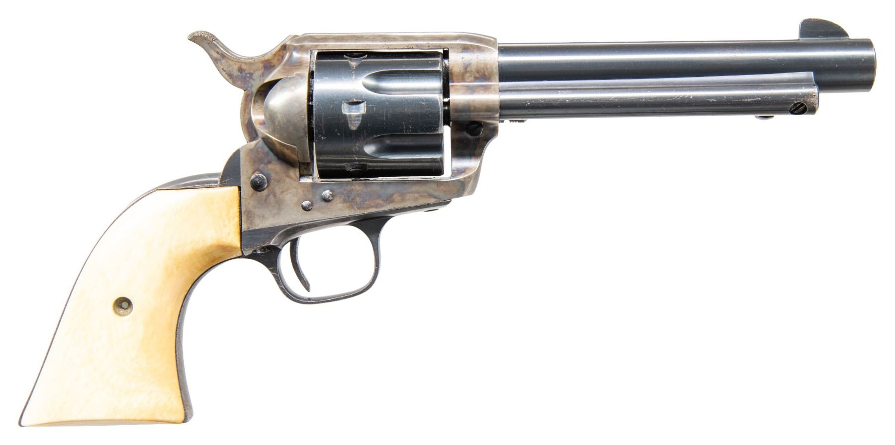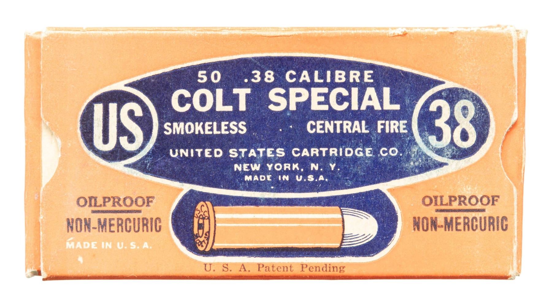 SAA REVOLVER IN DESIRABLE 38 COLT SPECIAL. Cal. 38 Colt Special. S# 353795. Bbl. 5 1/2" with blade front sight. Page 136 of "THE 36 CALIBERS OF THE COLT SINGLE ACTION ARMY" By David F. Brown page 136 lists 82 of these were mfg by Colt. There can be a serious amount of confusion when it comes to these guns as it is essentially the same as the 38 S&W special with the difference being the flat nose bullet. Subject revolver along with other examples mfg in the time period of 1929-1932 state on the letter "38 Colt" while the barrel is marked "COLT SINGLE ACTION ARMY 38 SPECIAL". Other know examples are are S# 354523 (pictured on page 135), 353778 and 354931. Cyl. chamber have same shoulder as 38 Special chambered revolvers. Even if one were to include standard 38 S&W Special 1st Gen revolvers into the count utilizing Brown's numbers, the total would still be a paltry total 107 revolvers. In comparison to the scarce & desirable 44 Special caliber (506), the rarity factor would be over 4.5 times greater. Bbl is original to the gun as left side die break in letter "O" resembling a reverse "C" is present with is found in revolver mfg. in the 1930 time period. Revolver features a blue & case hardened finish. Matching numbers on right side of grip frame, trigger guard frame & "95" on rear of cyl. 2 Piece replacement smooth white grips; grip screw is replacement. UNATTACHED ACCESSORIES: one vintage original full box of 50 cartridges "US 38 CALIBRE COLT SPECIAL". Headstamps read U.S.C. CO. / 38 COLT SPL". Box & cartridges are in very good condition. Colt factory letter stating the following: "Serial Number: 353795 / Caliber: 38 Colt / Barrel Length 5 1/2" / Finish: Blue / Type of Stocks: Not Listed / Shipped To: Farwell, Ozmun, Kirk & Company / Address: St. Paul, Minnesota / Date of Shipment April 14, 1930 / Number of Same Type Guns in Shipment: 2". CONDITION: bbl. & ejector housing retain 90% original blue with light high edge wear. Frame & hammer retain 80%+ original case colors with scattered areas of light peppery oxidation. Cyl. retains 85% original blue with light sharp edge wear, minor scratches, cyl. drag line & 1 small area of cleaned oxidation. Trigger guard & grip frame retain 60% original blue with notable thinning to straps. Grips are slightly undersized, in very good condition and have acquired a pleasing yellow patina with age. Bright bore with crisp rifling. Mechanically excellent. A very rare & seldom seen Colt SAA for the avid SAA collector! (25-6047/BH). CURIO. $12,500-17,500.