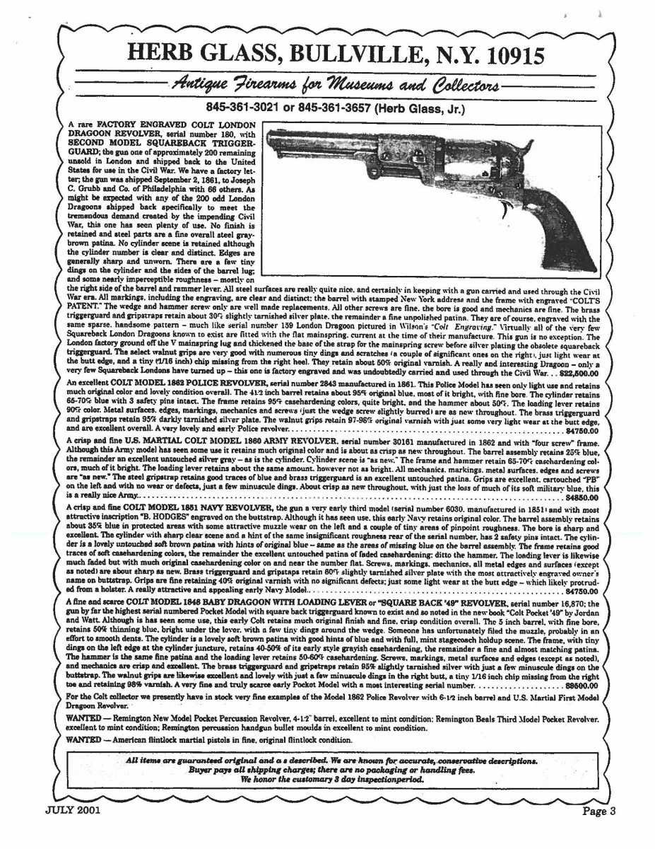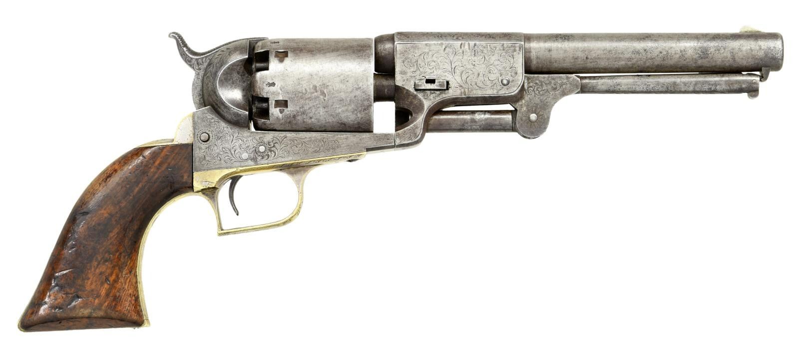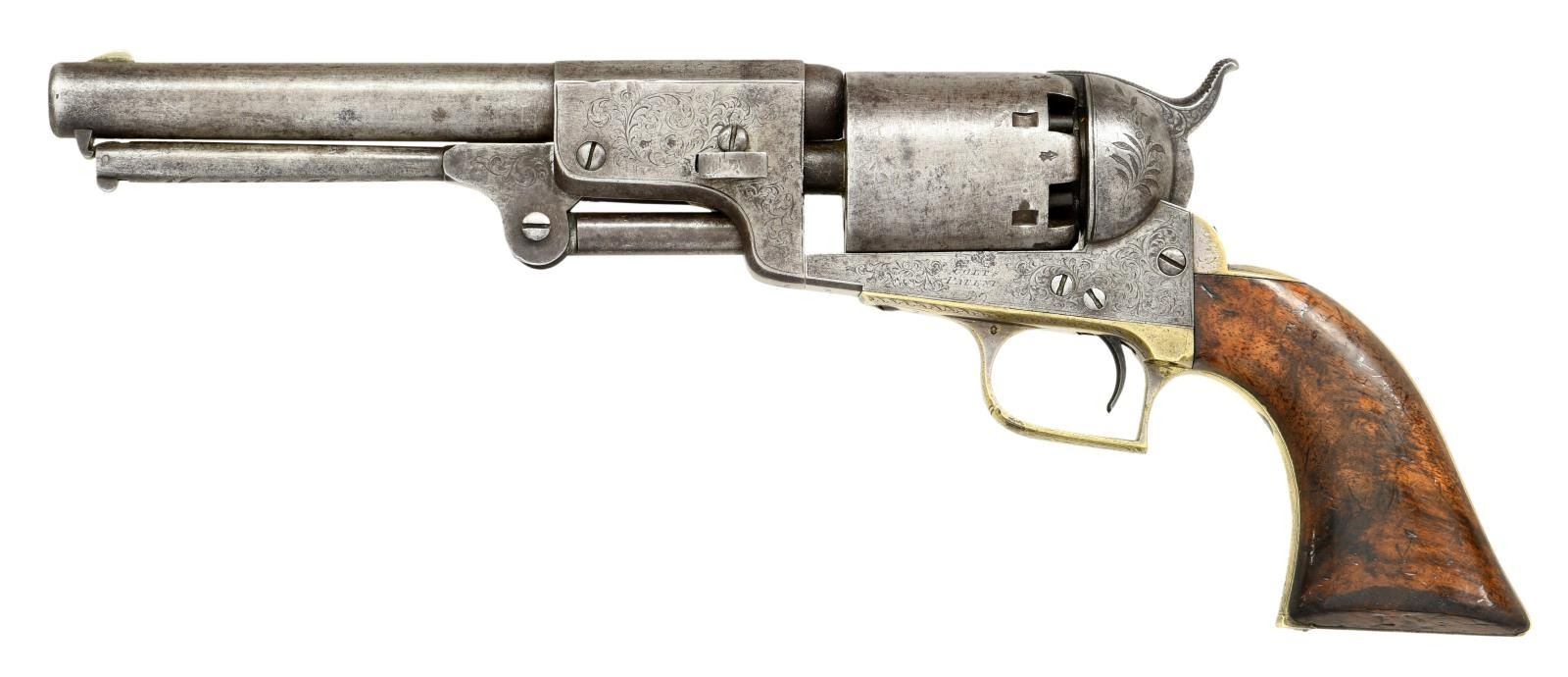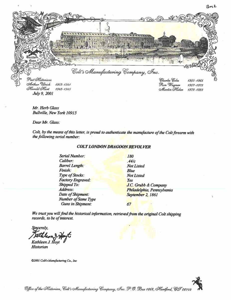 2ND MODEL DRAGOON REVOLVER. Cal. 44. S# 180. At the beginning of the Civil War Colt revolvers were in great demand. Colt's London office had dragoons still in inventory and most were shipped back to America to meet the tremendous demand caused by the war. Colt factory letter states this gun was shipped to Joseph Grubb of Philadelphia with 66 other revolvers. Factory letter states it was factory engraved and shipped September 2, 1861. There are Grubb shipped guns with known Confederate identification & use probably sold through agents in St. Louis and other western cities accessible to Confederate agents early in the war. There are no more then one or two other examples of factory engraved squareback 2nd model London dragoons. Larry Wilson in his book "Colt Engraving" show serial number 159 in same configuration as this revolver from Lewis Yearout collection, Wilson states concerning S# 159: "The second model is an extreme rarity". Almost all London Colt revolvers had "LONDON" address with exception of the handful of Hartford-London dragoons which are marked with New York City address such as the example. Standard configuration, 7.5" octagon to round barrel, German silver front sight 1-line New York City address, characteristic sparse tight London scroll engraving on frame, recoil shields, hammer, barrel lug, rammer pivot, backstrap, and trigger guard. "COLT'S PATENT" engraved on left side of frame. Small English proofs observed on barrel and each cylinder chamber. This revolver no doubt saw used during the Civil War but it's still a sharp honest survivor. UNATTACHED ACCESSORIES: copy of Colt factory letter and copy of Herb Glass description in 2001 Gun Report. CONDITION: good to very good overall, no finish remains but fairly sharp edges with scattered dings and dents, holster wear at muzzle. No cylinder scene remains but matching S# 180 is sharp. Revolver is complete, matching throughout with exception of replaced wedge and hammer screw which are excellent restorations. Backstrap and trigger guard retain strong areas of original silver plate in protected areas. The fancy burl walnut grips retain about half of their original factory varnish. Mechanically revolver is fine, crisp rifled bore. PROVENANCE: Herb Glass sold this revolver which is pictured in his July 2001 Gun Report ad; William “Bill” Myers. (01-24547/JS). ANTIQUE. $15,000-20,000.