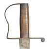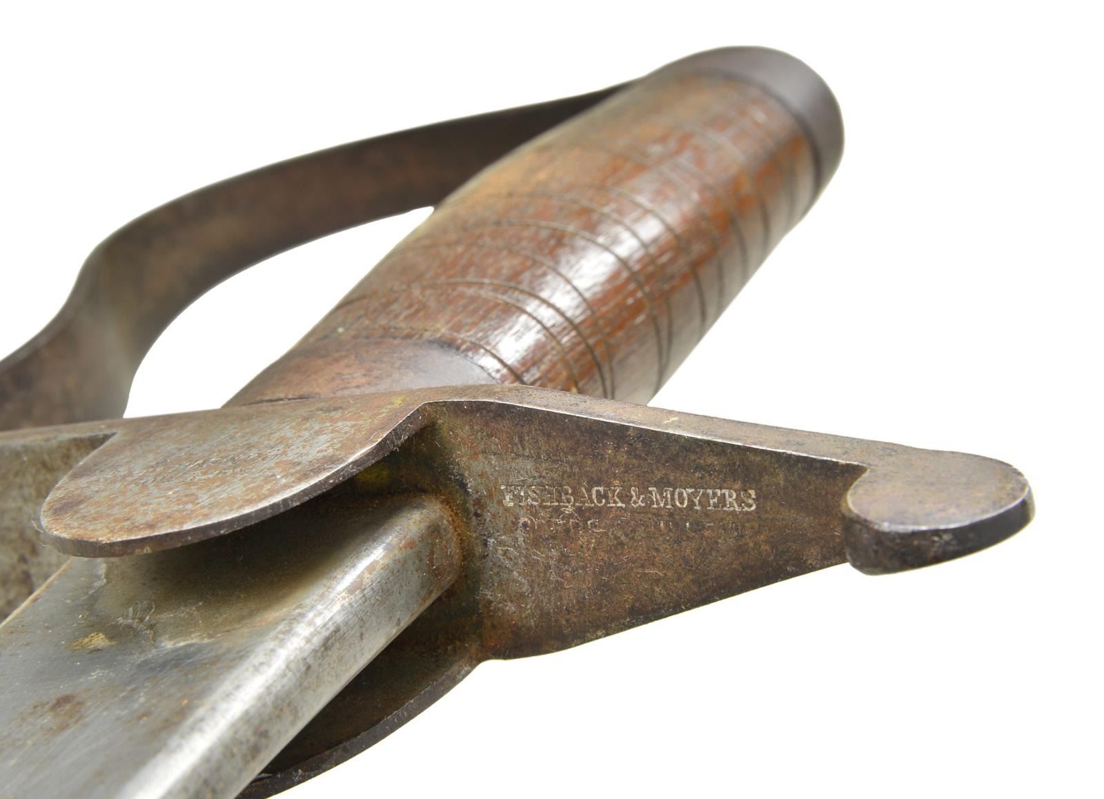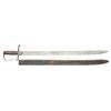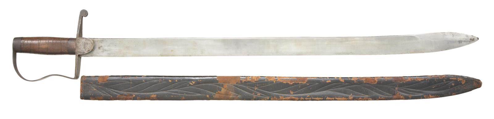 VIRGINIA MADE CONFEDERATE SWORD WITH ORIGINAL SCABBARD, CAPT. WILLIAM C. SCOTT, “GORDONSVILLE GRAYS” CO. C,  13TH VIRGINIA. 34” overall, 29.5” single edged blade with 5” sharpened top edge at tip, iron stirrup guard, bulbous oval wood grip with 2 ferrules, grip lightly spirally carved incised lines going in opposite direction. The guard is stamped 3 times: “FISHBACK & MOYERS / GORDONSVILLE / VA”. This is the only example known, there is also a single Confederate bowie knife with same marking. Knife is pictured in 2012 text “Confederate Bowie Knives” page 173 with some background on Waller Fishback & George Moyer principal in prewar chair factory and postwar iron foundry. This sword was carried by Captain William C. Scott, 13th Virginia, later Quartermaster in Army of Northern Virginia. The sword originally came from Stone Mountain Relics in 1980s purchased by family member of Capt. Scott. William C. Scott formed his own company “Gordonsville Grays” in 13th VA April 17, 1861. He resigned January 27, 1862 and accepted commission March 14, 1862, in Crenshaw Light Artillery. Battery camped August 1863 on his Farm near Gordonsville, VA while he was captain in quartermaster department. George W. Moyers maker of sword was sergeant in Captain Scott’s company. CONDITION: fine overall, blade is bright with original luster as made, scabbard is solid and supple retaining most its original polished finish & tooling, with chipping, sewn belt loop or frog is long gone. (02-16877/JS). $8,000-12,000.