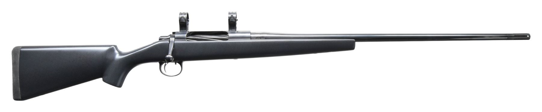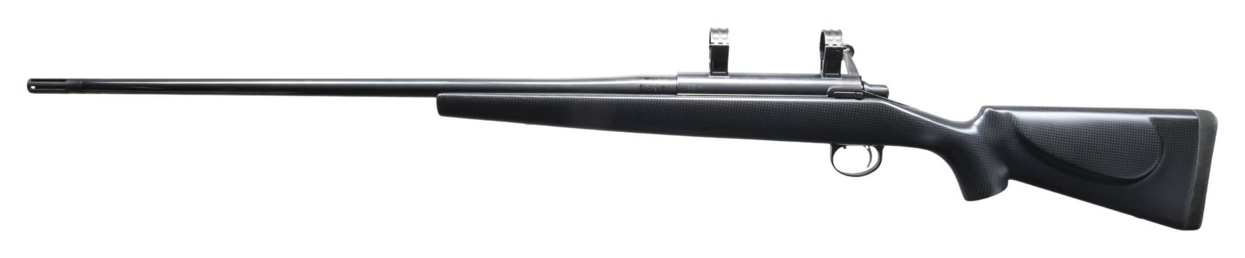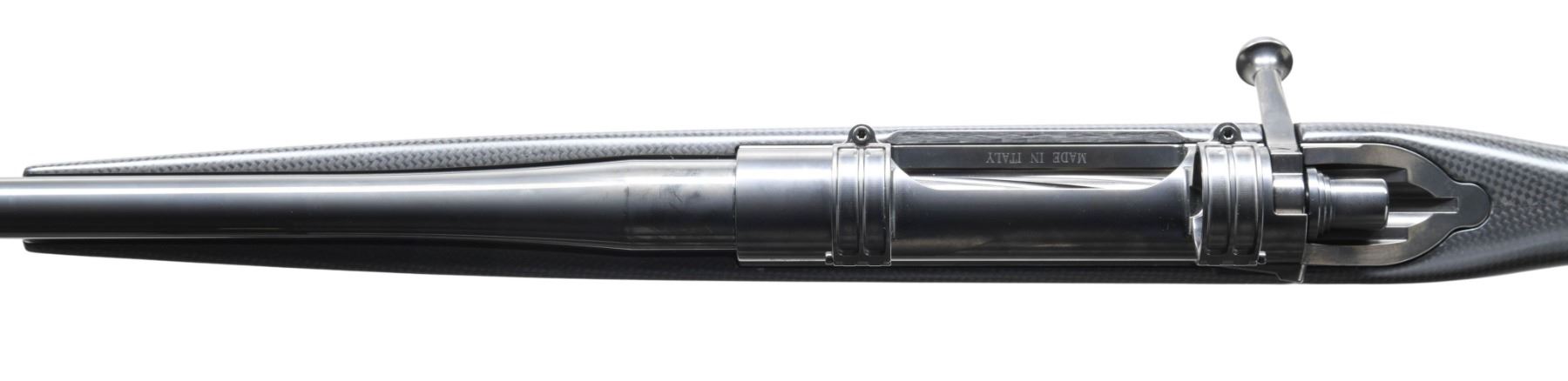 ACTION RIFLE. Cal. 300 Win Mag. S# 011. Kekki was an Italian builder of unique custom rifles and offered a large variety of features & finishes. Mfg. 2013-2018, imported by Lewis Drake & Associates of Murray KY until 2015. Bbl. 28" tapered round over patented slotted muzzle brake. 2 lug Titanium action featuring a spiral fluted bolt & integral 30mm scope rings. Blind box mag. w/ solid floorplate, polymer follower is mounted on 2 coil springs. Screw attached interchangeable bolt knob. Safety lever is located in forward portion of trigger guard. "Bix'n Andy" ball bearing adj. trigger. Carbon fiber cheekpiece stock w/ open threaded grommets for sling swivel attachment. LOP: 14 1/8" over solid black pad. WEIGHT: 9 lbs, 2.6 oz. UNATTACHED ACCESSORIES: 5 high quality Kekki rifle brochures. CONDITION: near excellent retaining over 98% finish. integral front scope ring screw is bent with thread damage not allowing it to seat to full depth. Bright near excellent bore. PROVENANCE: from the renowned collection of quality sporting arms from Lewis Drake together with inventory of Lewis Drake Associates. (25-3573/DS). MODERN. $1,500-2,000.
