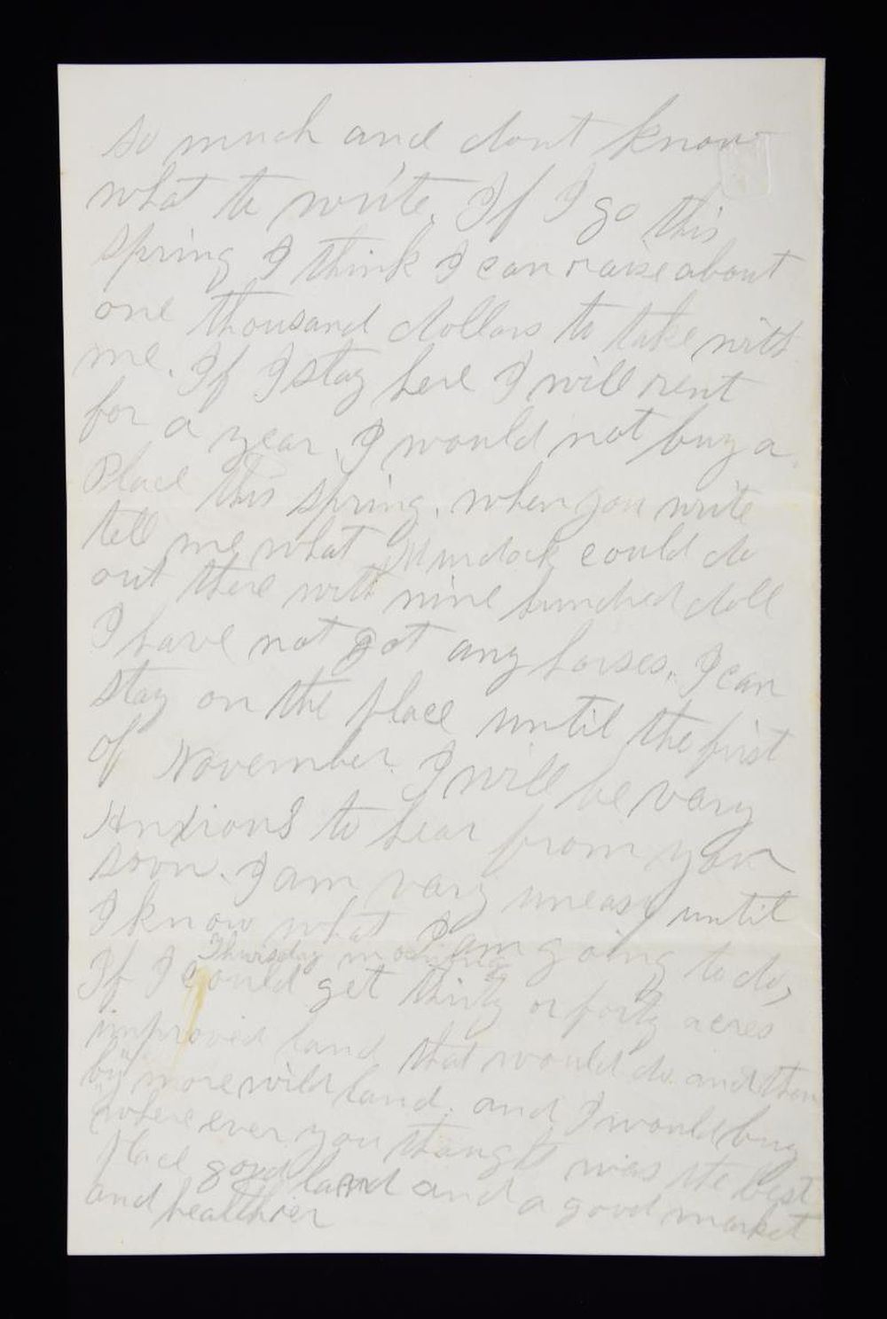 6 page ALS signed "Nev", written over 2 days, March 2-3, 1870 from Tontogany where he was selling the original Custer family homestead, written in pencil, this is only Nevin Custer ALS to his brother George we are aware in private hands. Nevin Custer (1842-1915) was the 2nd oldest of the Custer brothers and only one to survive Little Big Horn. All Custer memorabilia passed from either his children or Libbie as neither George, Tom, or Boston Custer had offspring. He tells George he will not arrive at Fort Leavenworth unannounced. The original envelope addressed to G. A. Custer at Fort Leavenworth accompanies missing stamp. "My dear brother.... I have been looking for a letter from you for some time to see what you thought was best for me to do. What do you think I had better do if I was to buy in Kan[sas] I would like to have a place of about eighty acres or nearly that close to some town pretty well improved with an orchard any way... I would like to go in April. Witch [sic] would be the best if I went to Kan[sas] to come out and look first or move right along. What town do you think you would buy near... If them soldiers would catch us coming in to the fort we would be arrested and put under guard for ninety days. We would not want to stop in Leavenworth no longer then to change cars for our destination...". CONDITION: very good. PROVENANCE: Swann's 2004; Martin Lane Historic & Western Americana Lifetime Collection. (02-21889/JS). $1,000-2,000.