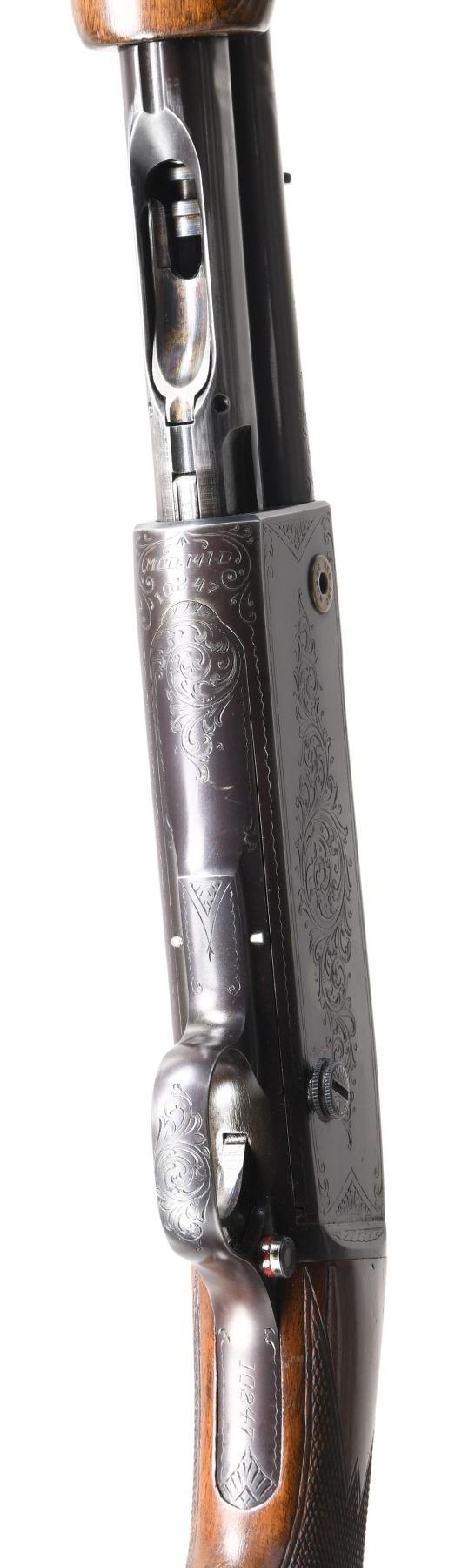 RIFLE. Cal. 35 Rem. S# 10247. Bbl. 24" round w/ ramp mounted bead front sight & sporting rear sight. Spiral grooved tubular mag. Action has factory D grade engraving. Engraving features wedges of vine type scroll w/ straight line & wavy borders that extend to upper & lower receiver areas along w/ breech end of bbl. Walnut forearm & hard rubber capped pistol grip stock w/ aluminum buttplate & factory hand checkering. Mfg. 1937. CONDITION: over 90% blue showing slide & edge wear. Stocks have areas of finish loss & crazing w/ scattered scratches & marks. Very good bright bore. PROVENANCE: The estate collection of Don "Duck" Combs. (24-2444/DS). CURIO. $4,000-6,000.