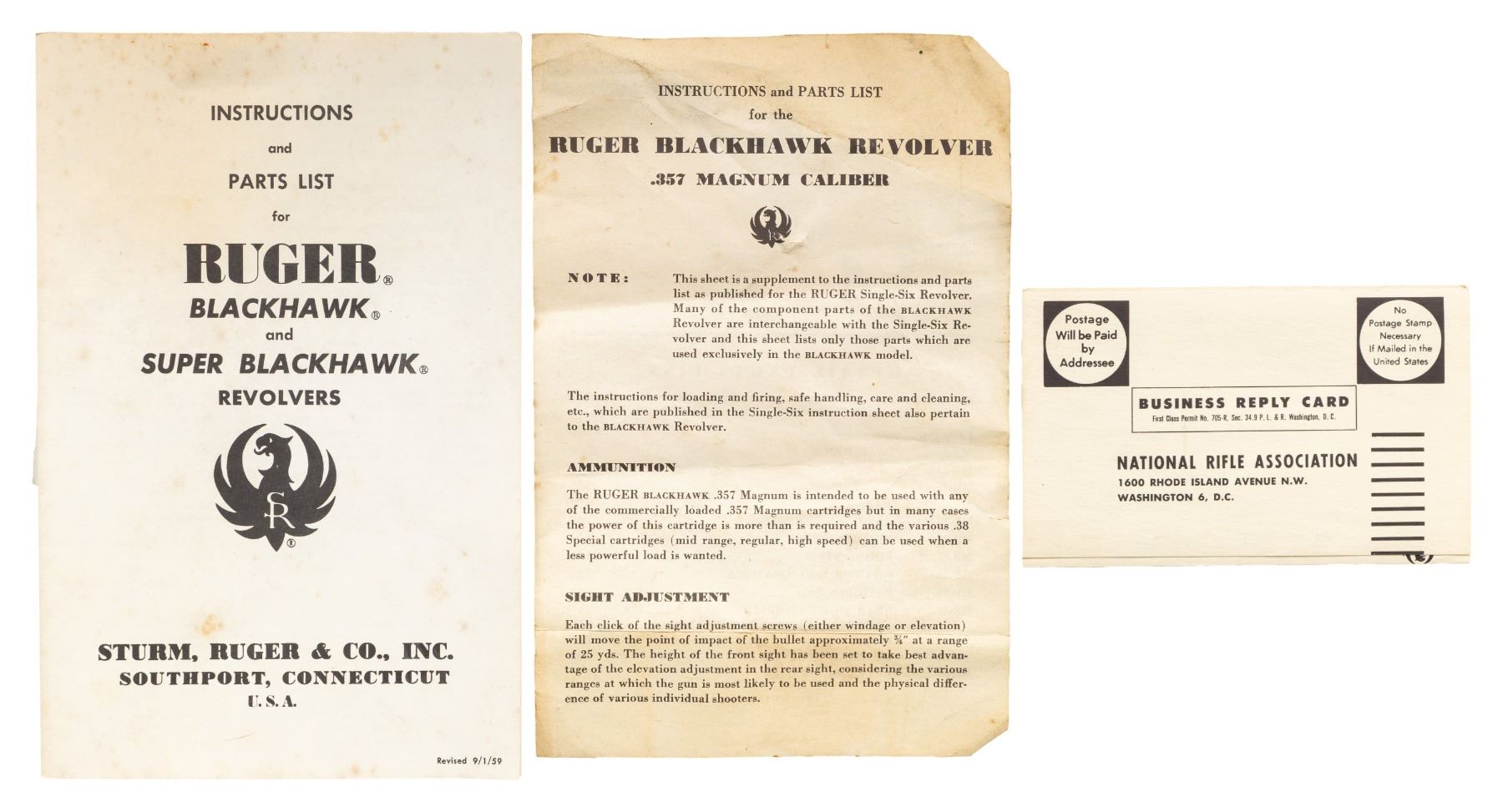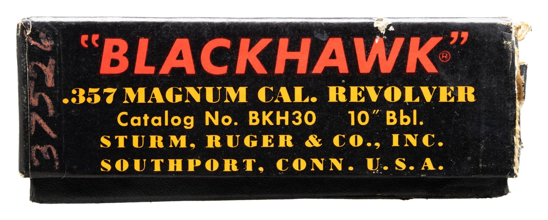BLACKHAWK REVOLVER. Cal. 357 Mag. S# 37526. Bbl. 10" with 8 groove rifling having ramped base and serrated blade front sight plus correct frame mounted Micro rear sight. Mfg. 1961 (1955-1962 for all Flat Tops) as Type 4 BKH30 within 36057 to 37743 serial range; 625 units. Extremely scarce model having steel straight slot ejector housing plus XR3 alloy grip frame with smooth varnished walnut grips; black eagle medallions. Does not have factory safety update parts. UNATTACHED ACCESSORIES: exceedingly rare matching numbered box with some cosmetic issues: right front corner of top is separated, top of lid has spots and streaks caused by unknown liquid and bottom has one corner almost separated. Very good period correct 4 fold "9/1/59" dated "BLACKHAWK and SUPER BLACKHAWK" manual plus very rare supplemental 357 parts list and instructions. Near excellent 3 section warranty card and NRA membership application. CONDITION: very good to excellent overall appearance with factory quality refinish. Very slight thinning at high points to include muzzle area and tip of ejector rod housing. Cylinder has slight turn line wear. Grip frame has some very light thinning seen mostly on trigger guard bow. Grips are very nice with barely noticeable handling marks. Near excellent bore. Rare offering complete with box and all paperwork. PROVENANCE: Estate of Groves Herrick.(25-5686/NW). CURIO. $2,500-3,250.