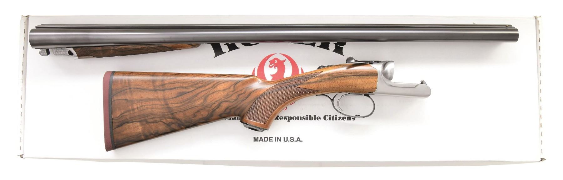 Cal. 12 Ga. 3" Mag. S# 460-01840. Bbls. (S# 00132) 28" with ejectors plus thin walled factory chokes of Mod. and Full. Mfg. 2005 (2004-2006) as model KSXS-1228 having single selective trigger and model number 04601. Rare because very few were made with pistol grip buttstocks; most were English style straight gripped buttstocks. Consignor purchased this from Robert Davis on Jan. 6, 2014. Davis was the supervisor of stocks at the Newport facility and had this made specifically for him with a "Turkish walnut" checkered stock that is simply spectacular in appearance; normal stock set was AAA American Walnut. LOP is 13 1/2" rather than the normal Ruger 14 1/4" LOP. Standard splinter forend with push button release at its tip. Red rubber pad is the type used on many Ruger centerfire rifles and Red Label shotguns; normally fitted with serrated black plastic buttplate having Ruger logo at center. Stock length is ideal for person of smaller stature or while shooting with thicker clothing. Tooling for the Gold Label was moved from Newport, NH to the Prescott, AZ facility in 2006 with the intention of continuing production (listed in 2008 catalogue); this failed to happen. Consignor states that manager in charge of the model stated that just under 1,000 were actually sold to the public with the balance being destroyed; serial numbers known up to 460-03361. UNATTACHED ACCESSORIES: original matching numbered white rectangular box with proper label and interior compartmental boxes for buttstock, barrels, etc. Spare chokes of IC (2) and MOD (1), manual, safety lock, factory choke wrench and consignor's purchase bill of sale from Ruger stock manager, Robert Davis. CONDITION: slight separation of red rubber and black base of pad at toe. Balance of shotgun has near excellent exterior appearance. Each barrel has 2 slight radial inward dents aligned with forend attachment lug that are only noticeable on the left barrel with close scrutiny; from about 2 o'clock position to 5 o'clock. Right barrel is slightly more noticeable at 7 to 10 o'clock positions. Both sets of dents likely occurred with attachment lug installation. A quick straight view misses these flaws as ones eye is drawn to the smooth brightness at mid bore. A fine classic double of very limited production. (24-5877/NW). MODERN. $2,500-3,500.