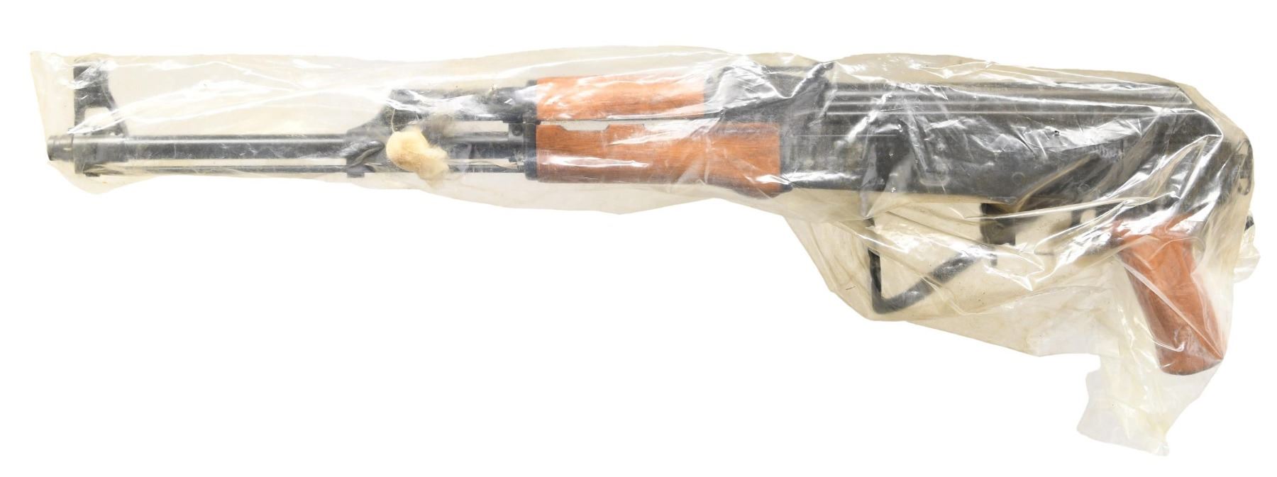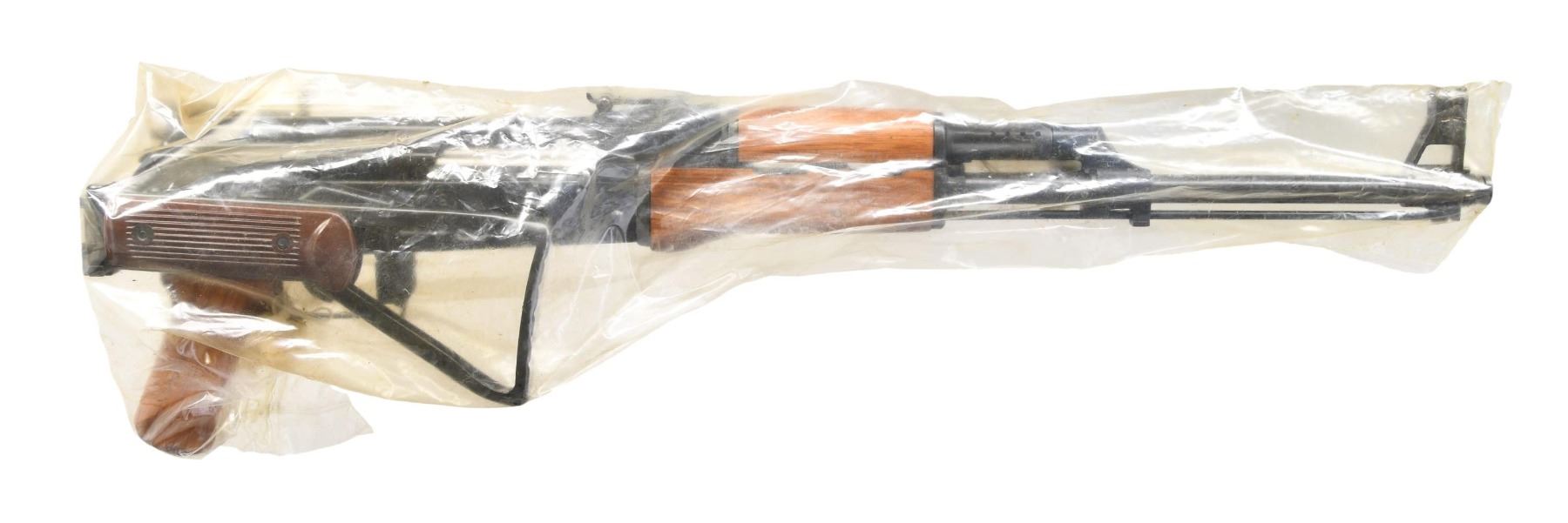 SEALED IN PLASTIC NORINCO 56/S-2 RIFLE. Cal. 7.62x39. S# 800533. Bbl. 19". A very early semi-auto AK-47 variant imported from China w/ the desirable right-side folding stock w/ Bakelite cheek piece. Blued finish on exposed metal surfaces. Front trunnion marked "56S-2" along w/ the triangle 66 Arsenal mark. Correct yellow/red tinted wooden furniture & reinforced stamped receiver. Proper flush thread protector in front of hooded post front sight. Gas block/ bayonet lug play host to on board cleaning rod. Tangent rear sight marked to 800 meters. Right side controls. Very desirable side folding stock. This rifle is still sealed in bag as it left Norinco & unopened. MAGS:2 metal 30 rd. UNATTACHED ACCESSORIES: Rifle packaging is still intact including green canvas sling, oil bottle, owners manual & 2 of what are assumed to have been the 3 steel 30 rd. mags it was shipped with. CONDITION: All aspects indicate as new in box / wrap. The rifle is still sealed in the plastic it left Norinco in. It is very unusual to find an item like this still in its packaging. PROVENANCE: Lifelong Collection of Terrence McCarty. (24-467/JZ). MODERN. $1,200-1,800.