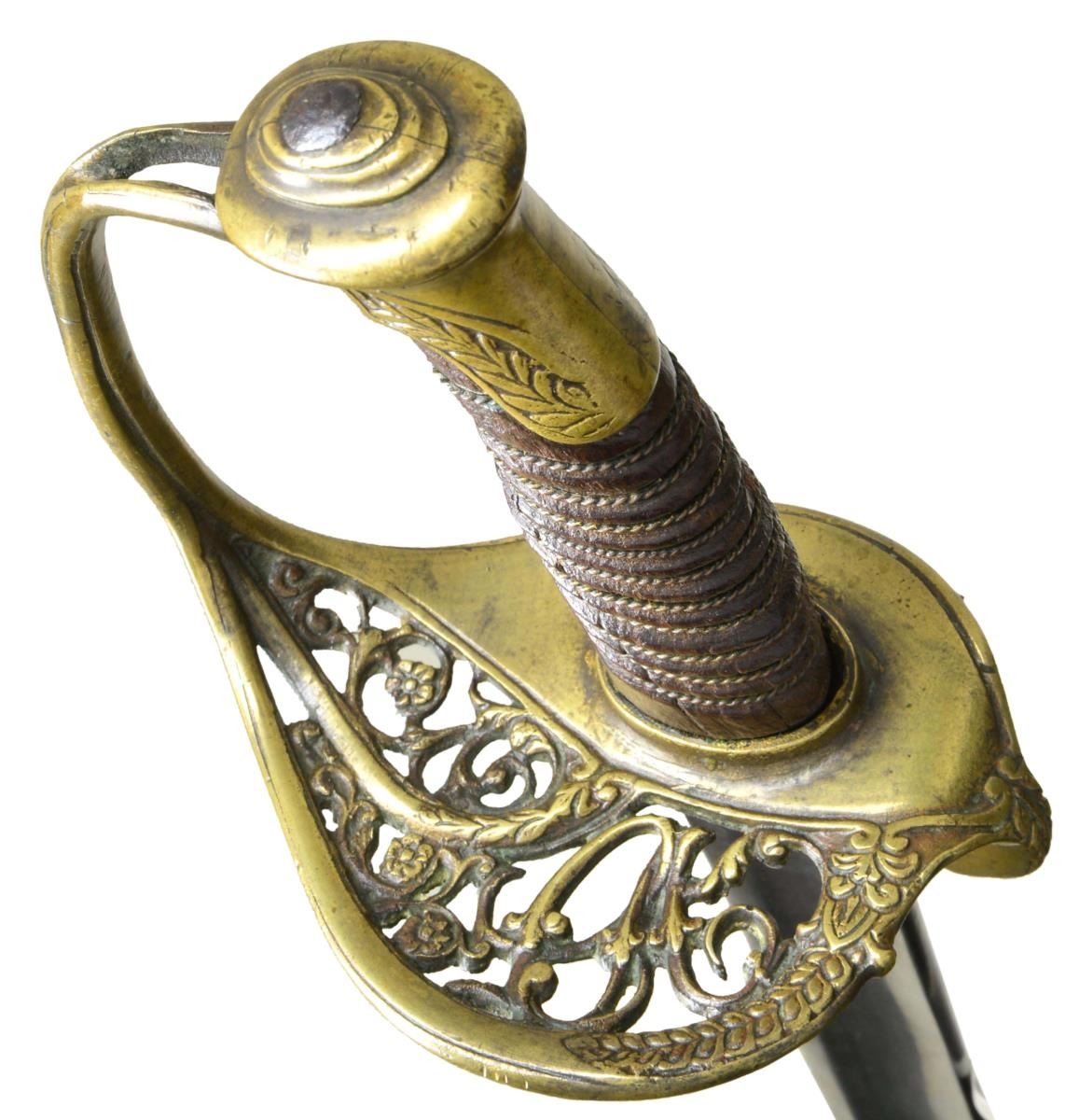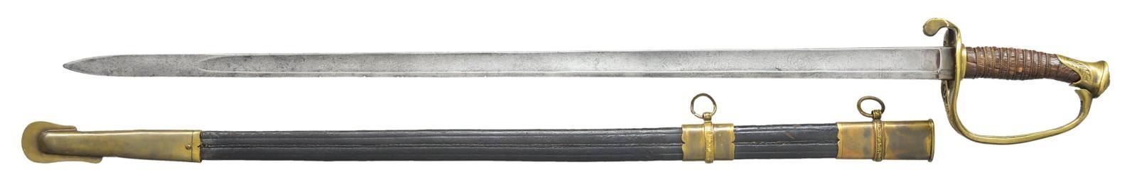 The unique pattern of which very few examples are documented are much larger than normal CS or US foot or staff officer swords, 33” long, 1.25” very wide blade with light indistinct etching. Classic New Orleans features: split seam pommel cap, 2 piece constructed knucklebow, pen-knife like ricasso, plain flat undecorated sides to quillon. The “CA” is in fancy script and possibly denotes “Crescent Artillery” of New Orleans. Scabbard is for display only and is well crafted New Orleans style recreation. CONDITION: good to very good overall, blade gray with long etched panels that nothing significant can be read, just floral and geometric designs. Point has small area of lamination showing quality of CS steel, several small nicks in cutting edge from use.The hilt is little loose as missing protective washer, someone has pushed a wood sliver along tang at base to tighten without diembling. Light mustard patina, Grip retains just tiny piece of original leather, rest has flaked off, but original twisted wire wrap sill retained. Recreated scabbard fits well. (02-17442/JS). $7,000-9,000.