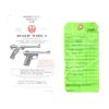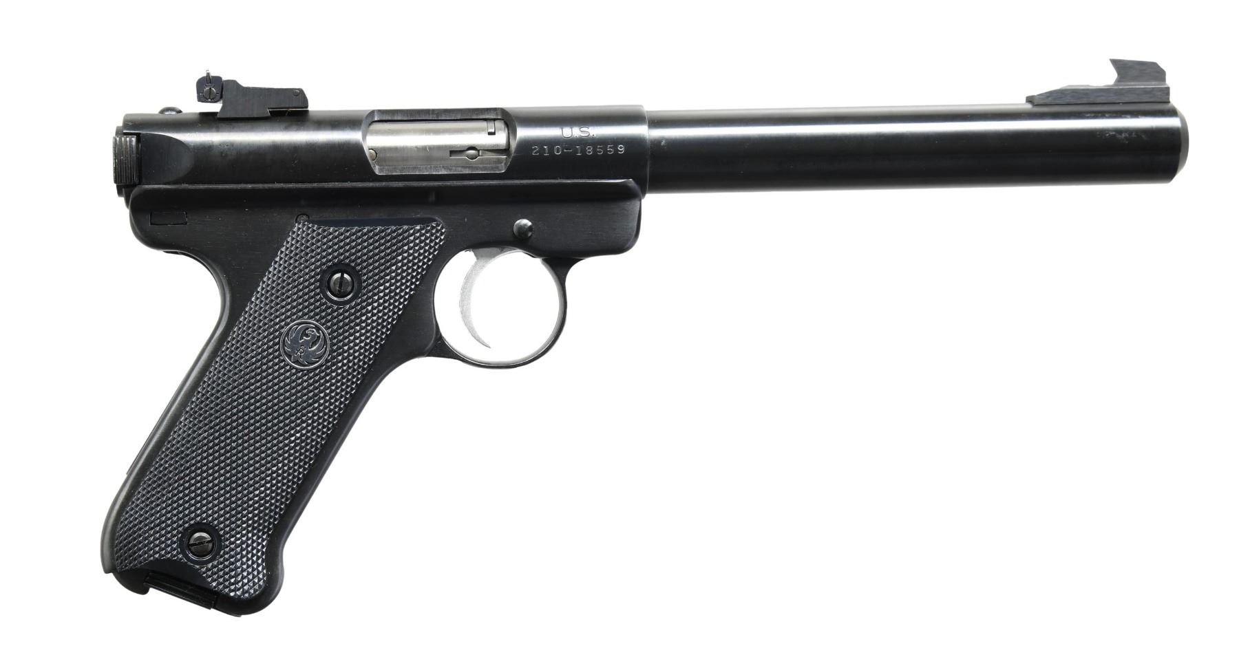 PAIR of MARK II SEMI-AUTO TARGET PISOLS. BOTH: Cals. 22 LR. 6 7/8" bull barrels with "warning marks" plus factory target sights; screw attached hooked blade on base at front and adjustable at rear of receiver. Mfg. 1986 within 2nd military contract of 964 units; 1st contract was for 17,439 units made from July of 1984 to August of 1985. RENE Ruger Reference guide states less than 20 believed to be in civilian hands; quite possibly the ONLY consecutive pair. Serial 210-19112 sold through Ruger befit auction in 2007 for $1,560 and 210-18516 in 2014 for $1,727. Total serial range (all in 210 series) was 210-00051 to 210-18668. Model designation is MK-678G (blued) with standard Mark II features of checkered black plastic grips (RH silver eagle medallion), last round slide lock, able to function bolt with safety engaged and silver serrated target trigger plus "U.S." over serial number. MAGS: 2 TOTAL; 1 factory 10 rd. with black plastic push button base having silver eagle medallion for each. UNATTACHED ACCESSORIES: for each: factory supplied yellow and black 1 piece box with military technical manual plus matching numbered green government hang tag with 4 separate stamped inspections (by 3 different people) dated in July of 1986; 2nd tag with 3 stamps (2 separate people). Outer shipping cartons (banded together as a unit) from Ruger to FFL in CO. CONDITION: all aspects of both near excellent with new and unfired appearances. 1). S# 210-18559. (23-6665/NW). 2). S# 210-18560. (23-6666/NW). BOTH MODERN. $2,000-2,750.