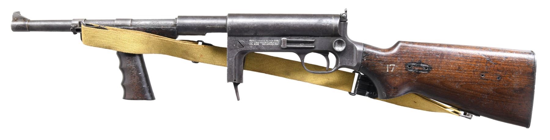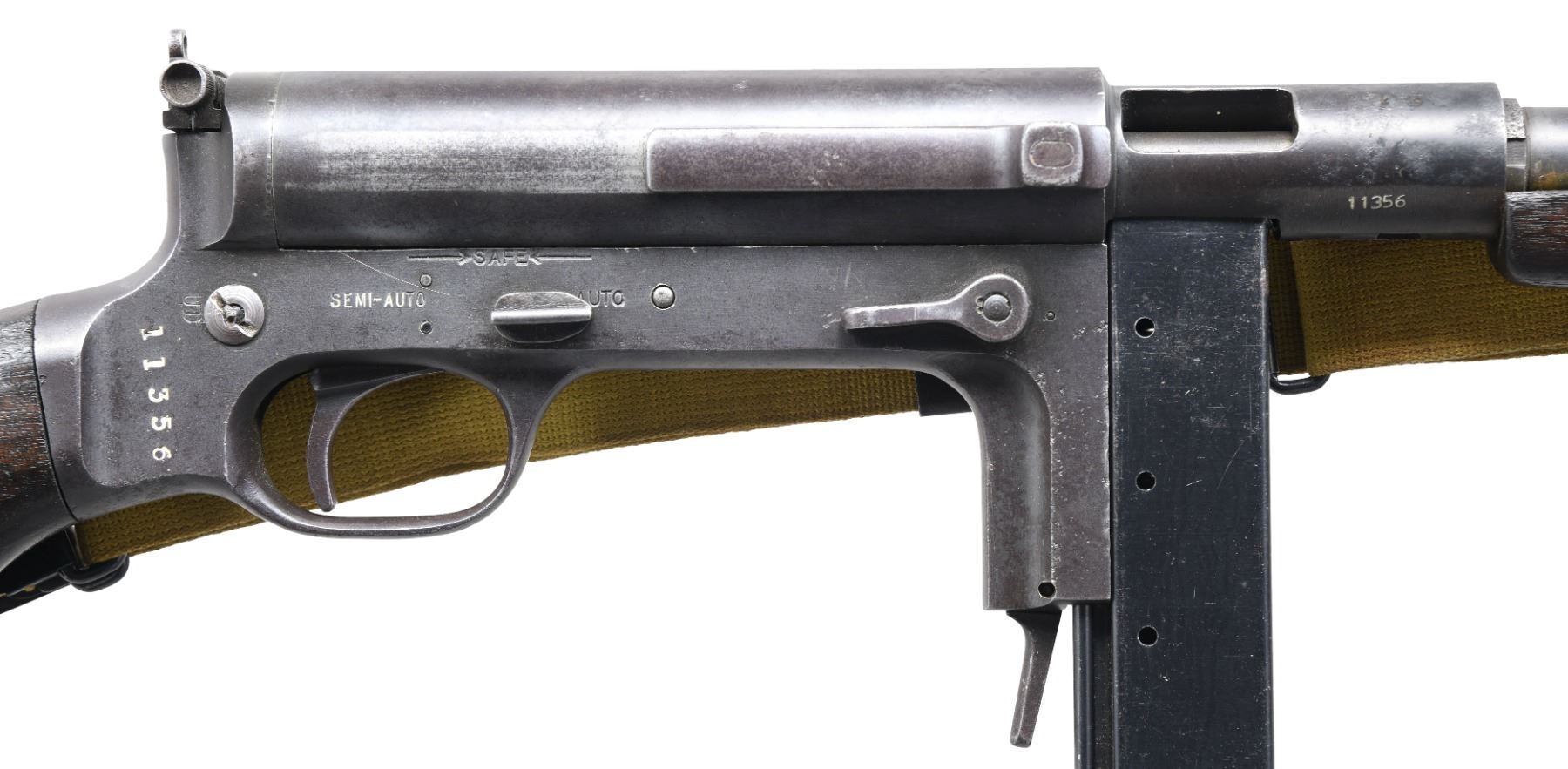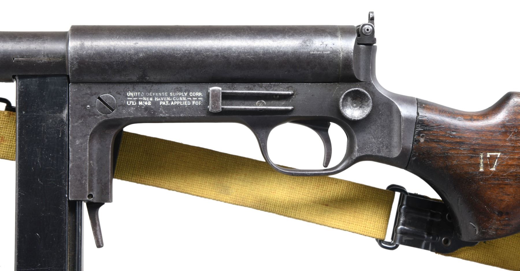 GUN. PRE 86 DEALER SAMPLE (KEEPER). Cal. 9mm. S# 11356. Bbl. 11". The United Defense U.D. M42 was designed by Carl Swebilius of High Standard prior to the United States involvement in WWII. Some early prototypes were made by High Standard between 1941-1942 but it was Marlin Firearms Company that took it into full production, manufacturing around 15,000 units before the entire run was purchased by the United States government. All examples were rumored to have been sold off to Allied Nations for use in defense w/ some tied to American Office of Strategic Services (OSS) operations. The 9mm Parabellum cartridge was chosen since it was in use at the time by so many allied nations, making ammunition availability easy. Some were purchased by the Dutch Government and others were reported to have been air dropped to friendly underground organizations. In the UK, they were simply known as "The Marlin". Construction was more complicated than period typical submachine guns, manufactured from steel w/ several necessary machining operations, it was robust & functioned well in adverse conditions. It is an open bolt, blowback operated mechanism with a floating firing pin that is struck by a hammer upon the closing of the bolt. It utilizes a non-reciprocating charging handle, located on the right side of the receiver w/ a secondary function of clearing the bolt path of debris. The overall length is 32.5". It has a unique tubular receiver that steps down in diameter closer to the muzzle, w/ a barrel diameter even smaller than the last receiver section, giving the appearance of a telescopic tube. The extractor is pressed into the left side of the receiver, directly across from the right side ejection port. It is fed from a 20 rd. detachable magazine located directly below the ejection port. The front sight is a ramped blade located at the muzzle of the barrel. The rear sight is a windage & elevation adjustable peep sight located at the rear of the receiver. The safety / selector is located on the right side of the receiver, just forward, & above the trigger. Hardwood furniture, including a vertical pistol grip below the barrel, & fixed shoulder stock w/ steel butt plate & trap door. Left side front sling swivel & rear swivel below stock, currently sporting tan canvas sling. Left side of receiver marked" UNITED DEFENSE SUPPLY CORP. / NEW HAVEN CONN. / UD M42 / PAT. APPLIED FOR". MAGS: 3 original 20 rd. CONDITION: Original finish varies from full coverage to thin & gray. Some pitting, primarily on the barrel, w/ some lightly scattered on receiver & mag well. Wood is a dark, matching finish, demonstrating period typical impressions. Shoulder stock has a small area where it appears a number plate may have been installed earlier as well as the number "17" still visible. Factory markings filled in an attractive white for contrast. Bore is bright w/ strong rifling. Fire control mechanism appears to function correctly when cycled by hand. PRE-86 DEALER SAMPLE (KEEPER). NATIONAL FIREARMS ACT MG REQUIRING BATF TRANSFER BEFORE TAKING POSSESSION. YOU MUST BE A CURRENT NFA/SOT DEALER IN ORDER TO TAKE POSESSION OF THIS FIREARM. PROVENANCE: From the Lifelong Collection of Brian Linde. (03-1843/JZ). CLASS III. $7,000-12,000.
