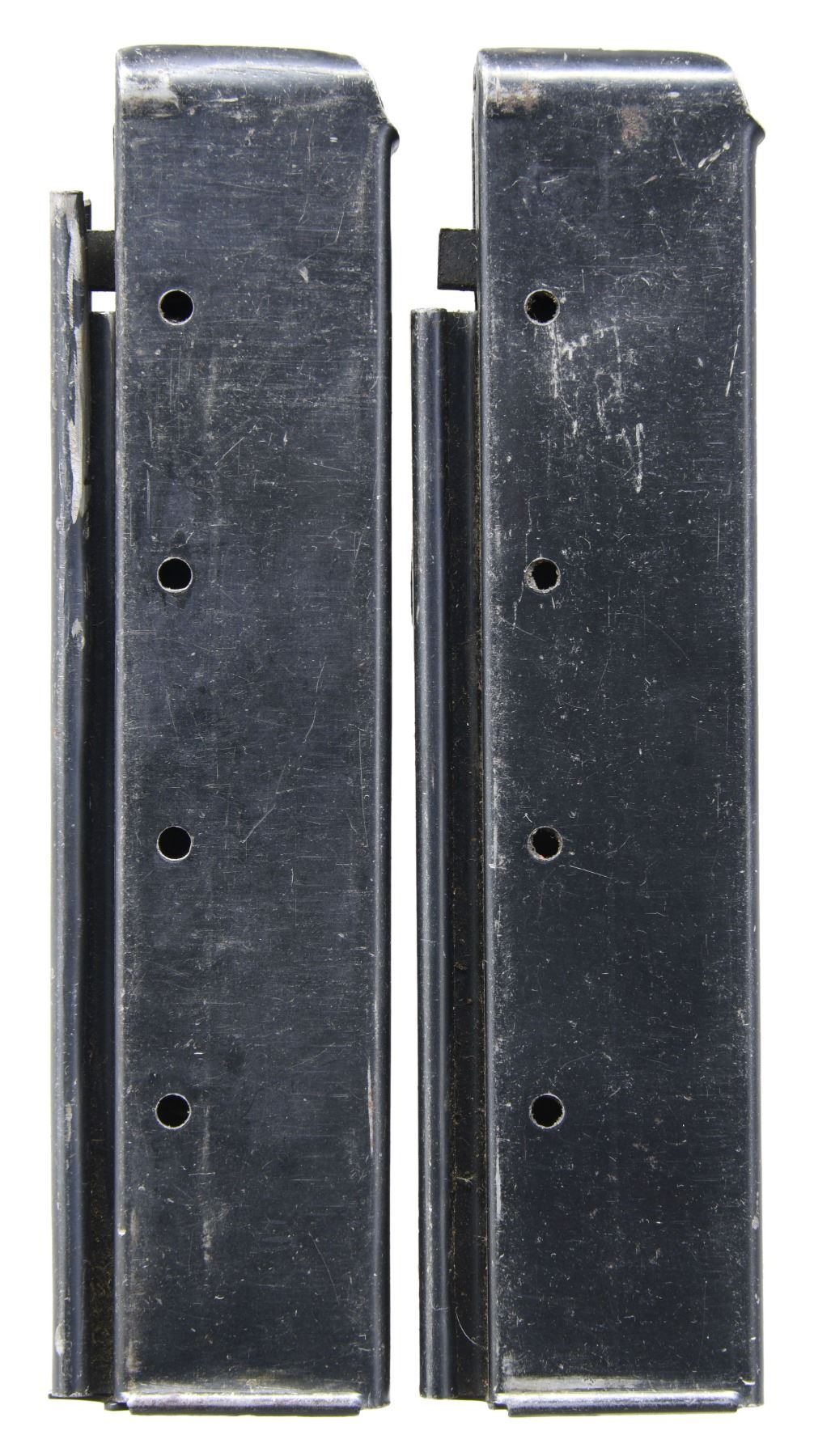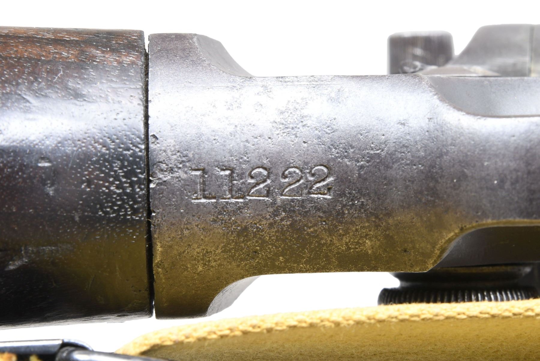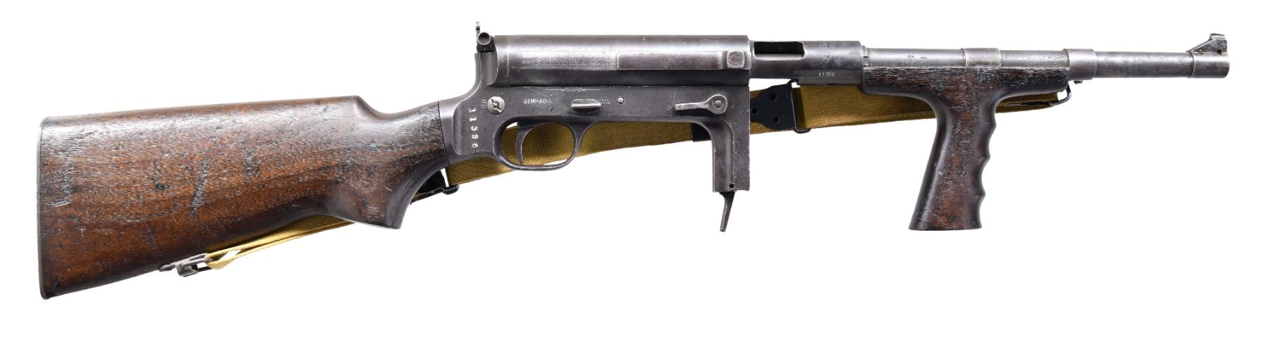 GUN. PRE 86 DEALER SAMPLE (KEEPER). Cal. 9mm. S# 11356. Bbl. 11". The United Defense U.D. M42 was designed by Carl Swebilius of High Standard prior to the United States involvement in WWII. Some early prototypes were made by High Standard between 1941-1942 but it was Marlin Firearms Company that took it into full production, manufacturing around 15,000 units before the entire run was purchased by the United States government. All examples were rumored to have been sold off to Allied Nations for use in defense w/ some tied to American Office of Strategic Services (OSS) operations. The 9mm Parabellum cartridge was chosen since it was in use at the time by so many allied nations, making ammunition availability easy. Some were purchased by the Dutch Government and others were reported to have been air dropped to friendly underground organizations. In the UK, they were simply known as "The Marlin". Construction was more complicated than period typical submachine guns, manufactured from steel w/ several necessary machining operations, it was robust & functioned well in adverse conditions. It is an open bolt, blowback operated mechanism with a floating firing pin that is struck by a hammer upon the closing of the bolt. It utilizes a non-reciprocating charging handle, located on the right side of the receiver w/ a secondary function of clearing the bolt path of debris. The overall length is 32.5". It has a unique tubular receiver that steps down in diameter closer to the muzzle, w/ a barrel diameter even smaller than the last receiver section, giving the appearance of a telescopic tube. The extractor is pressed into the left side of the receiver, directly across from the right side ejection port. It is fed from a 20 rd. detachable magazine located directly below the ejection port. The front sight is a ramped blade located at the muzzle of the barrel. The rear sight is a windage & elevation adjustable peep sight located at the rear of the receiver. The safety / selector is located on the right side of the receiver, just forward, & above the trigger. Hardwood furniture, including a vertical pistol grip below the barrel, & fixed shoulder stock w/ steel butt plate & trap door. Left side front sling swivel & rear swivel below stock, currently sporting tan canvas sling. Left side of receiver marked" UNITED DEFENSE SUPPLY CORP. / NEW HAVEN CONN. / UD M42 / PAT. APPLIED FOR". MAGS: 3 original 20 rd. CONDITION: Original finish varies from full coverage to thin & gray. Some pitting, primarily on the barrel, w/ some lightly scattered on receiver & mag well. Wood is a dark, matching finish, demonstrating period typical impressions. Shoulder stock has a small area where it appears a number plate may have been installed earlier as well as the number "17" still visible. Factory markings filled in an attractive white for contrast. Bore is bright w/ strong rifling. Fire control mechanism appears to function correctly when cycled by hand. PRE-86 DEALER SAMPLE (KEEPER). NATIONAL FIREARMS ACT MG REQUIRING BATF TRANSFER BEFORE TAKING POSSESSION. YOU MUST BE A CURRENT NFA/SOT DEALER IN ORDER TO TAKE POSESSION OF THIS FIREARM. PROVENANCE: From the Lifelong Collection of Brian Linde. (03-1843/JZ). CLASS III. $7,000-12,000.