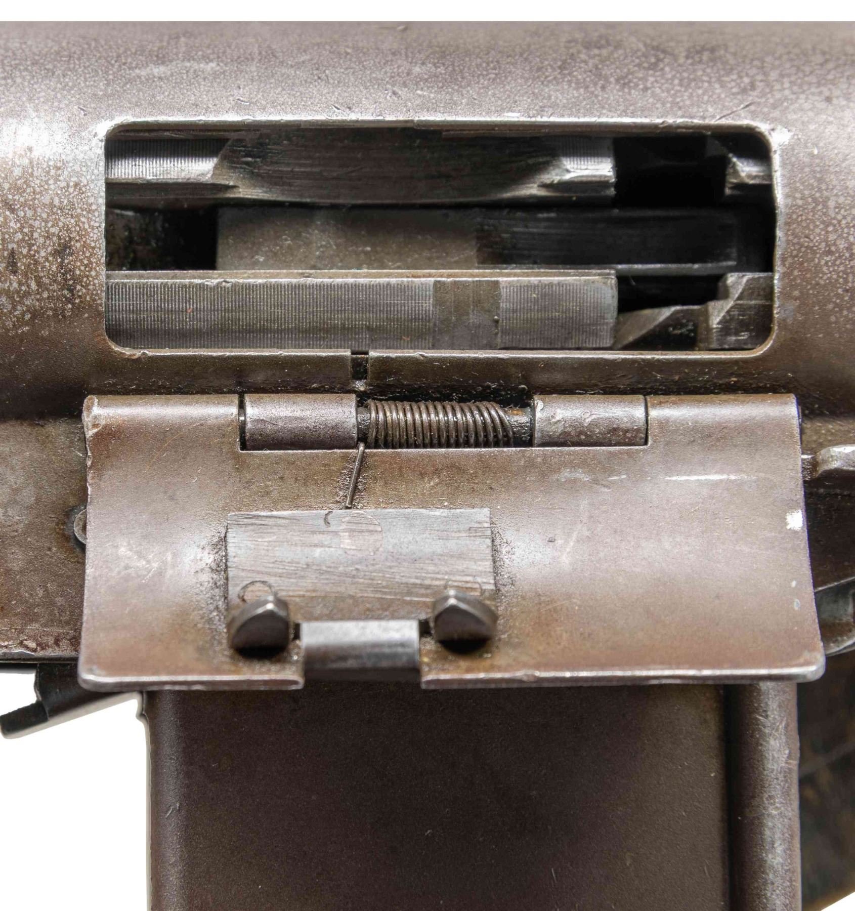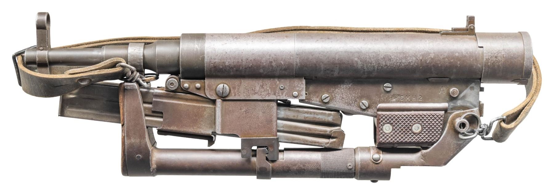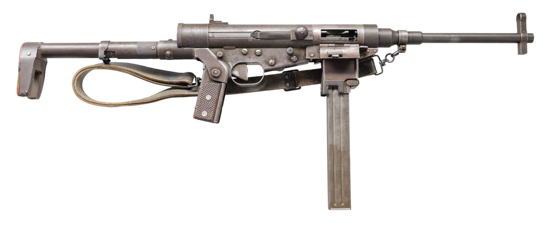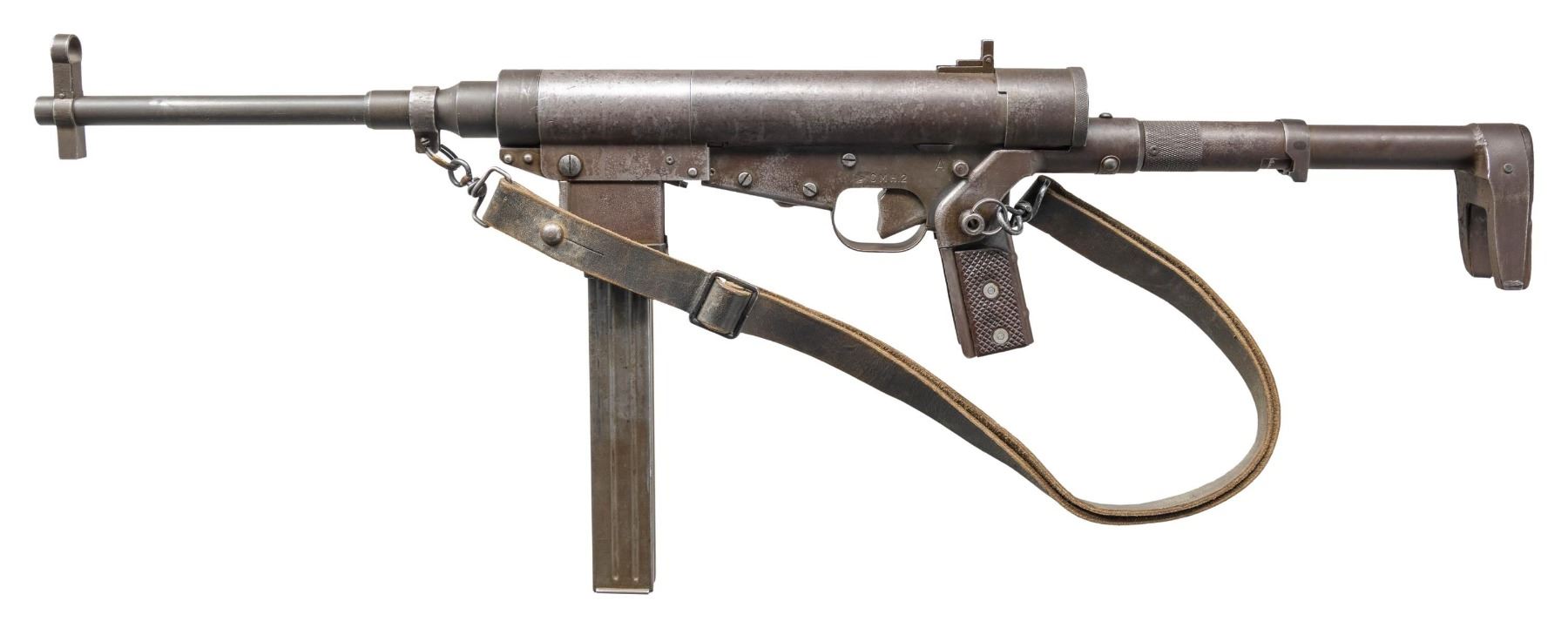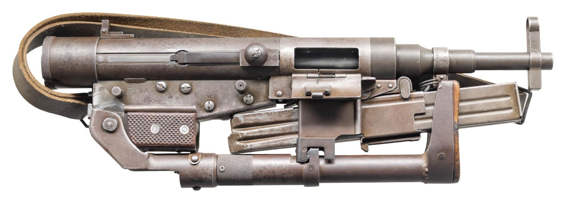 SUBMACHINE GUN. Cal. 9mm. S# 4205. Bbl. 10 3/4". Blade front sight with hood. Folding aperture rear sight. The French Hotchkiss Universal SMG is known as the "Transformer Gun" due to its ability fold into a compact package. This particular example is the only transferable curio example this cataloger is aware of. This maybe the only chance the advanced machine gun or military collector has to own such a rare piece. Very few of these SMGS were made with an estimated 7000 produced. The French military eventually rejected the Universal due to its complex nature in favor of the more common & simple MAT-49. This particular example has an interesting & documented history. The bulk of these SMGs were used by the French Foreign Legion in Indochina & Algeria. This example was picked up in a pile of captured Viet Cong weapons at Tân Son Nhut Air Base near Saigon by an Air Policeman in 1964. The Air Policeman was amazed by the weapon having never seen anything like it & brought the gun home via a B52 Bomber & later registered it during the 1968 Amnesty. This gun & the vets story is detailed in the book "War Trophies Weapons From Vietnam Volume II" by Keith Seafield. Registration paperwork lists Mfr. as France. Left side of receiver marked "CMH.2". Phosphate finish. Folding stock. Left side sling swivels with leather sling. MAGS: 7-32 rd. UNATTACHED ACCESSORIES: amnesty registration paperwork & letter from Veteran detailing how he got the SMG back to the USA. Also includes a copy of the book, "War Trophies Weapons From Vietnam Volume II" by Keith Seafield. CONDITION: metal retains 50% original phosphate with scattered fading, edge wear, handling marks & oxidation staining all consistent with combat usage. Action functions properly when hand cycled. Very good bright bore that shows a couple small pits but strong rifling. THIS IS A NATIONAL FIREARMS ACT CURIO & RELIC MACHINE GUN REQUIRING BATF TRANSFER BEFORE TAKING POSSESSION. FULLY TRANSFERABLE. (03-1925/MJC). CURIO CLASS III. $100,000-150,000.