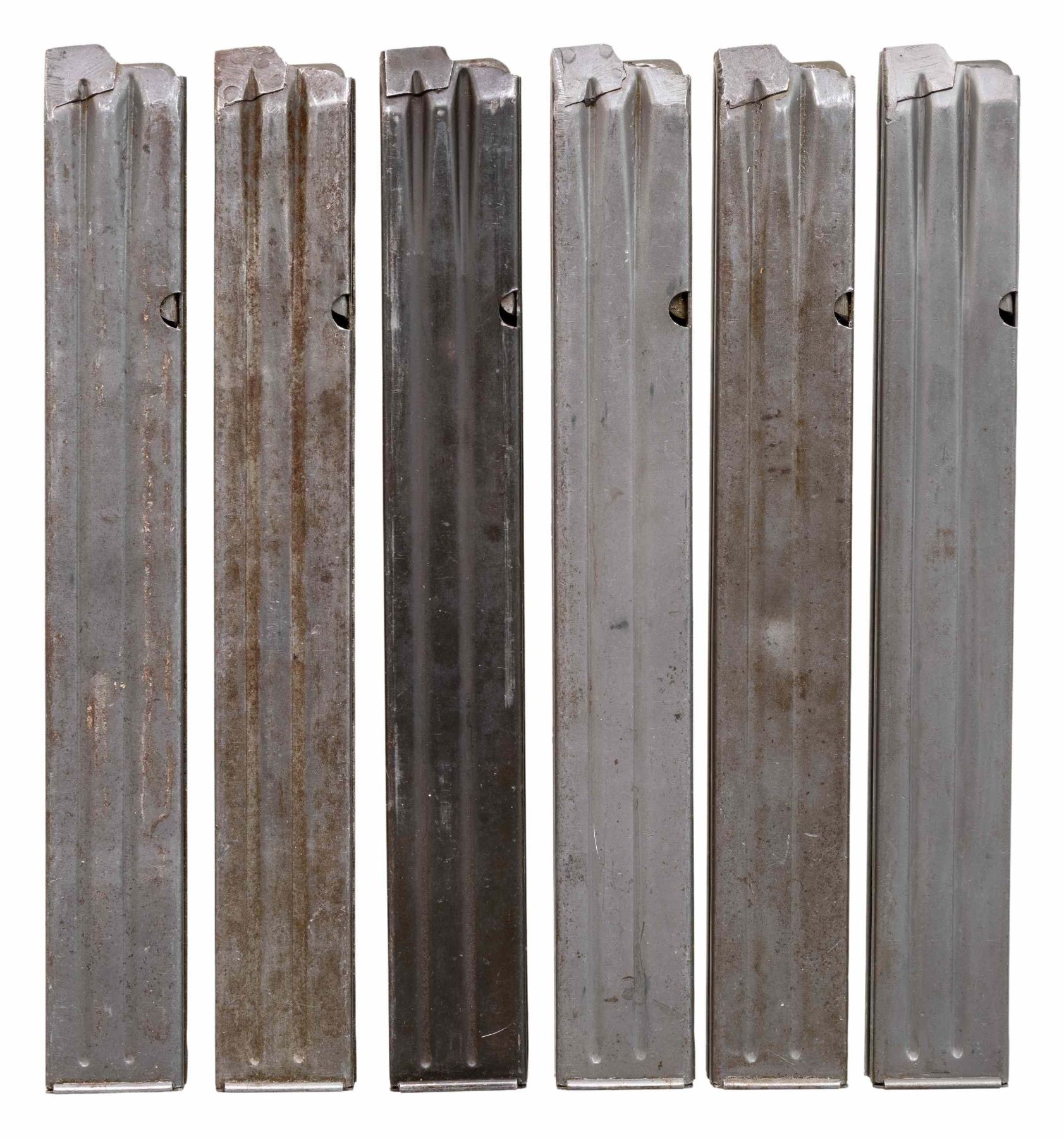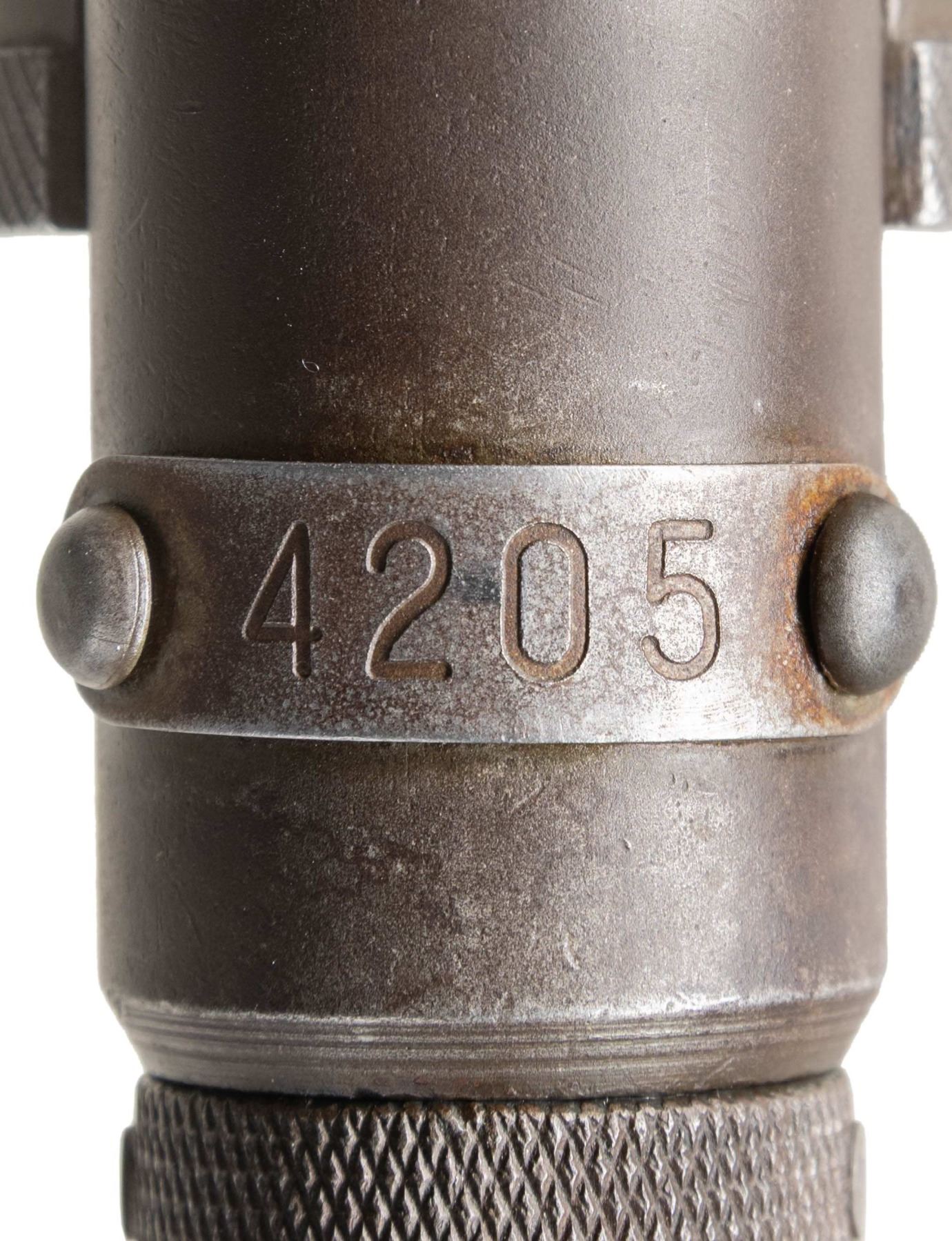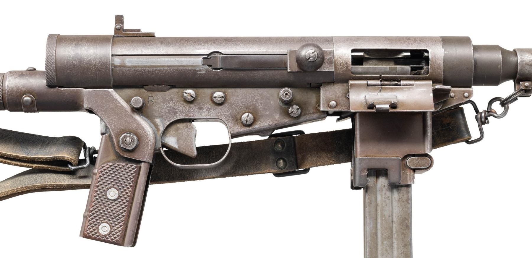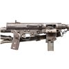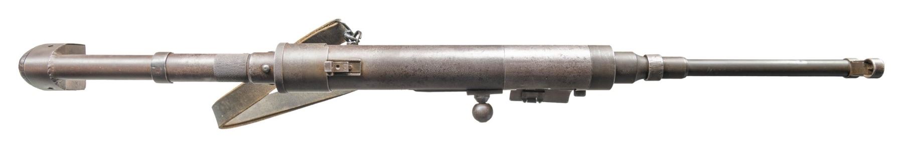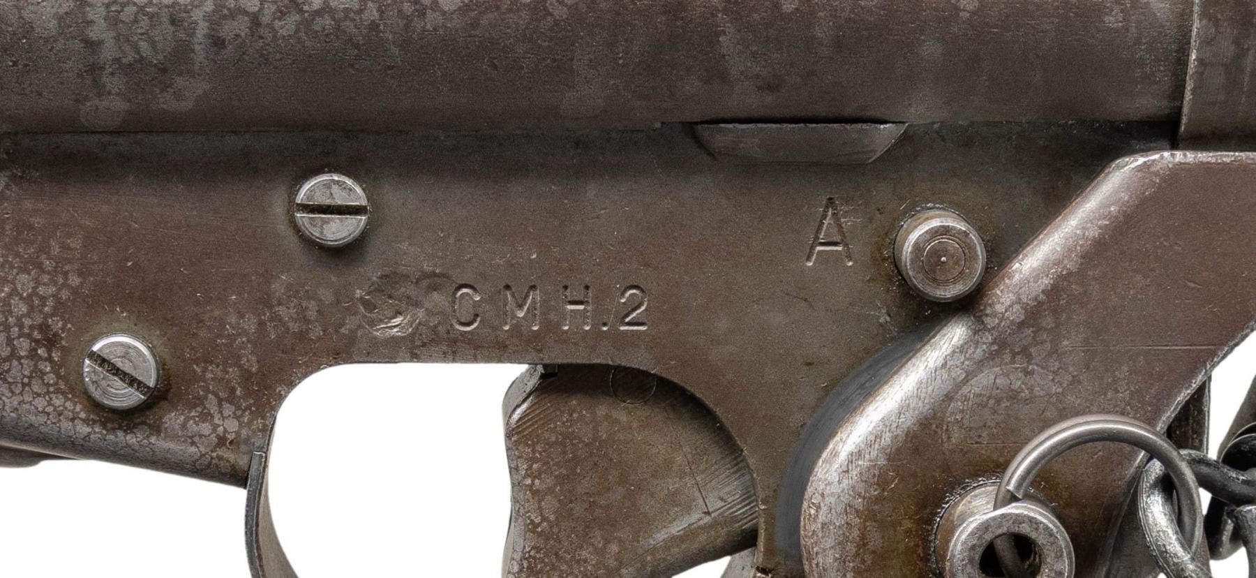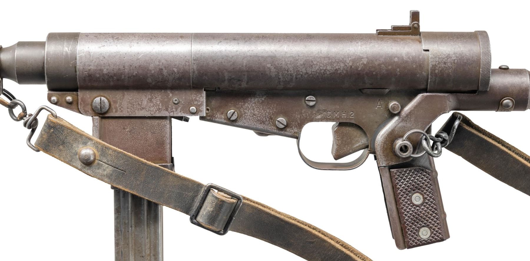SUBMACHINE GUN. Cal. 9mm. S# 4205. Bbl. 10 3/4". Blade front sight with hood. Folding aperture rear sight. The French Hotchkiss Universal SMG is known as the "Transformer Gun" due to its ability fold into a compact package. This particular example is the only transferable curio example this cataloger is aware of. This maybe the only chance the advanced machine gun or military collector has to own such a rare piece. Very few of these SMGS were made with an estimated 7000 produced. The French military eventually rejected the Universal due to its complex nature in favor of the more common & simple MAT-49. This particular example has an interesting & documented history. The bulk of these SMGs were used by the French Foreign Legion in Indochina & Algeria. This example was picked up in a pile of captured Viet Cong weapons at Tân Son Nhut Air Base near Saigon by an Air Policeman in 1964. The Air Policeman was amazed by the weapon having never seen anything like it & brought the gun home via a B52 Bomber & later registered it during the 1968 Amnesty. This gun & the vets story is detailed in the book "War Trophies Weapons From Vietnam Volume II" by Keith Seafield. Registration paperwork lists Mfr. as France. Left side of receiver marked "CMH.2". Phosphate finish. Folding stock. Left side sling swivels with leather sling. MAGS: 7-32 rd. UNATTACHED ACCESSORIES: amnesty registration paperwork & letter from Veteran detailing how he got the SMG back to the USA. Also includes a copy of the book, "War Trophies Weapons From Vietnam Volume II" by Keith Seafield. CONDITION: metal retains 50% original phosphate with scattered fading, edge wear, handling marks & oxidation staining all consistent with combat usage. Action functions properly when hand cycled. Very good bright bore that shows a couple small pits but strong rifling. THIS IS A NATIONAL FIREARMS ACT CURIO & RELIC MACHINE GUN REQUIRING BATF TRANSFER BEFORE TAKING POSSESSION. FULLY TRANSFERABLE. (03-1925/MJC). CURIO CLASS III. $100,000-150,000.