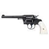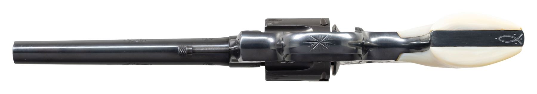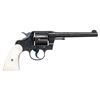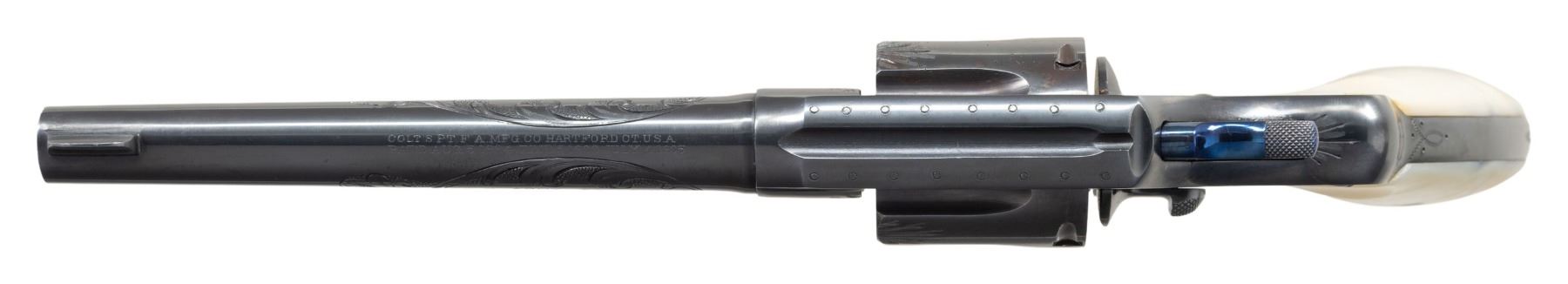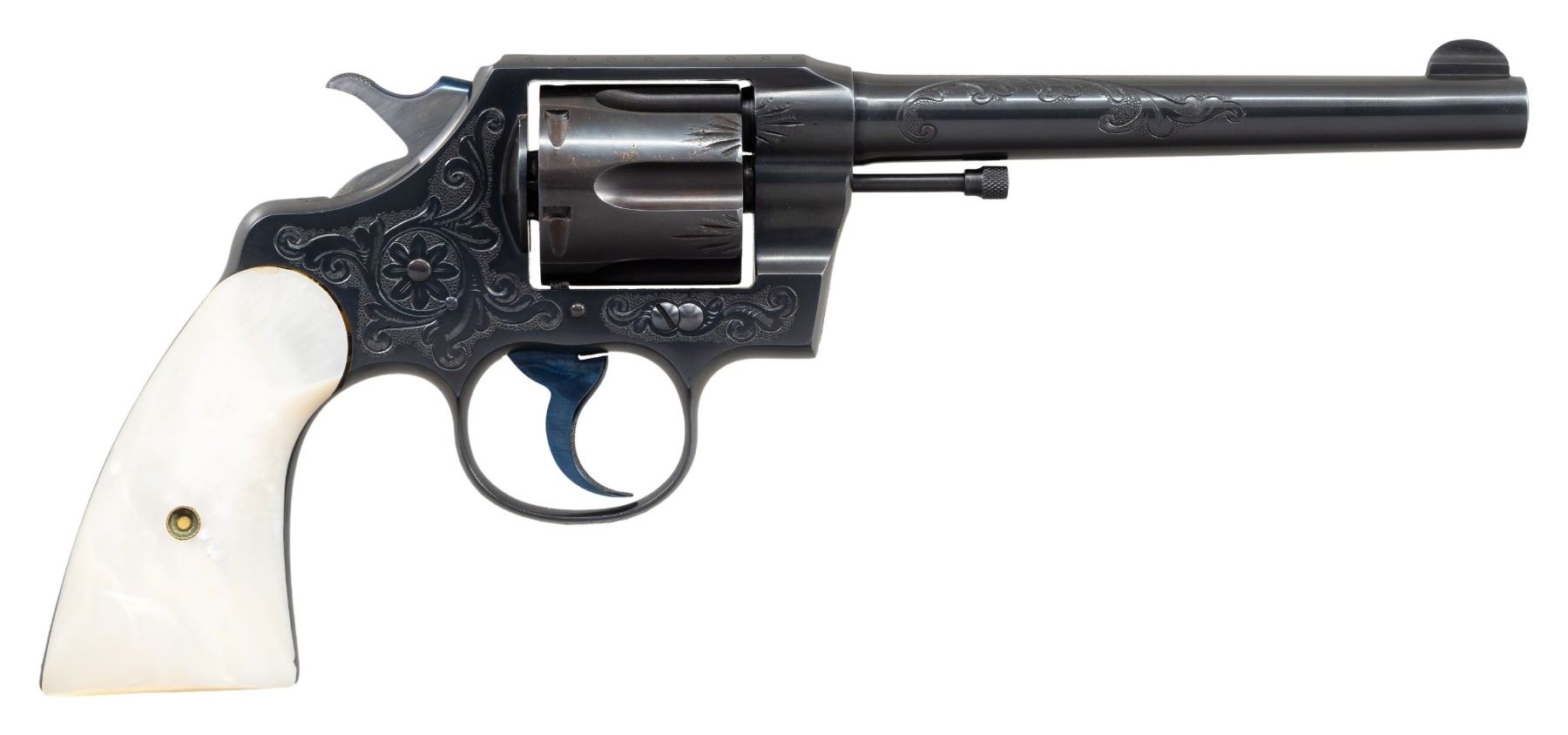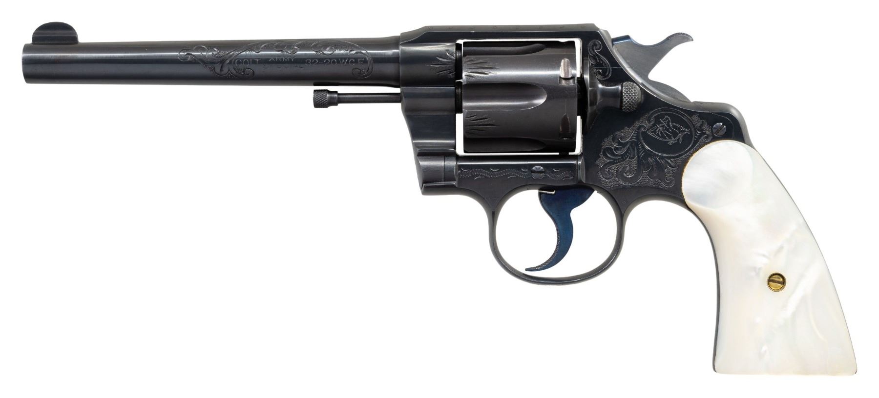 SPECIAL DA REVOLVER. Cal. 32-20. S# 321844. Bbl. 6" with blade front sight. Mfg. 1911. According to "THE BOOK OF COLT FIREARMS" by Sutherland and Wilson, it is estimated that out of the total production of approx. 240,000, only 475 of these revolvers were ever factory engraved. Revolver features Class "A" 25% coverage floral scroll engraving with punch dot background and star bursts on trigger guard bow, rear of hammer on grip frame, in between cyl. flutes and either side of frame, forward of cyl. Top strap ornamented with two sets of in line "O"s. Left side of bbl. marked COLT ARMY SPECIAL 32-20 WCF" surrounded by foliate scroll engraving. Blued frame, bbl. & cyl. Fire blued checkered trigger & hammer top. Sides of hammer polished bright. Revolver stocked with fancy mother of pearl grips. A copy of the Colt Archive Properties letter, confirms that the production records note that the revolver was indeed engraved, and was manufactured, May 26, 1911. CONDITION: very fine as factory quality refinished. Metal parts retain 99% reapplied blue. There is one very light area of prior pitting on cyl in between flutes. Grips are of the period, well fit & in excellent condition. Good bore with some light frosting in grooves. A very hard to obtain engraved Army Special for those who collect engraved Colt firearms. PROVENANCE: Military Museum Collection of Shooters Outpost, Hooksett NH. (25-5603/BH) CURIO. $6,500-9,500.