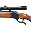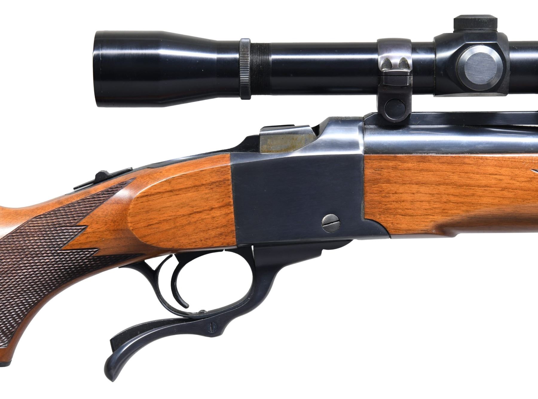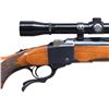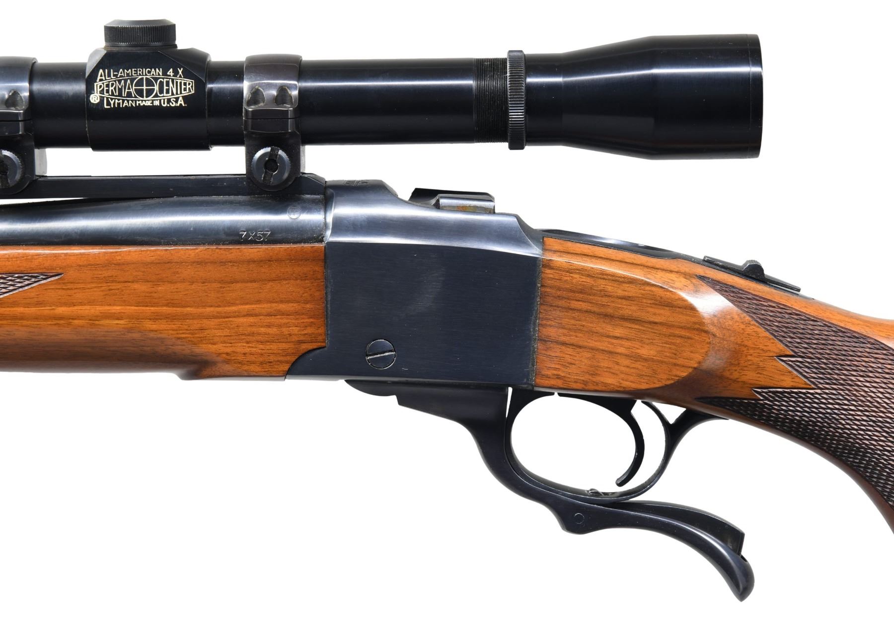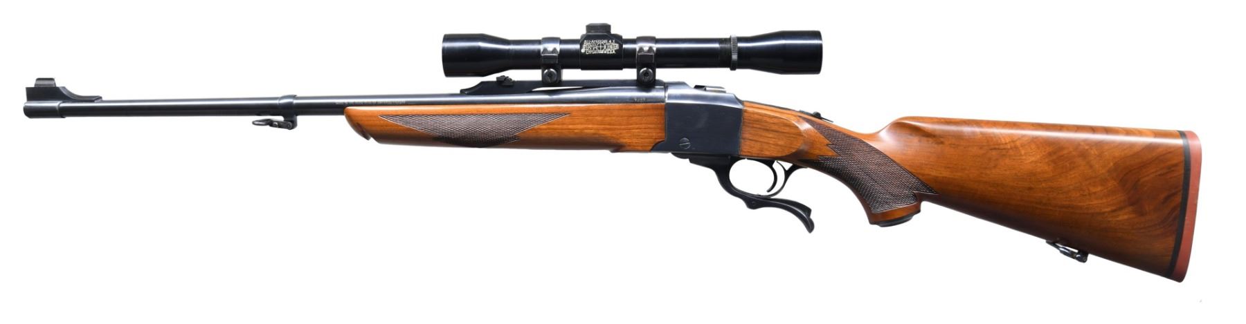 SPORTER SINGLE SHOT RIFLE. Cal. 7x57. S# 130-28350. Mfg. 1976. According to "Reference of Ruger Firearms, Volume 2" (Third Revision), this variation has approx 304 made in known S# range 130-26398 to 130-28086. Bbl. 22" w/ Liberty marking on left side. Barrel band mounted gold bead front sight & Lyman style folding adj. rear sight on quarter rib. Lyman All American 4x, PermaCenter scope on Ruger rings. Sling swivels on barrel band mounted stud & toeline stud. Alex Henry checkered walnut forearm. Checkered walnut pistol grip buttstock with Ruger steel grip cap & red factory pad. CONDITION: near excellent wood & metal finish with scattered minute handling marks & scuffs on pad. Near excellent bore. Scope has very good plus finish with serviceable optics. PROVENANCE: Estate of Russell Dickerman. (25-1932/MD). MODERN. $1,000-1,500.