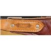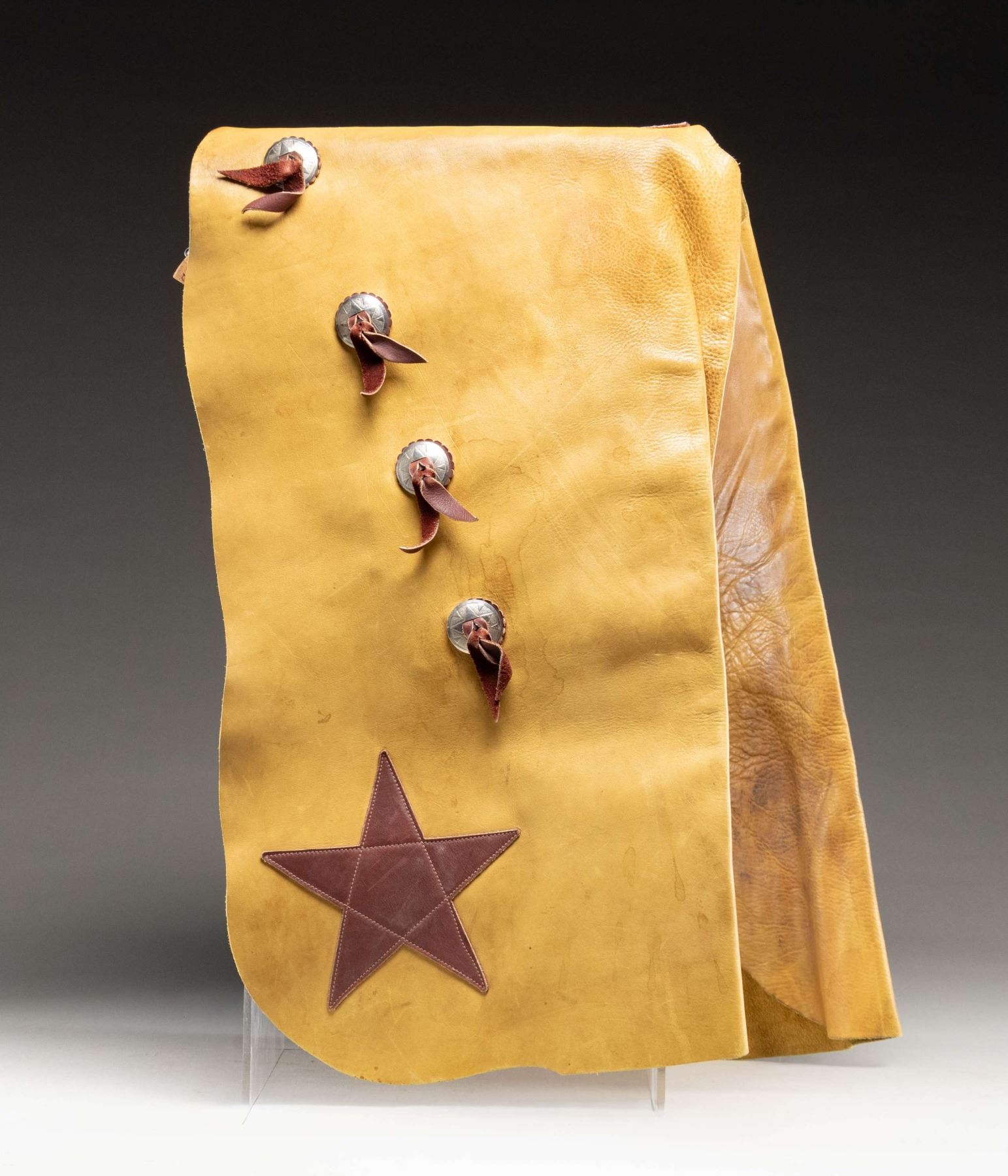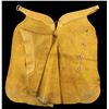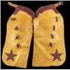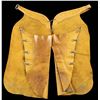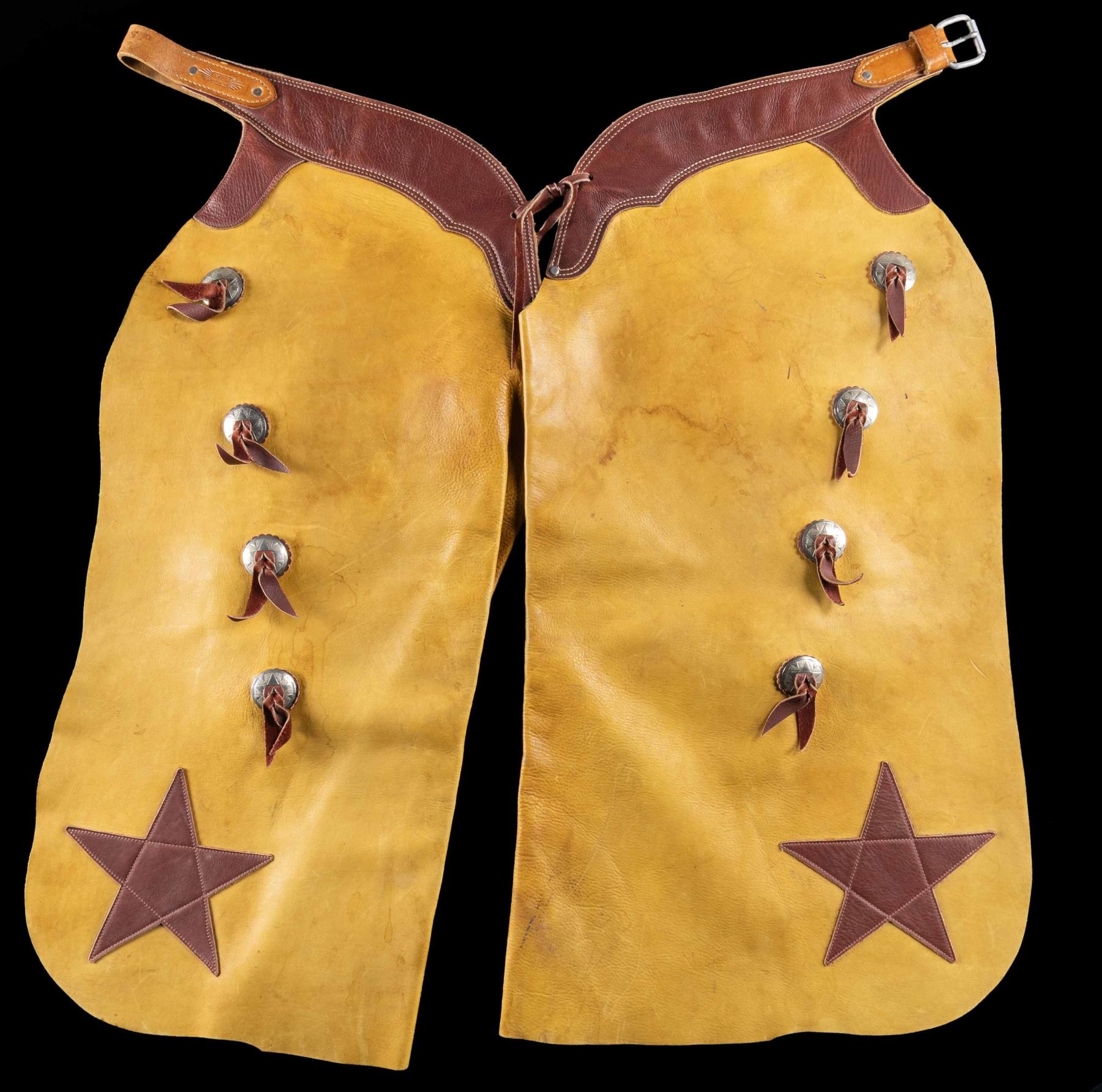 LEATHER CHAPS. Tan & brown leather chaps measures approx. 34" x 18" w/ plated conchos. CONDITION: very good overall showing light handling marks & stains. (02-25256/MD). NON-GUN. $300-500.