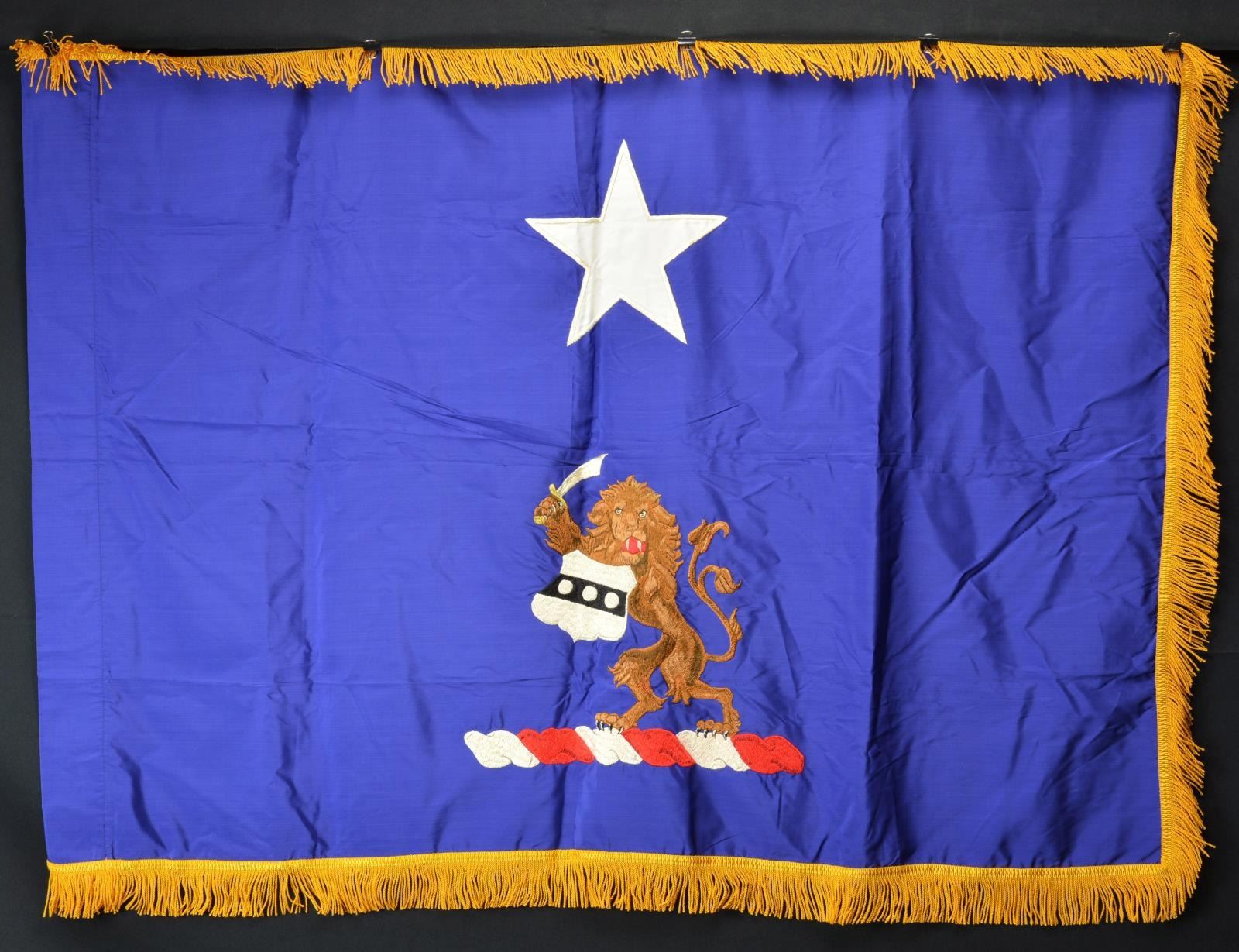 NATIONAL GUARD FLAG. 3x4' regulation flag, double applique embroidery of lion with shield and sword beneath large single White Star, inspection label April 11th 1967. CONDITION: very good. (02-18038-20/JS). $100-200.