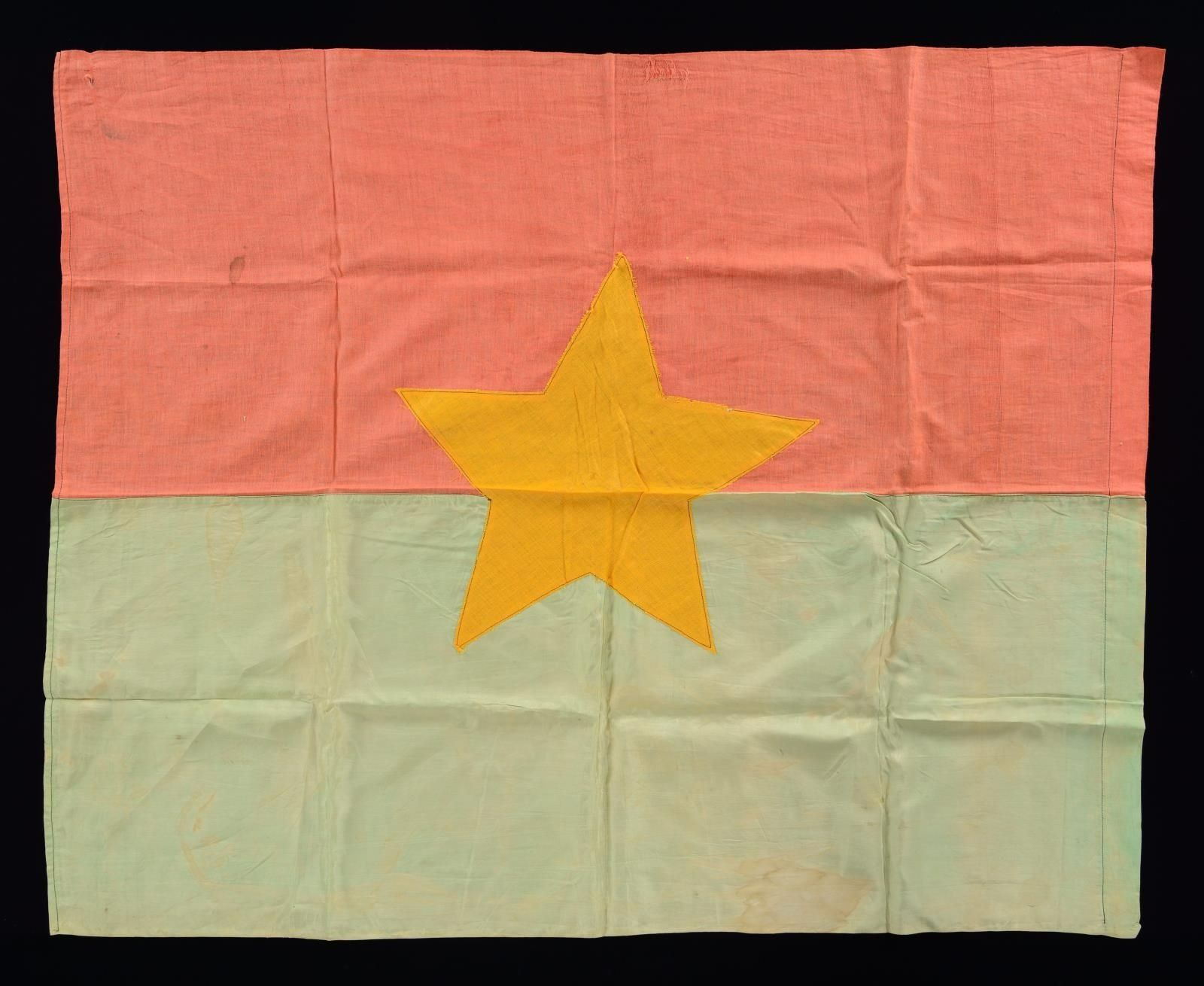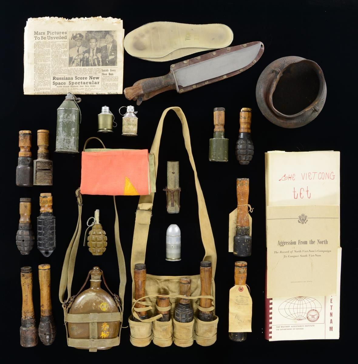 MORE. This varied group includes 1 book titled “THE VIETCONG TET OFFENSIVE”. / 1 Book titled “COUNTRY STUDY REPUBLIC OF VIETNAM”. / 1 Book titled “AGGRESSION FROM THE NORTH”. / 1 Copy of “The Saigon Sunday Post” dated July 18, 1965. / 1 North Vietnamese flag. / 1 Large bowie type side knife measuring 16 1/4" overall with a 10 3/8” blade. Brown leather sheath. / 1 Well-used NVA cook pot, likely dating to the 18th century. / 1 WWII Japanese canteen with full carrying strap. / 1 North Vietnamese 4-pocket grenade pouch with 4 inert NVA grenades. / 11 Inert North Vietnamese grenades of various styles & forms. / 1 Smoke canister. / 2 Cookstove burners. / 1 Inert improvised explosive device. / 1 Small artillery shell. / 1 Pair of steel boot inserts to thwart punji sticks. CONDITION: most grenades show light to moderate wear. The canteen & flag show light overall wear. Other items show light to moderate wear. (02-18678-2/BF). $1,400-1,800.