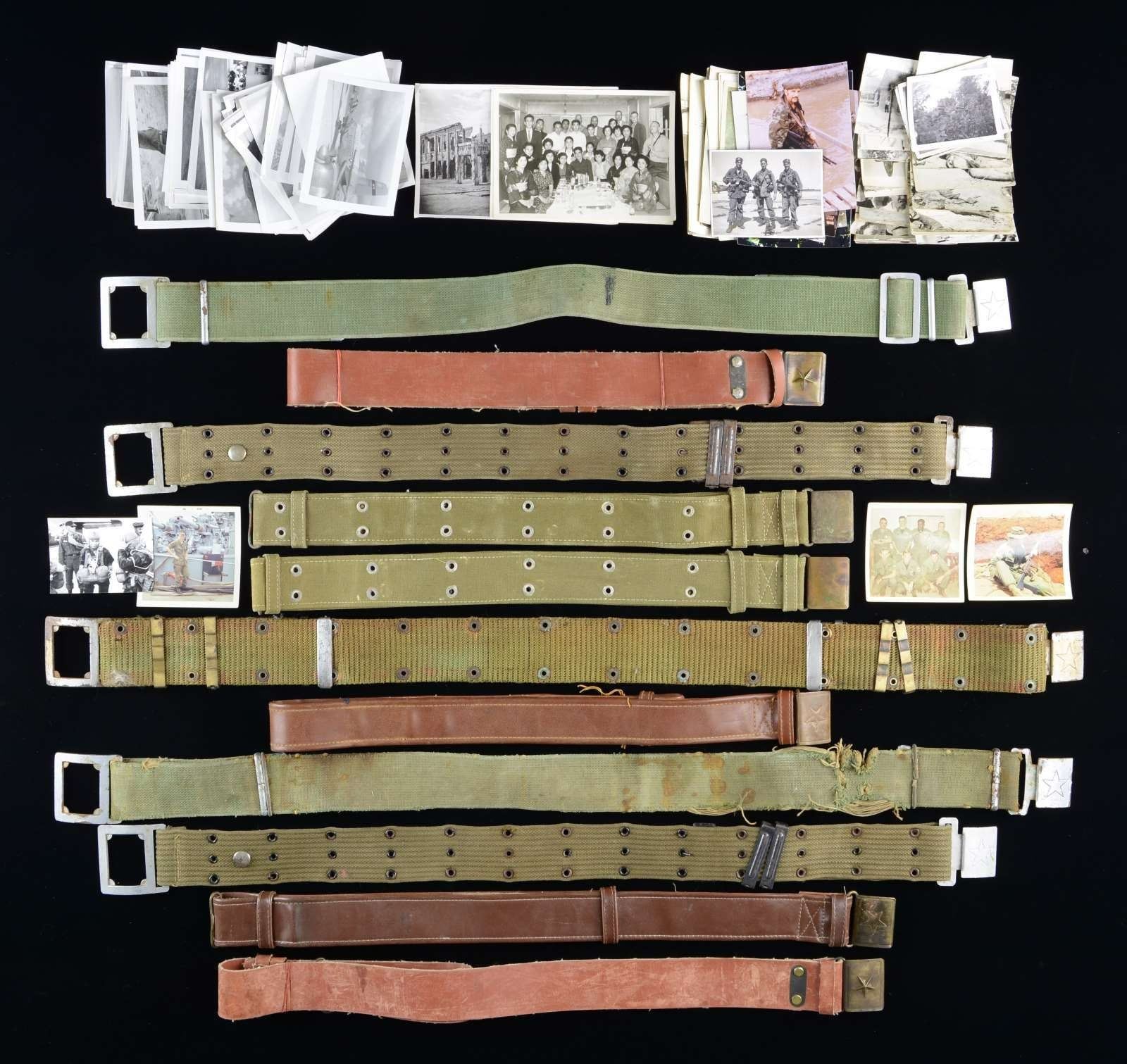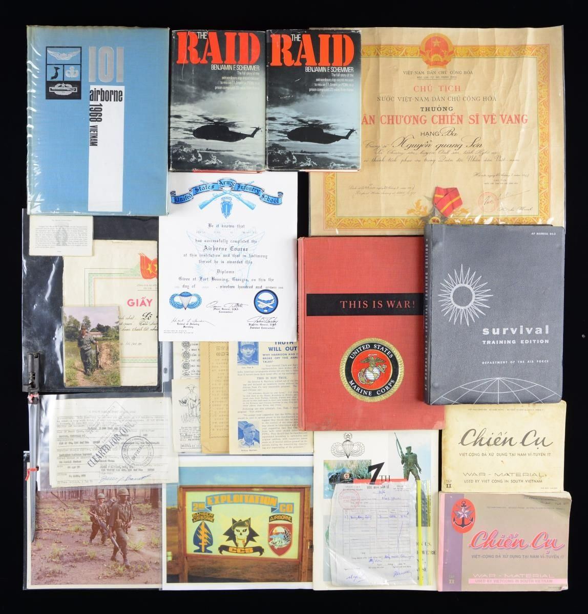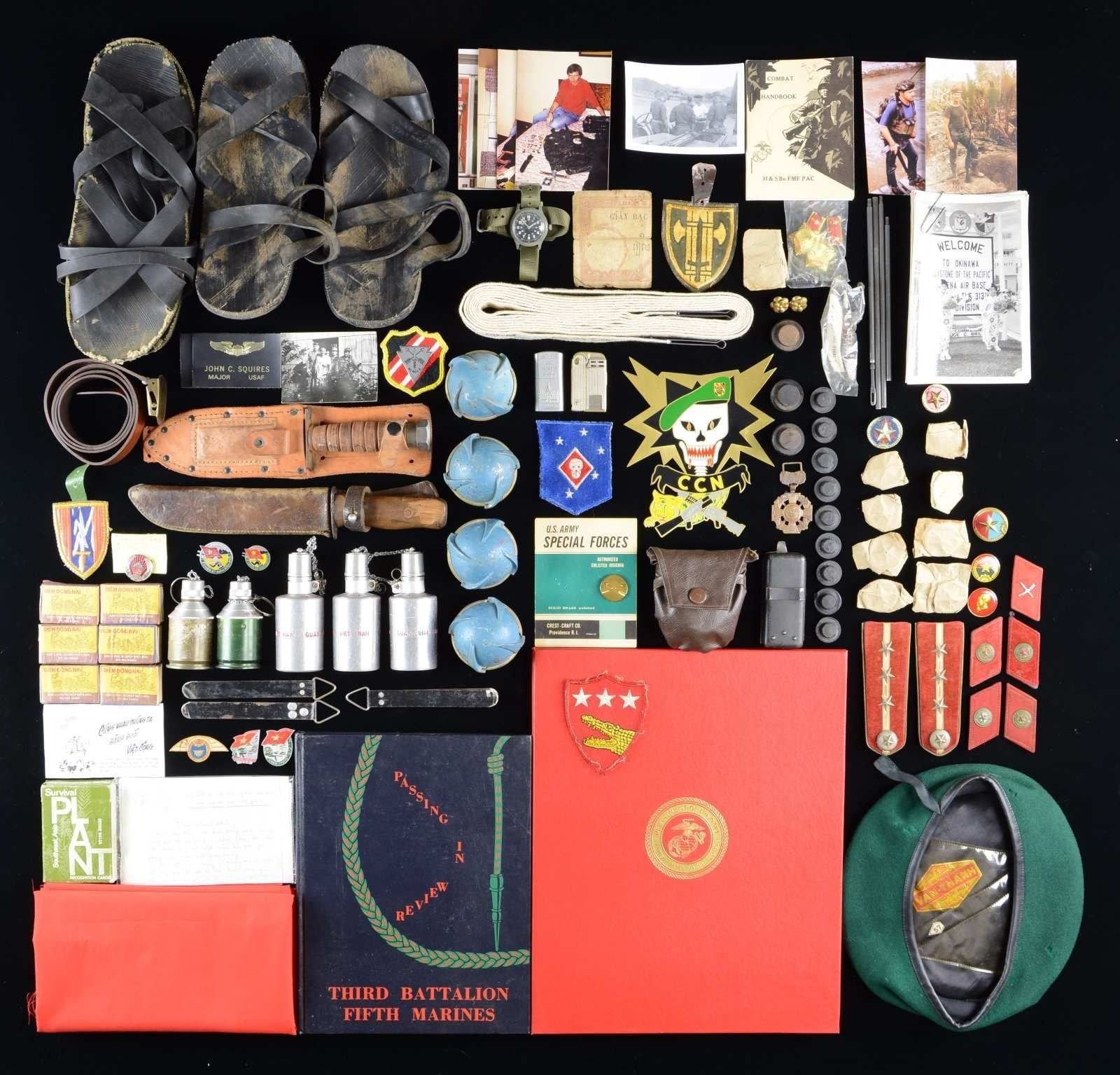 This varied lot includes 1 large red folder of retirement & award documents to a Marine Corps Sergeant. / 1 Third Battalion 5th Marines yearbook. / 1 Book titled “101st Airborne 1968 Vietnam”. / 2 Books titled “THE RAID” by Schemmer. / 1 Book titled “SURVIVAL TRAINING EDITION DEPARTMENT OF THE AIR FORCE 1960”. / 4 Dummy Vietnam era practice cluster bombs. / 13 North Vietnamese belts. / 1 AK-47 oiler in pouch. / 1 Pack of plant survival recognition cards. / 1 Marine Corps yearbook from the Korean War. / 1 Group of ephemera from Vietnam. / 1 Pack of pressed photos from the Vietnam War. / 1 North Vietnamese Medal with award document. / 1 US Pilot's survival knife. / 6 Boxes of Vietnamese matches. / 1 Theater-made survival knife. / 5 Portable cookstove burners. / 3 US Military patches. / 1 Large cotton canvas strap. / 1 Large group of black & white photographs of Vietnam. / 1 North Vietnamese award document with the soldier's picture. / 1 US Special Forces collar insignia. / 1 Camouflage makeup kit. / 1 Large group of pictures & ephemera from Vietnam. / 2 Pairs of North Vietnamese tire tread sandals. / 1 Green beret with a Saigon label. / 1 Piece of red cloth. / 2 Books on North Vietnamese weapons. / 1 Captured bayonet. / 1 Cleaning rod. / 1 Bag of NVA pith helmet badges. / 1 Small group of North Vietnamese collar tabs & shoulder boards. / 1 Marine Corps combat handbook. / 1 Bag of miscellaneous militaria from the Vietnam War. CONDITION: as one would expect, condition varies greatly in this lot; however, most items show light to moderate wear & remain serviceable. PROVENANCE: From the Lifelong Collection of Glen E. Mattox. (02-18678-1/BF). $400-700.