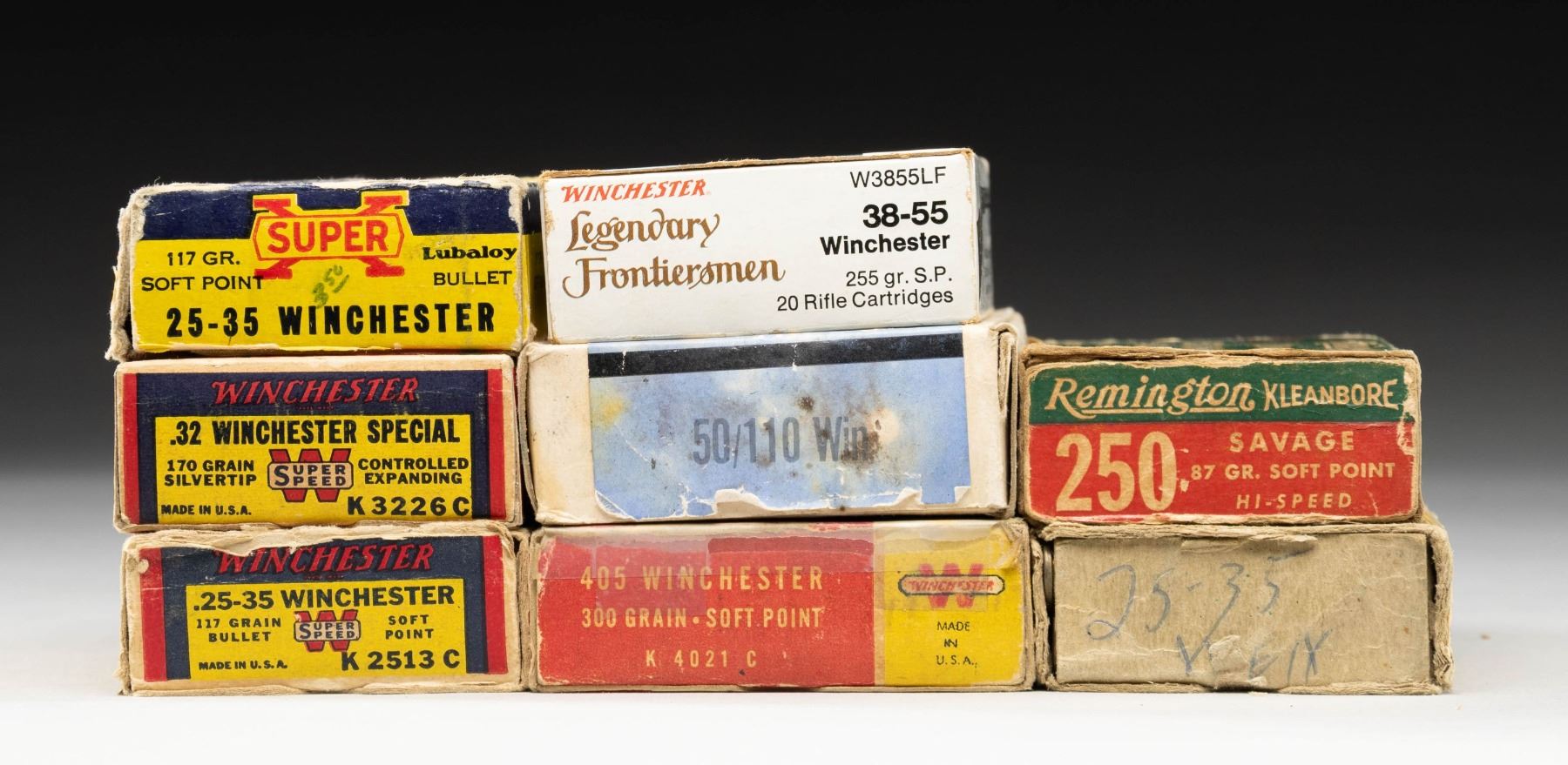 Good presentation of 20 rd. boxes with partial counts noted. 1). Winchester 38-55 Win. Legendary Frontiersmen; 18 rds. with nickel plated cases. 2). Winchester 32 Special Silvertip box with vintage unused primed cases having early domed style primers. Beautiful box with cursive "Pld" in red on back. 3). Winchester 25-35 Win. vintage box with nice appearance yet end flaps are detached. 4). Winchester 405 Win. with WRA headstamps. One box end flap missing, the other taped. 5). Western 25-35 Win. Super-X with old price on front of box. 6.) Peters 25-35 Win. 10 rds. of Peters and 10 by Winchester (1 with corrosion). Missing box end flaps. 7). Remington 250 Sav. with 14 Winchester Super-X and 2 REM-UMC. Detached end flap and separated box seam. 8). Connecticut Cartridge Company 50-110 WCF with 385 grain lead bullets having reddish tone. "CCC 50/110" headstamps. PROVENANCE: The Esteemed Norm Greenberg Collection. (02-24841-4/NW). $150-250.