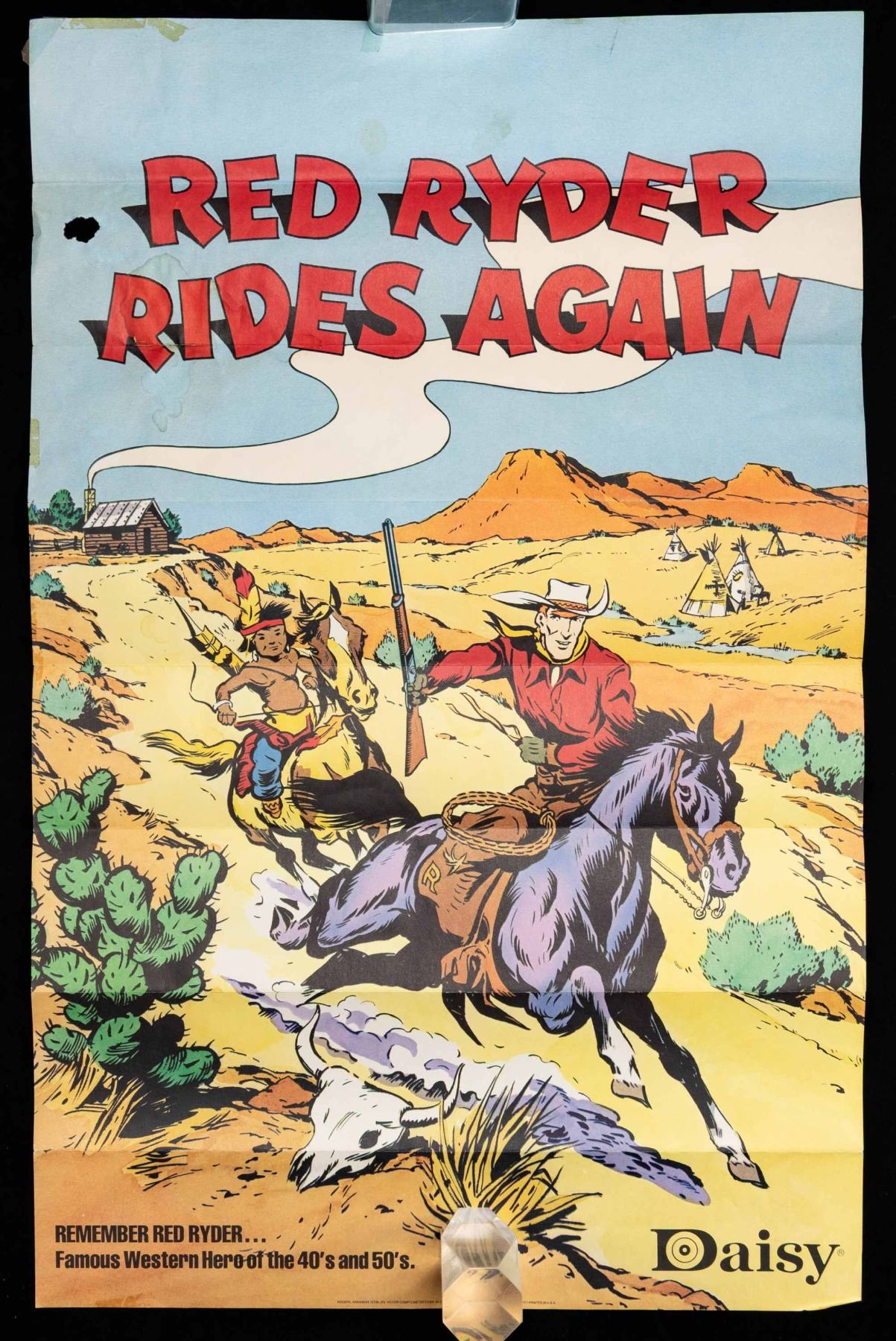POSTER. Vintage Daisy poster of the Red Ryder marked "RED RYDER/ RIDES AGAIN" above a full poster scene of the Red Ryder on horseback, with "REMEMBER RED RYDER.../ Famous Western Hero of the 40's and 50's." and the Daisy trademark logo marked towards the bottom edge. Poster measures 34 7/16" x 22". CONDITION: poster shows some age related discoloration, with several spots exhibiting remnants of previous tape, a thin strip of tape at the top, some scattered spots of moisture damage, as well as an approx. 1" hole in the upper left section. Otherwise, poster remains sound and presents nicely. PROVENANCE: Norman Olliff Estate. (02-25667/MLW). NON-GUN. $25-50.