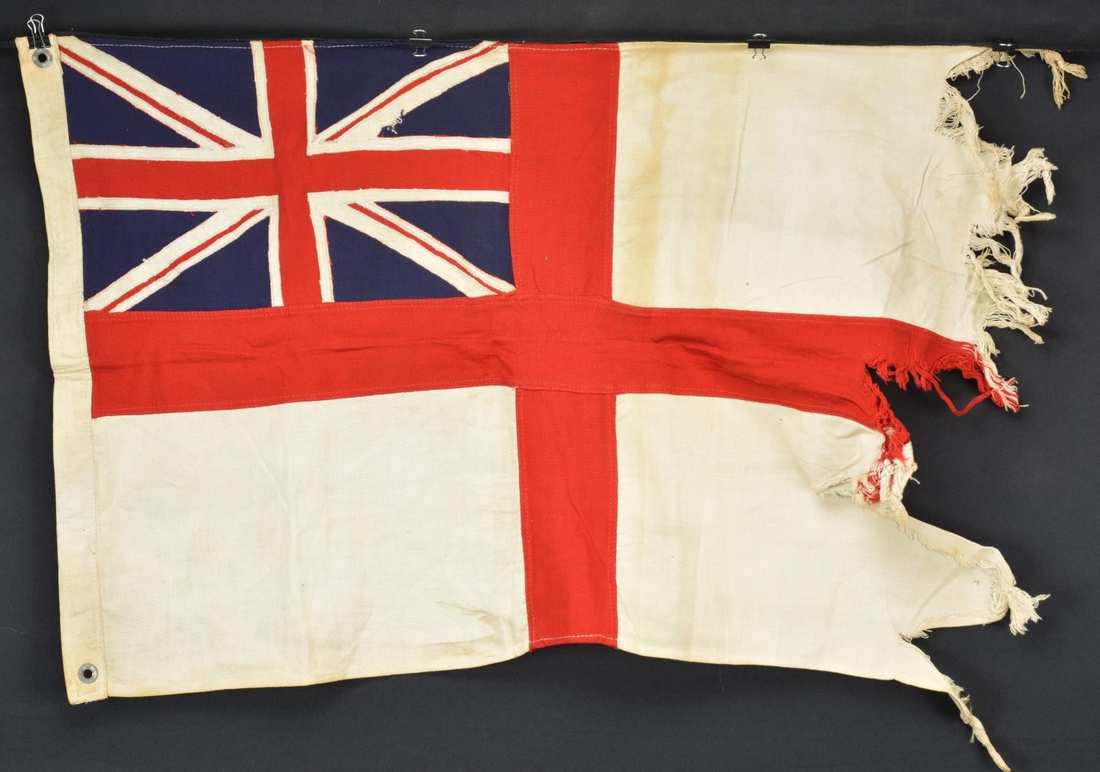 (6) 2x3’ well worn British white linen & bunting ensign with St. George cross;