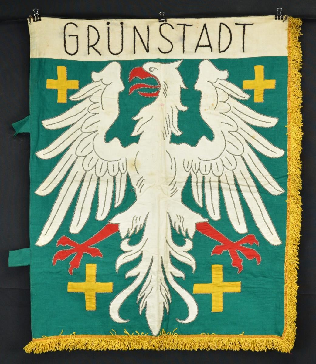 (7)30x24” double applique German Grunstadt City flag with gold fringe. CONDTION: overall good-very good. (02-17547-84/JS). $200-400.