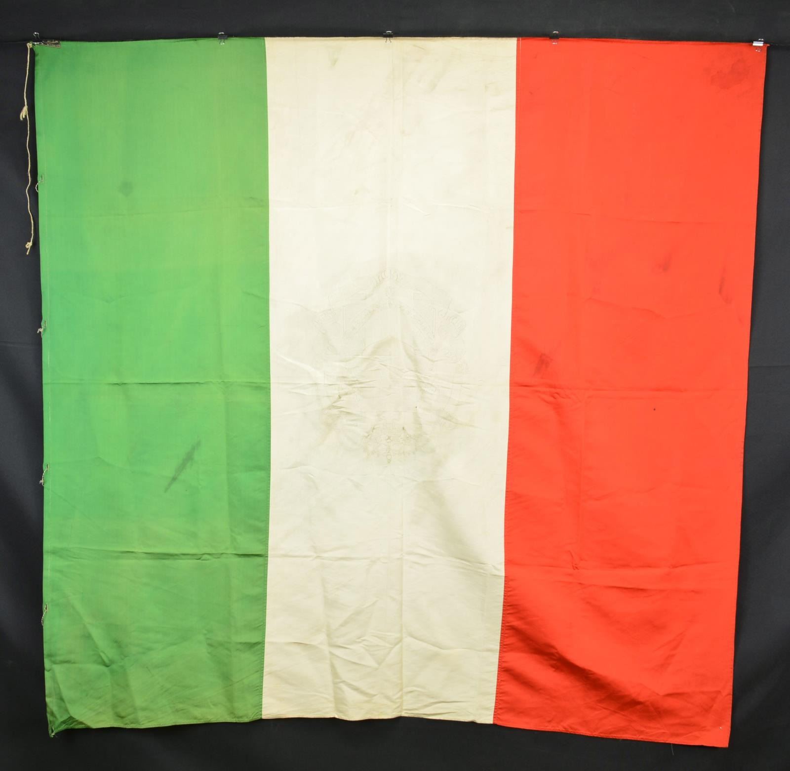 (1) 57x57” Italian green-white-red tricolor, unknown large coat of arms on white made with silver/gray thread, appears like watermark, makers label from Bologna; 60x50” & 70x46”;