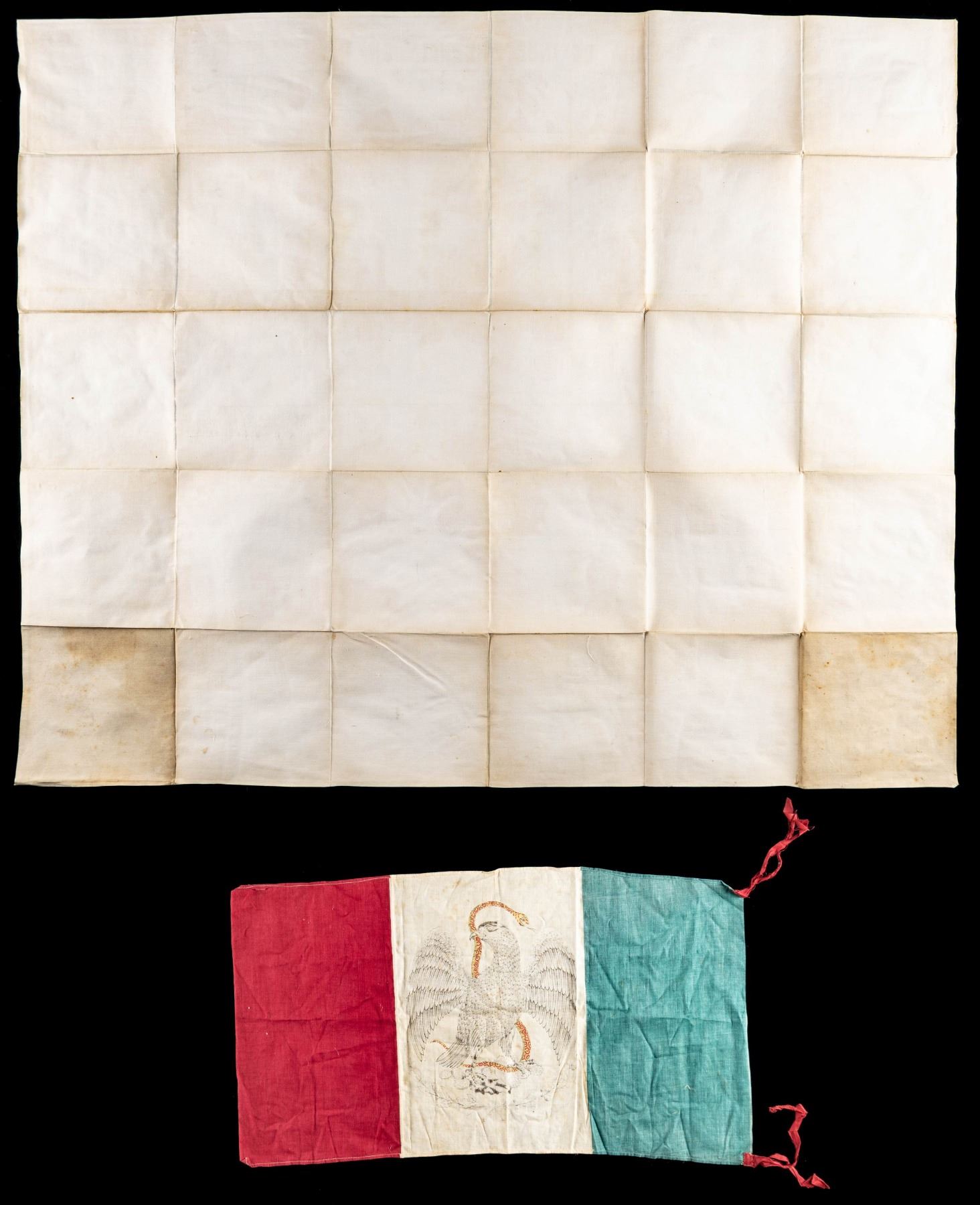 MEXICAN INDEPENDENCE BROADSIDE. Flag measures 25" x 14", printed cotton, sewn edges & 2 ties hand sewn to each corner of leading edge. The 47" x 39" pictorial of Mexican Independence was printed in Paris 1861 and mounted in squares attached to polished linen backing. CONDITION: very good overall, good colors, some edge wear on the individual squares of paper attached to backing. PROVENANCE: Estate Collection of Compton LaBauve Jr. (02-26476-6/JS). NON-GUN. $500-700.