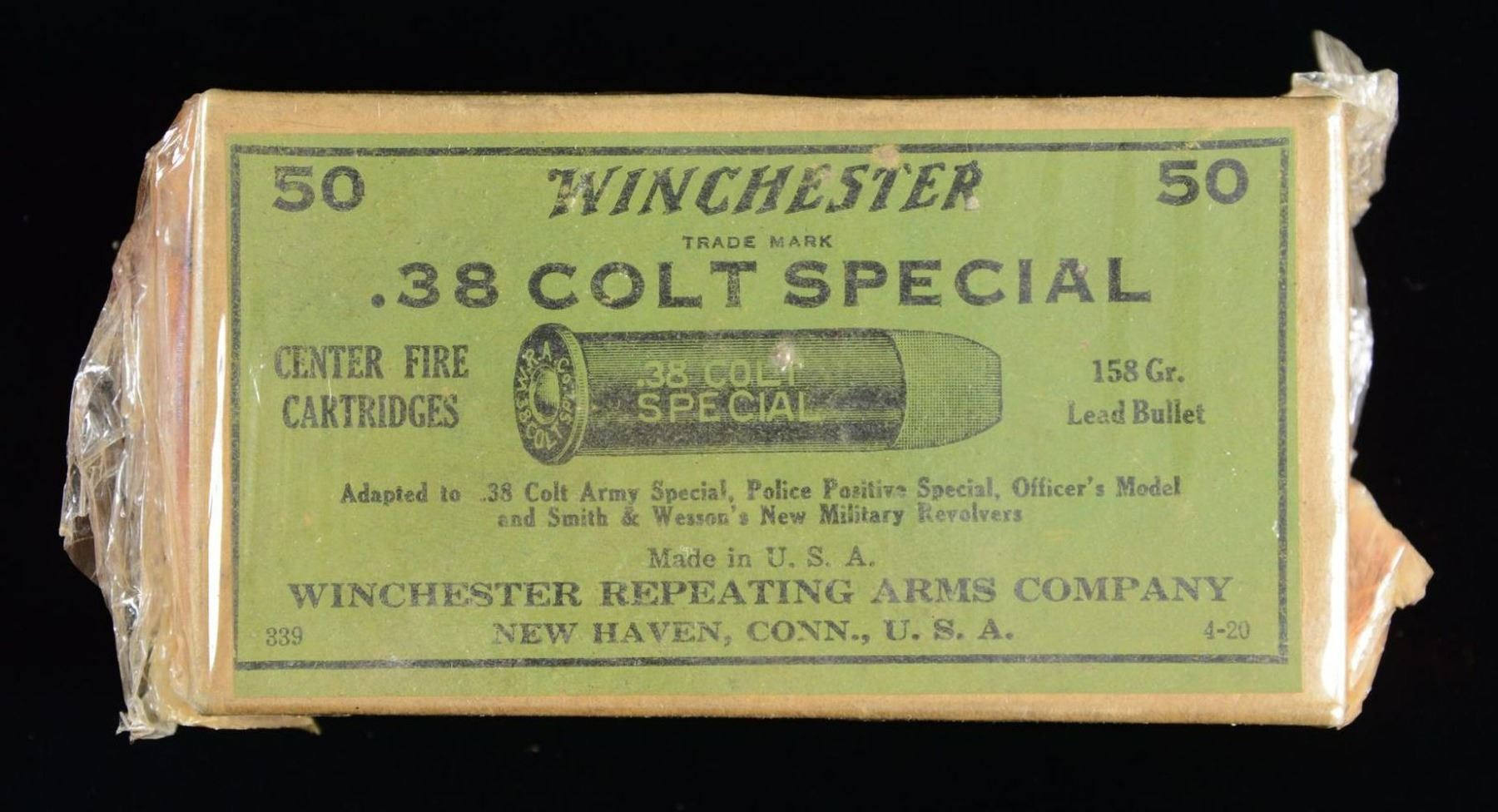 This lot consists of a sealed 50 rd box of Winchester Green Label 38 Special 158 grain ammo. The box is marked "38 COLT SPECIAL". CONDITION: very good w/ a small part of the side label missing. (02-20907/MJC). $200-300.
